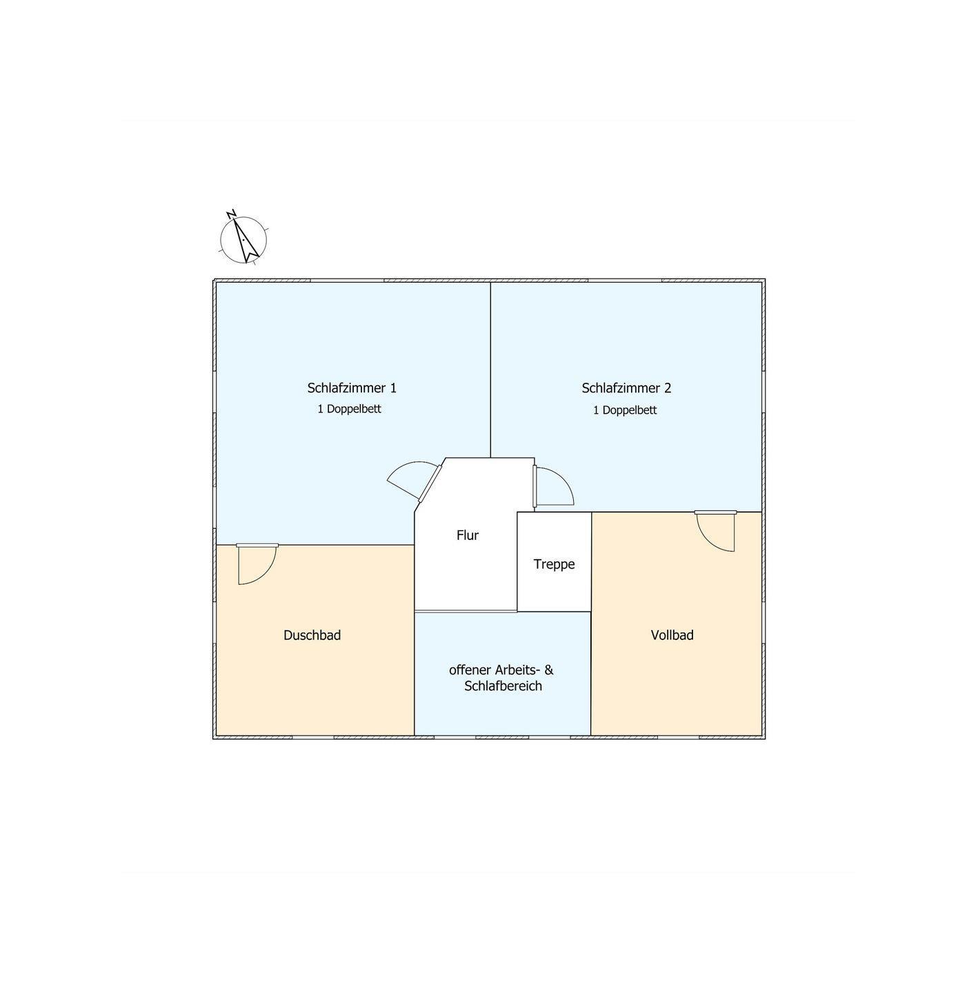 Durch die beiden Schlafräume im Obergeschoss, welche jeweils mit einem Einbaukleiderschrank sowie mit einem Smart-TV ausgestattet sind, bietet das Reethus Westerheide äußerst komfortabel Platz für bis zu vier Personen. Zwei weitere Personen finden darüber hinaus im offenen Arbeitsbereich des ersten Obergeschosses auf dem ausklappbaren Sofa eine fünfte und sechste Schlafmöglichkeit. Das Bad en Suite des zweiten Schlafzimmers ist neben einer bodengleichen Dusche auch mit einer Badewanne ausgestattet. Zusätzlich verfügen beide Bäder jeweils über ein Einbauradio im Bereich des Waschtisches.