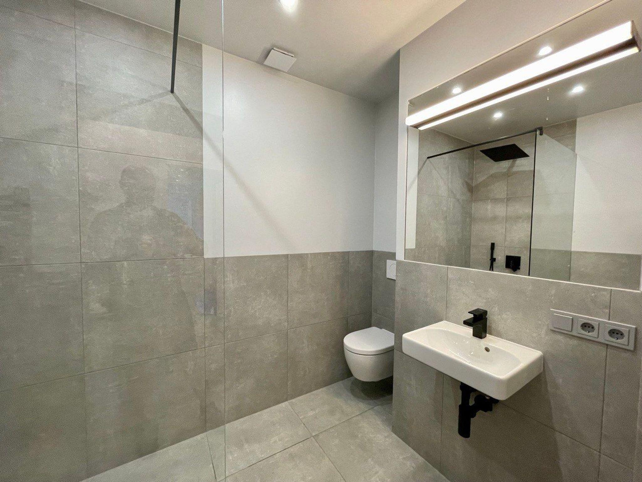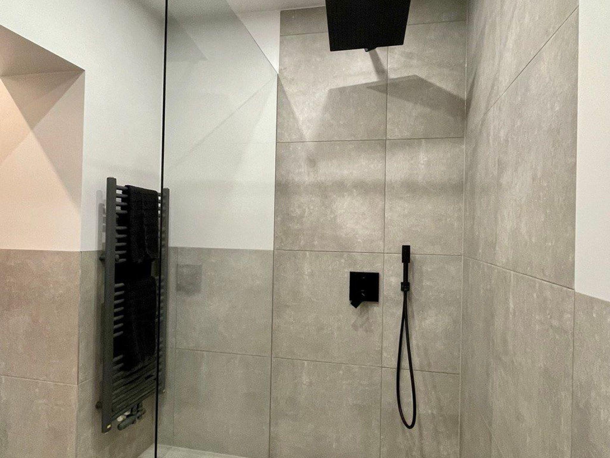 Die Wohnung verfügt über ein sehr modernes, großzügiges Vollbad mit Regendusche mit hochwertigen schwarzmatten Armaturen und Waschmaschine inkl. Trockner.