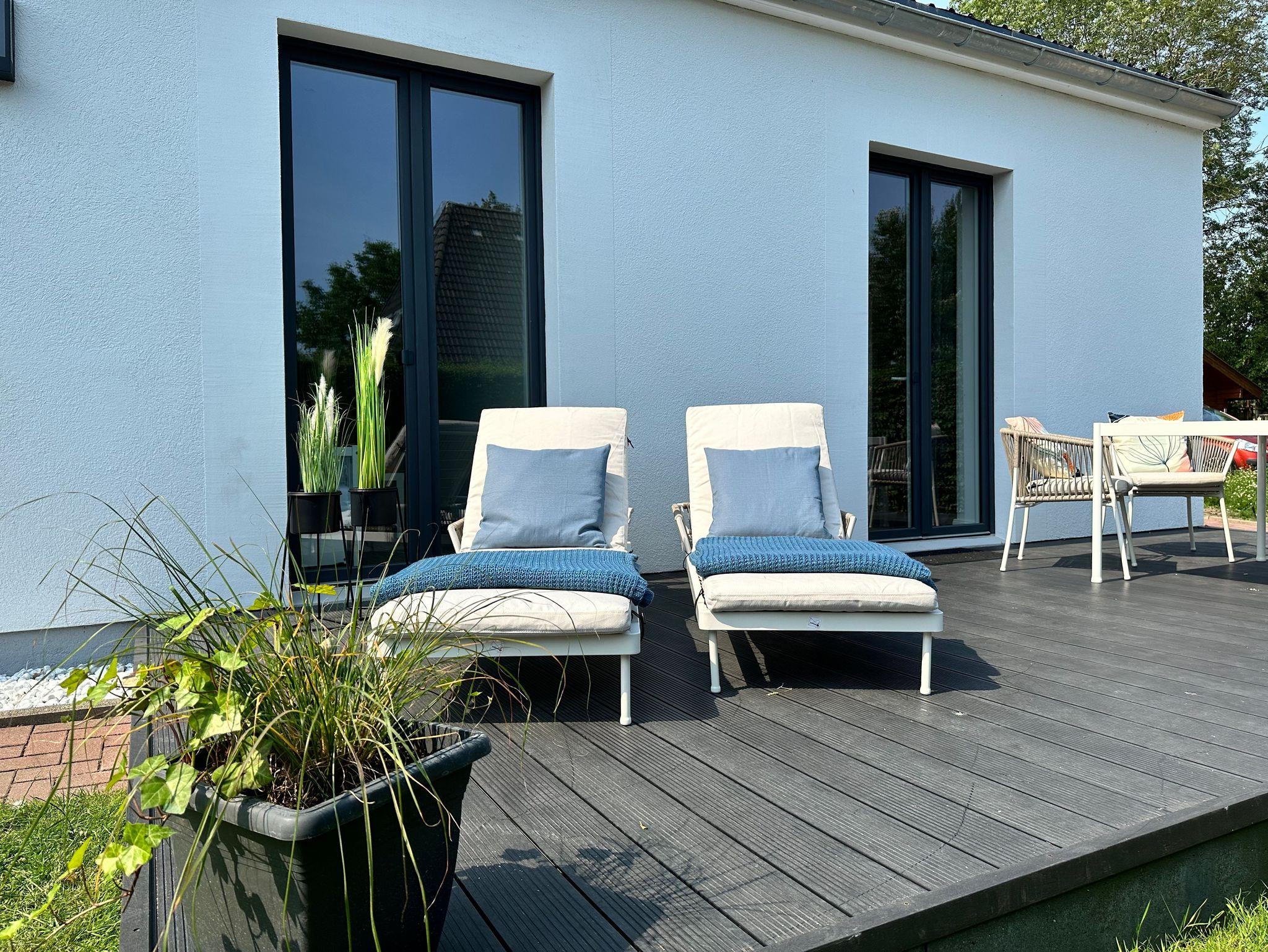 - Terrassenmöbel (Esstisch und 4 Lehnstühle) und zwei Sonnenliegen im Garten