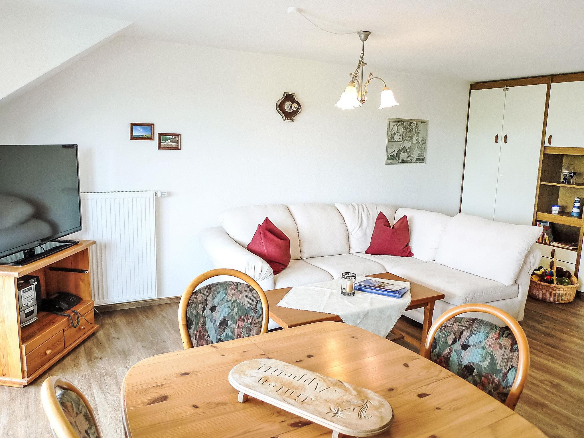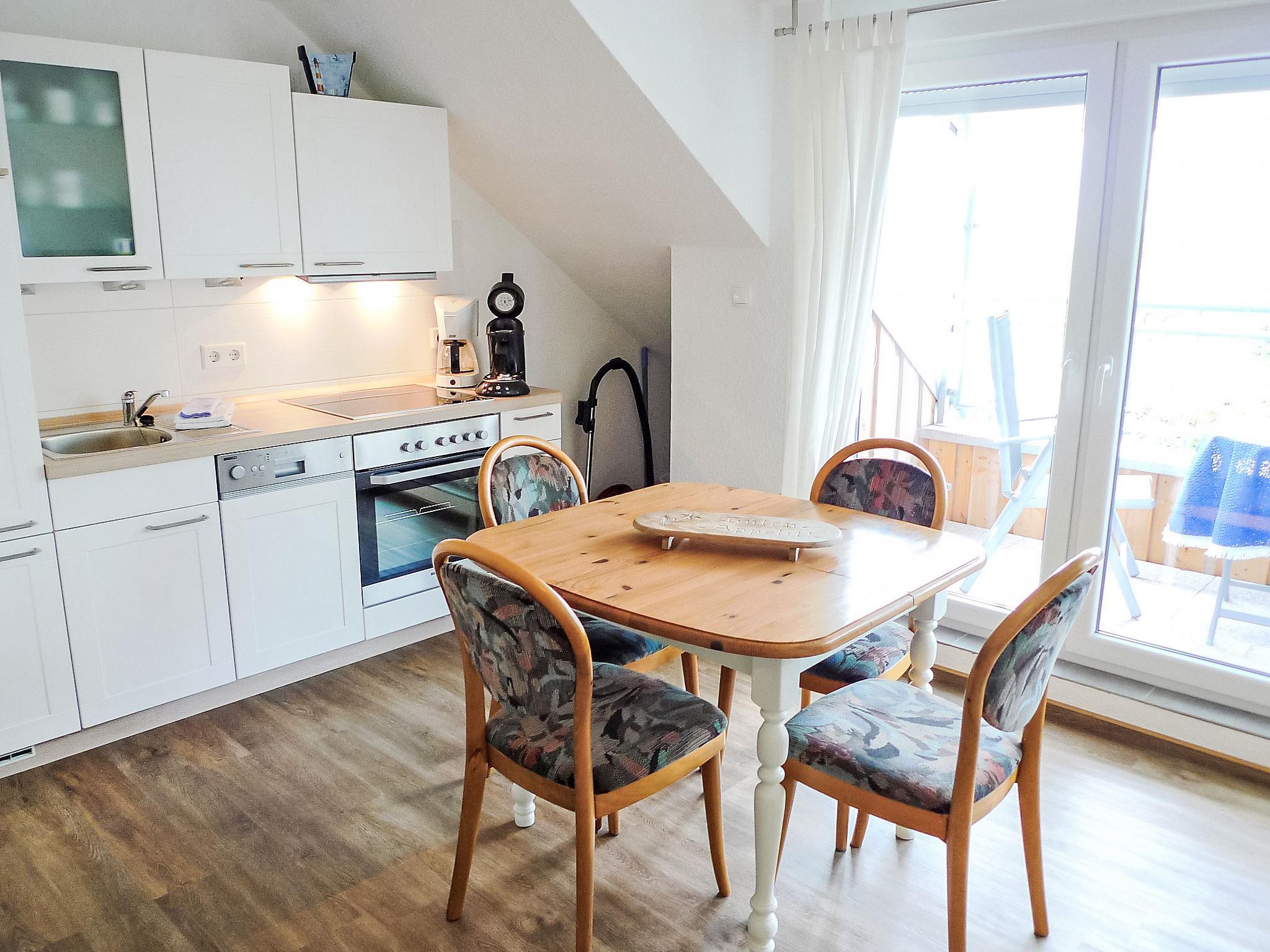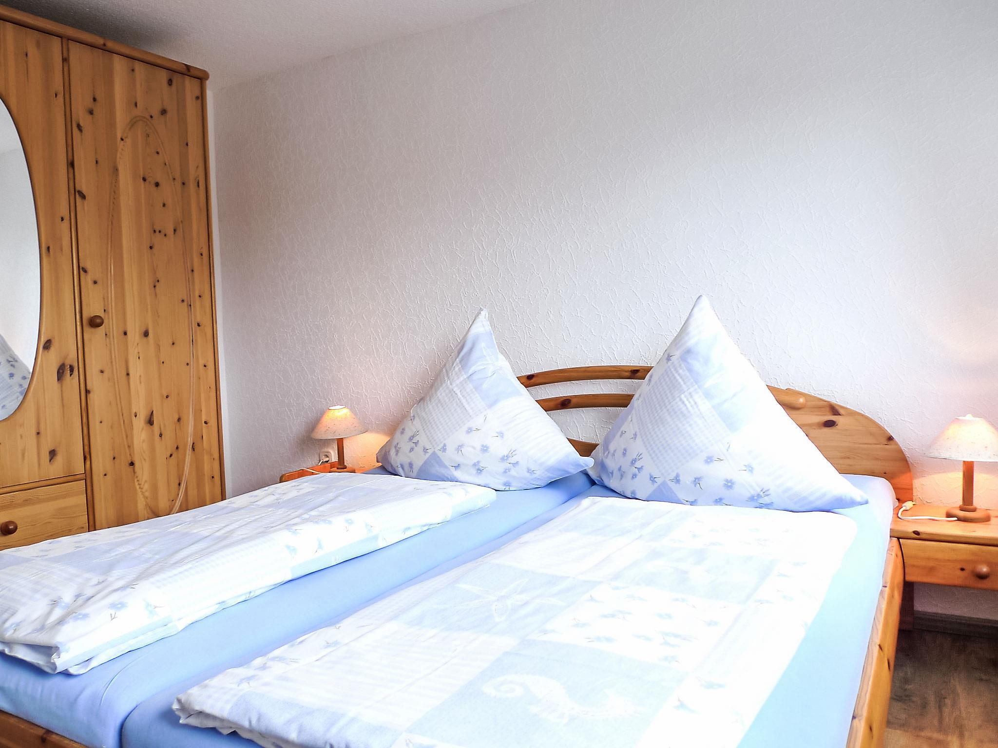 2-Zimmer-Wohnung 45 m2, im Obergeschoss. Gemütlich eingerichtet: Wohn-/Esszimmer 27 m2 mit 1 Wandschrankbett (90 cm, Länge 190 cm), Sat-TV und Stereoanlage. Ausgang zum Balkon. 1 Zimmer 11 m2 mit 1 Doppelbett (2 x 90 cm, Länge 200 cm). Kochnische (4 Kochplatten, Geschirrspüler, Toaster, Mikrowelle, elektrische Kaffeemaschine) mit Esstisch. Dusche/WC. Balkonmöbel. Zur Verfügung: Kinderhochstuhl (extra). Bitte beachten: Nichtraucher-Unterkunft. Rauchmelder.