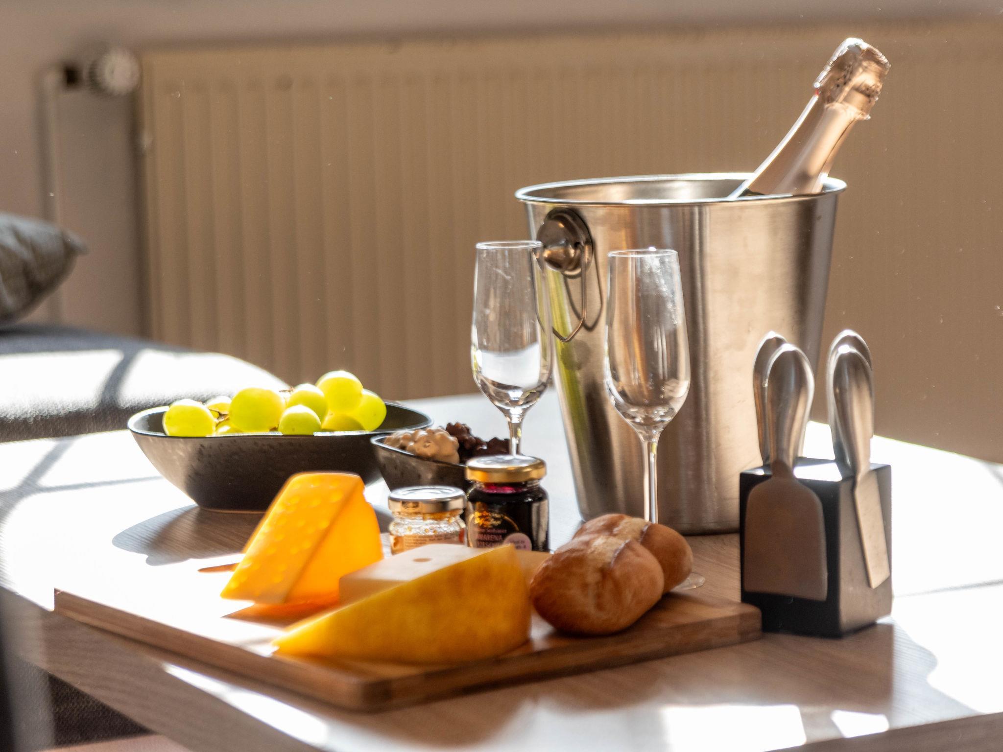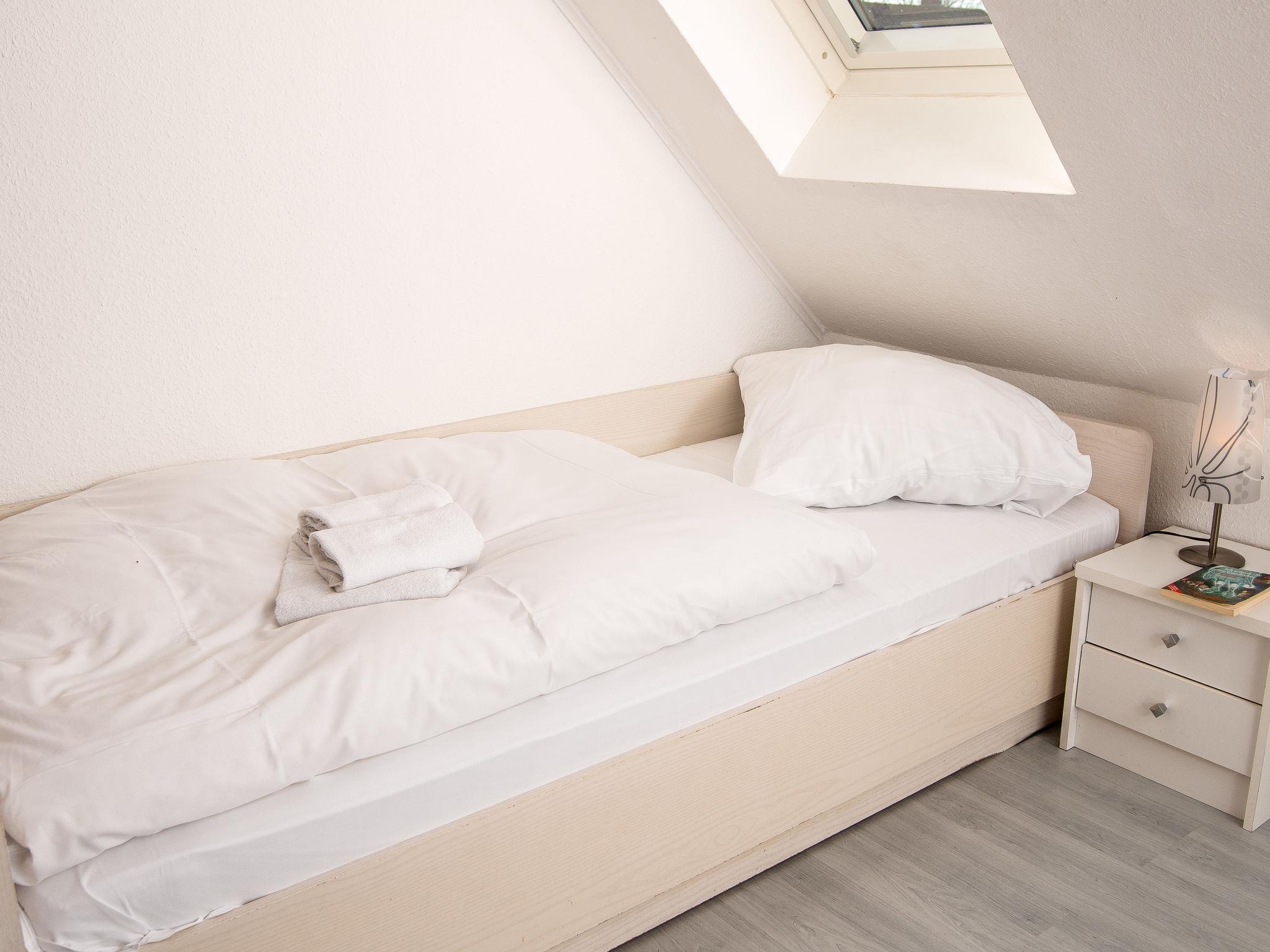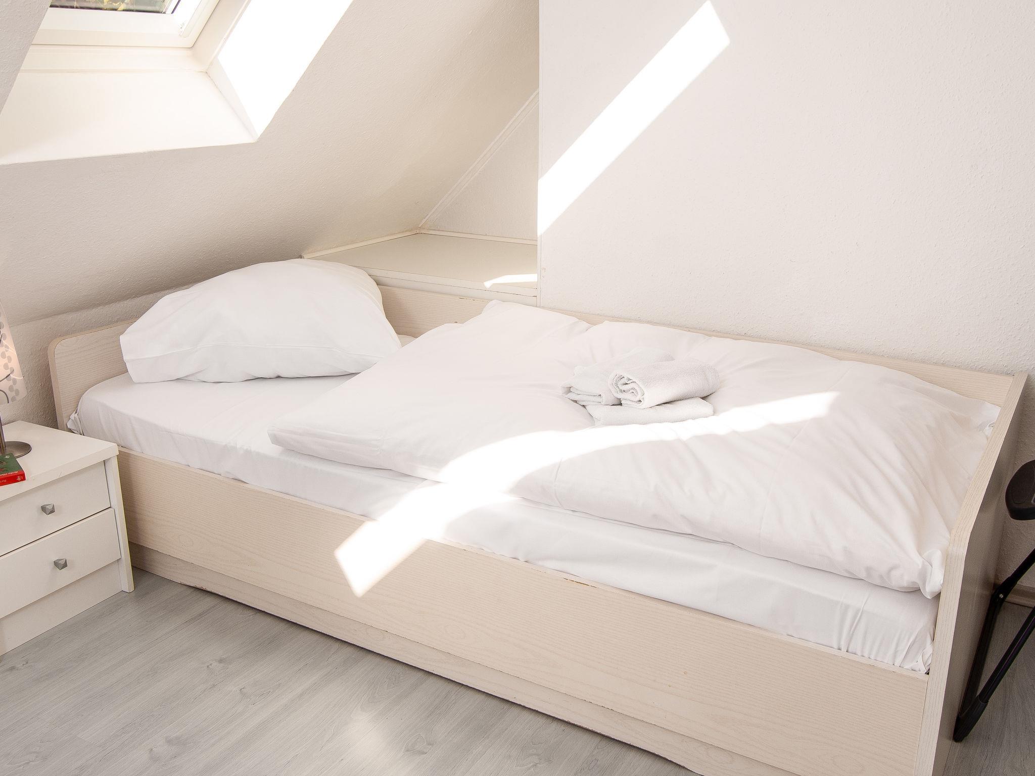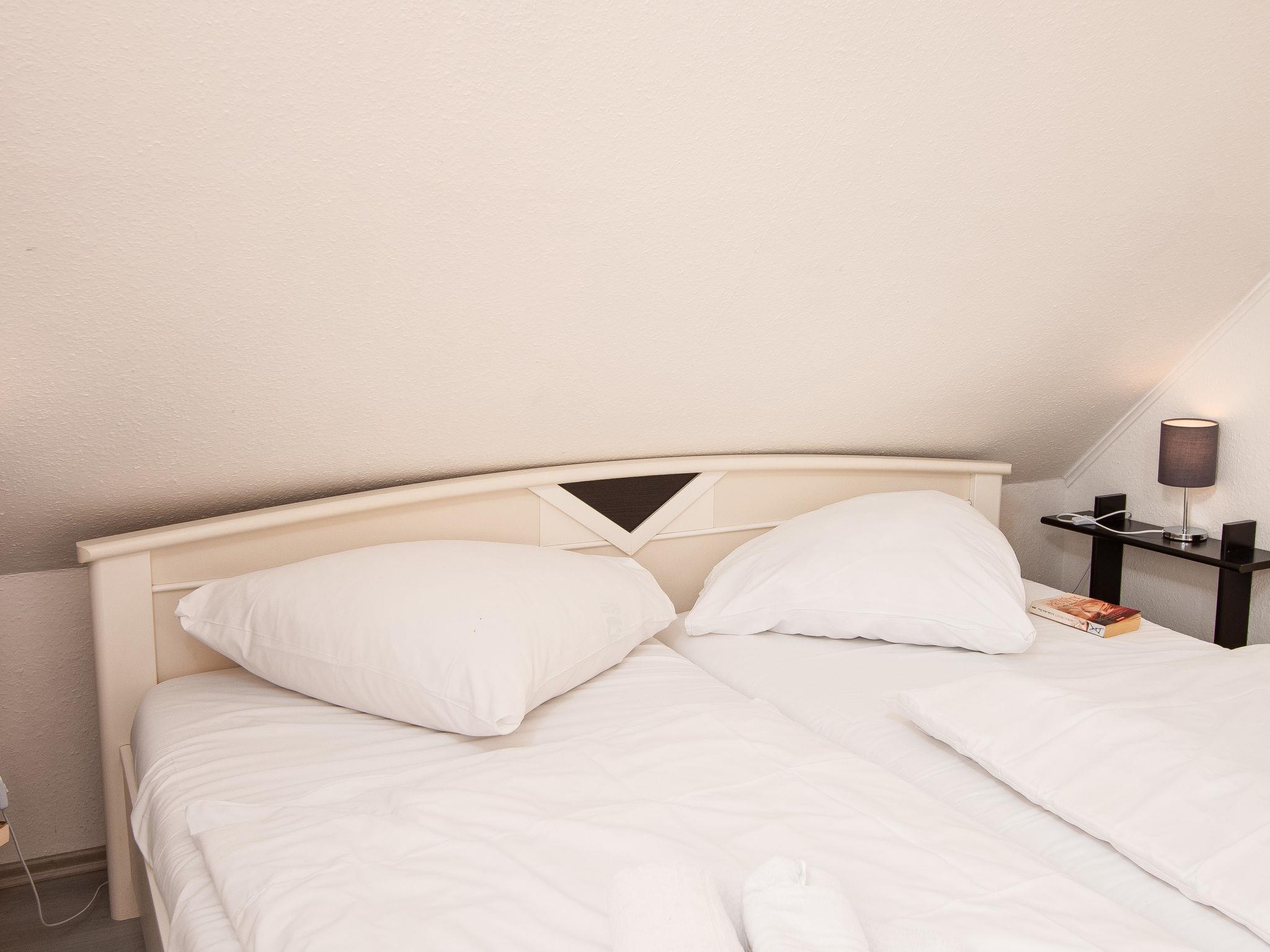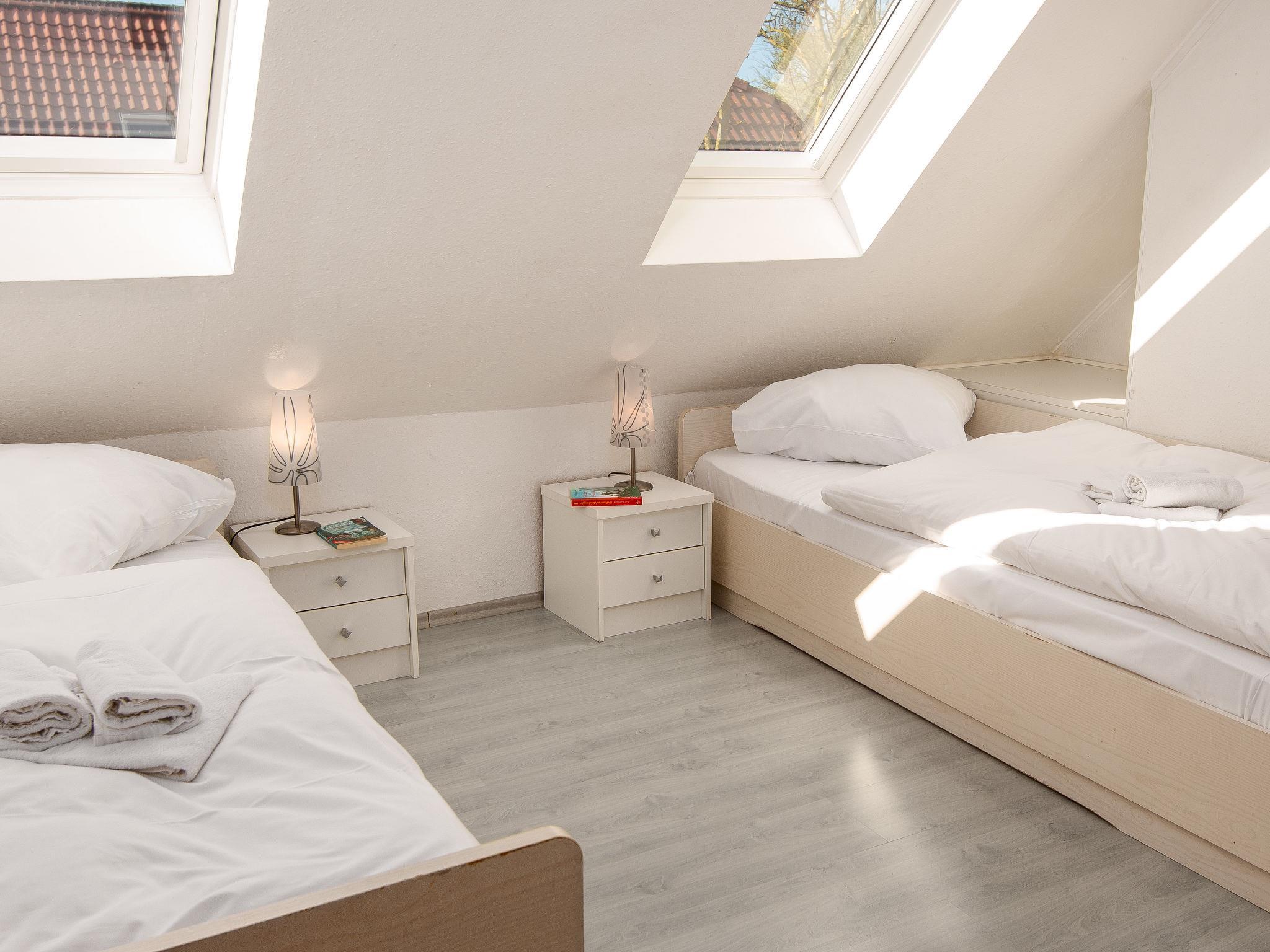 3-Zimmer-Wohnung 65 m2, im Obergeschoss. Hell, teilweise abgeschrägt, gemütlich eingerichtet: Wohn-/Esszimmer 28 m2 mit Kabel-TV (Flachbildschirm), Stereoanlage. Ausgang zum Balkon. 1 Zimmer 9 m2 mit 1 Doppelbett (2 x 100 cm, Länge 200 cm). 1 Zimmer 8 m2 mit 2 Betten (90 cm, Länge 200 cm). Kleine Kochnische (4 Kochplatten, Backofen, Geschirrspüler, Toaster, Wasserkocher, Mikrowelle, elektrische Kaffeemaschine). Dusche/WC. Balkon. Balkonmöbel. Zur Verfügung: Bügeleisen, Kinderhochstuhl (extra). Internet (WLAN, gratis). Bitte beachten: Nichtraucher-Unterkunft. Rauchmelder. DE40827