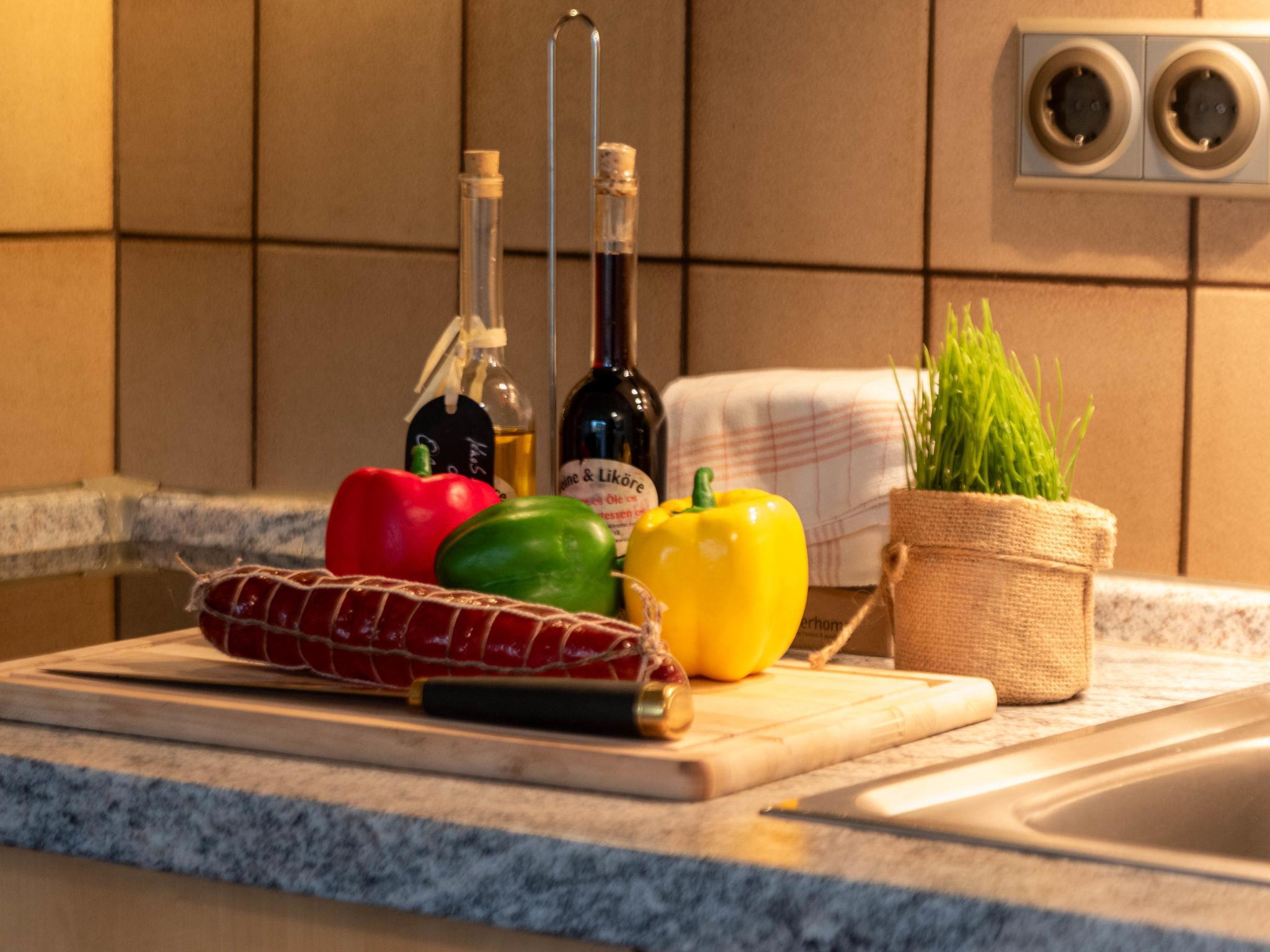 "Turmblick", 2-Zimmer-Wohnung 45 m2, im Erdgeschoss. Wohn-/Esszimmer 22 m2 mit 1 Doppeldiwanbett (140 cm, Länge 190 cm), Kabel-TV (Flachbildschirm). 1 kleines Zimmer 6 m2 mit 1 Doppelbett (2 x 80 cm, Länge 200 cm). Kochnische (2 Kochplatten, Toaster, Wasserkocher, Mikrowelle, elektrische Kaffeemaschine). Dusche/WC. Terrasse. Terrassenmöbel. Zur Verfügung: Kinderhochstuhl (extra). Internet (WLAN, gratis). Bitte beachten: Nichtraucher-Unterkunft. Duschstuhl vorhanden.