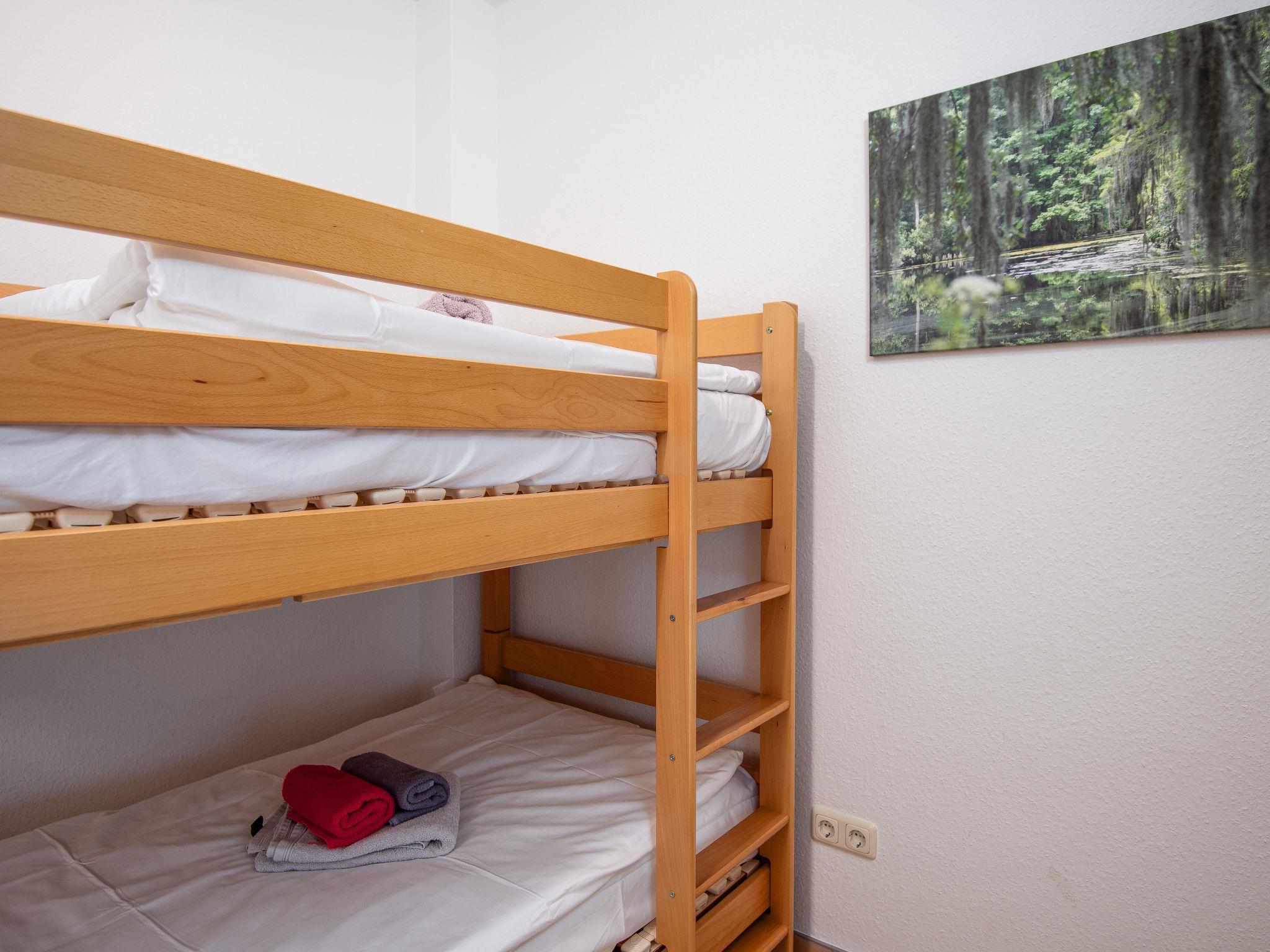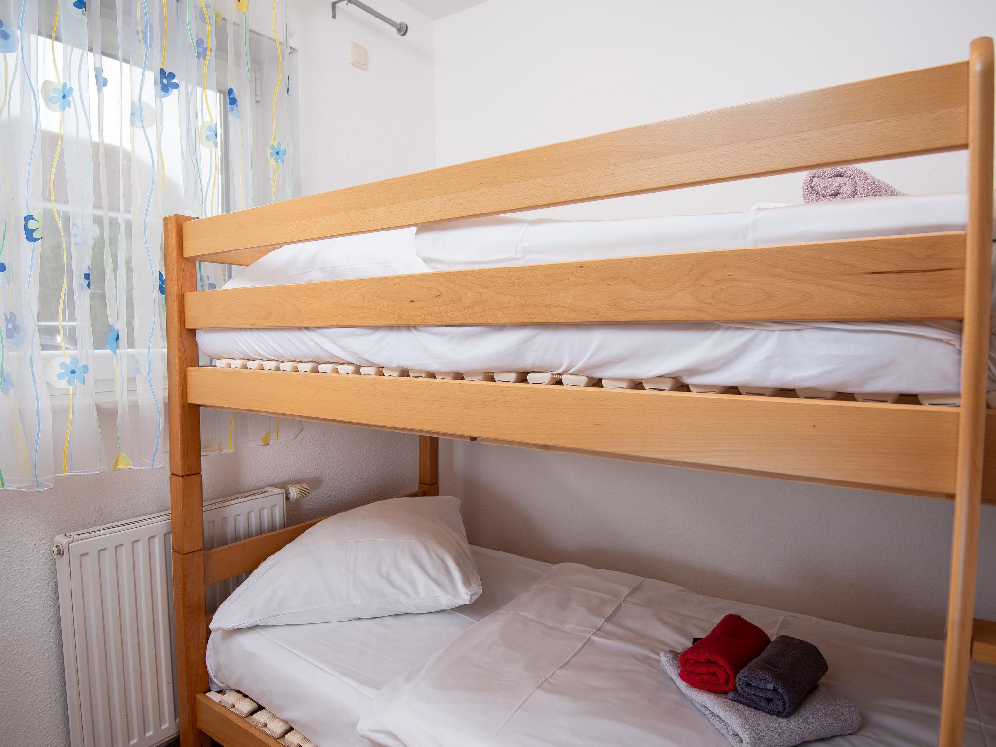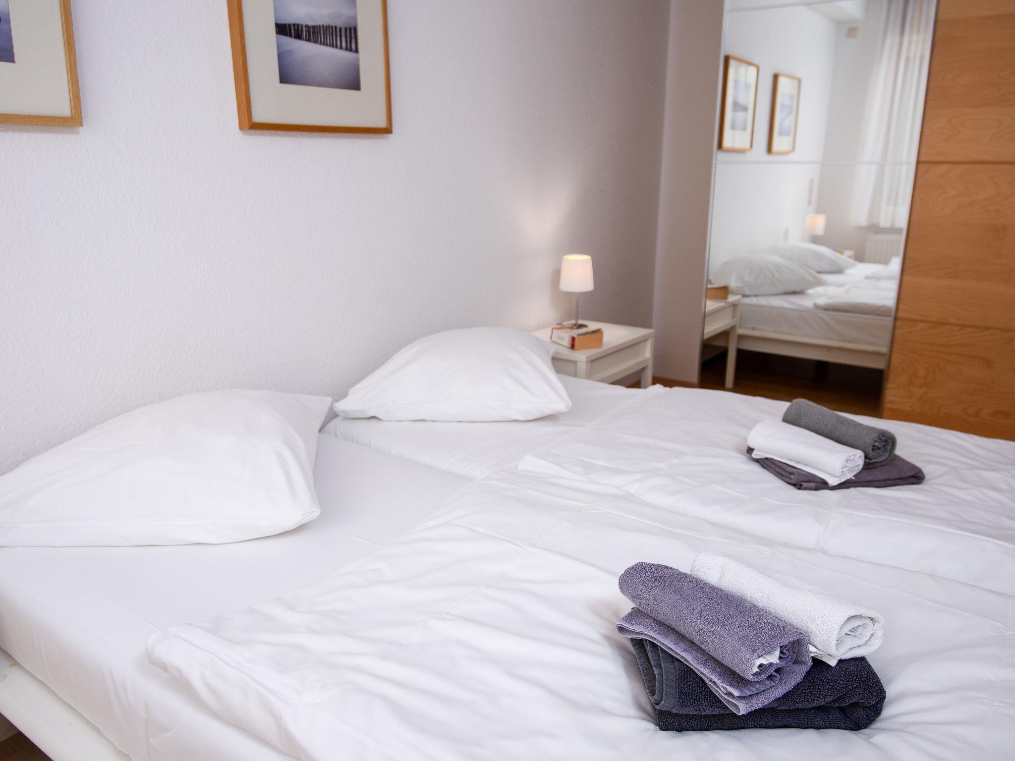 3-Zimmer-Wohnung 65 m2, im Erdgeschoss. Geschmackvoll und gemütlich eingerichtet: Wohn-/Esszimmer mit Sat-TV (Flachbildschirm), Radio, DVD und elektrischem Rollladen. Ausgang zur Terrasse. 1 Zimmer mit 1 Doppelbett (2 x 90 cm, Länge 200 cm). 1 Zimmer mit 1 x 2 Etagenbetten (90 cm, Länge 200 cm). Kochnische (Backofen, Geschirrspüler, 4 Glaskeramikplatten, Toaster, Wasserkocher, Mikrowelle, elektrische Kaffeemaschine, Kapseln für die Kaffeemaschine (Senseo) extra). Dusche/WC, sep. WC. Terrassenmöbel, Gartengrill (mobil). Zur Verfügung: Waschmaschine, Kinderhochstuhl (extra). Internet (Wireless LAN, gratis). Bitte beachten: Nichtraucher-Unterkunft. Rauchmelder.