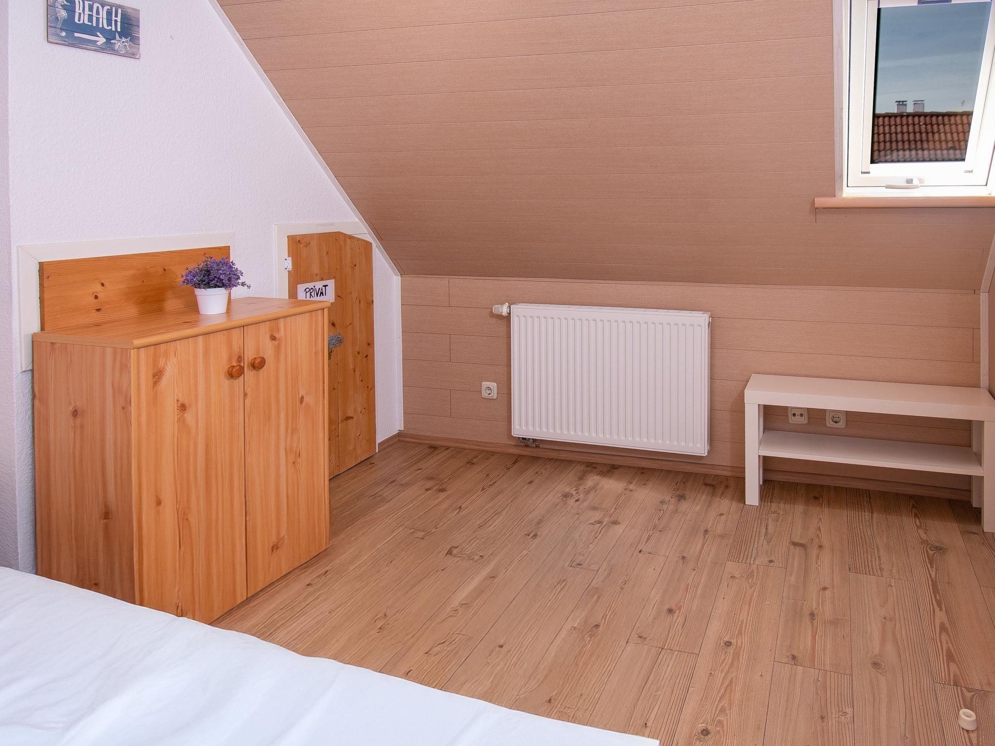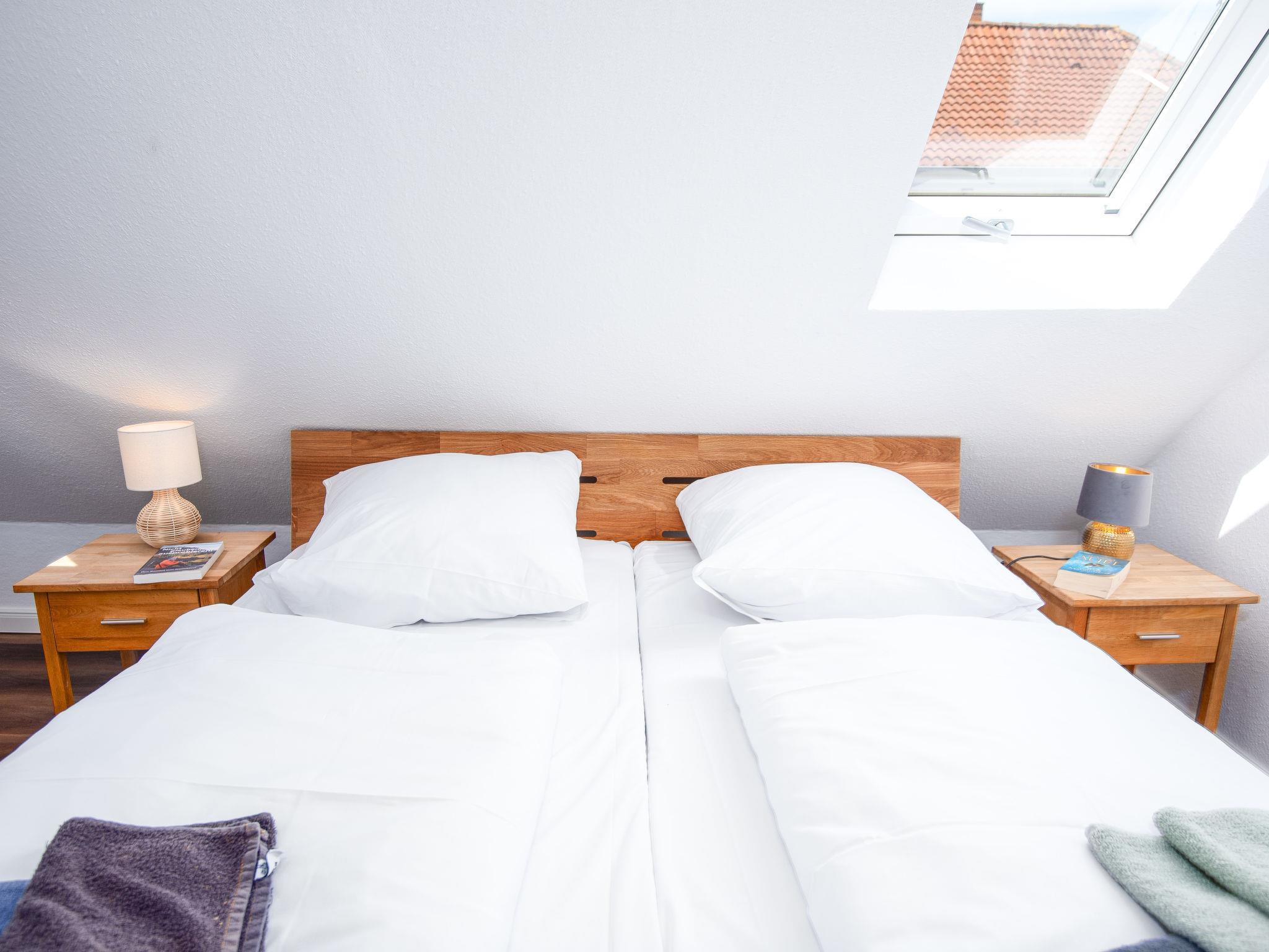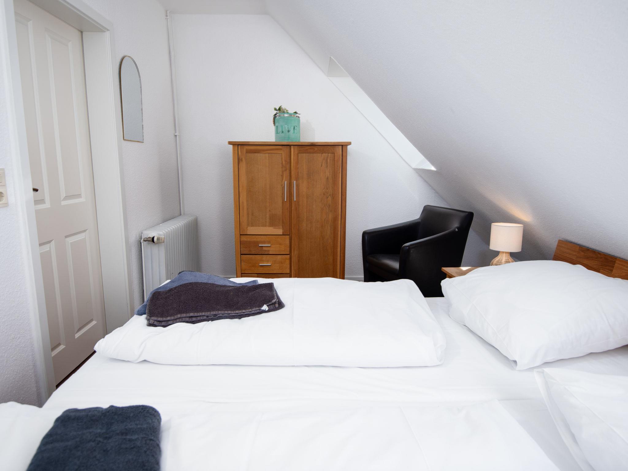 "Scholle", 3-Zimmer-Wohnung 45 m2 auf 2 Stockwerken im 1. Stock. Gemütlich eingerichtet: Wohn-/Esszimmer 18 m2 mit Sat-TV (Flachbildschirm), Stereoanlage und DVD. 1 Zimmer 8 m2 mit 1 Doppelbett (160 cm, Länge 200 cm). Kochnische (Backofen, 4 Glaskeramikplatten, Toaster, Wasserkocher, Tiefkühler, elektrische Kaffeemaschine). Dusche/WC. Dachgeschoss: (steile Treppe) 1 abgeschrägtes Zimmer 8 m2 mit 1 Doppelbett (160 cm, Länge 200 cm). Kleiner Balkon 4 m2. Balkonmöbel. Zur Verfügung: Kinderhochstuhl (extra). Internet (Wireless LAN, gratis). Bitte beachten: Nichtraucher-Unterkunft. Rauchmelder. Die Schlafzimmer verfügen über Verdunklungsrollos.