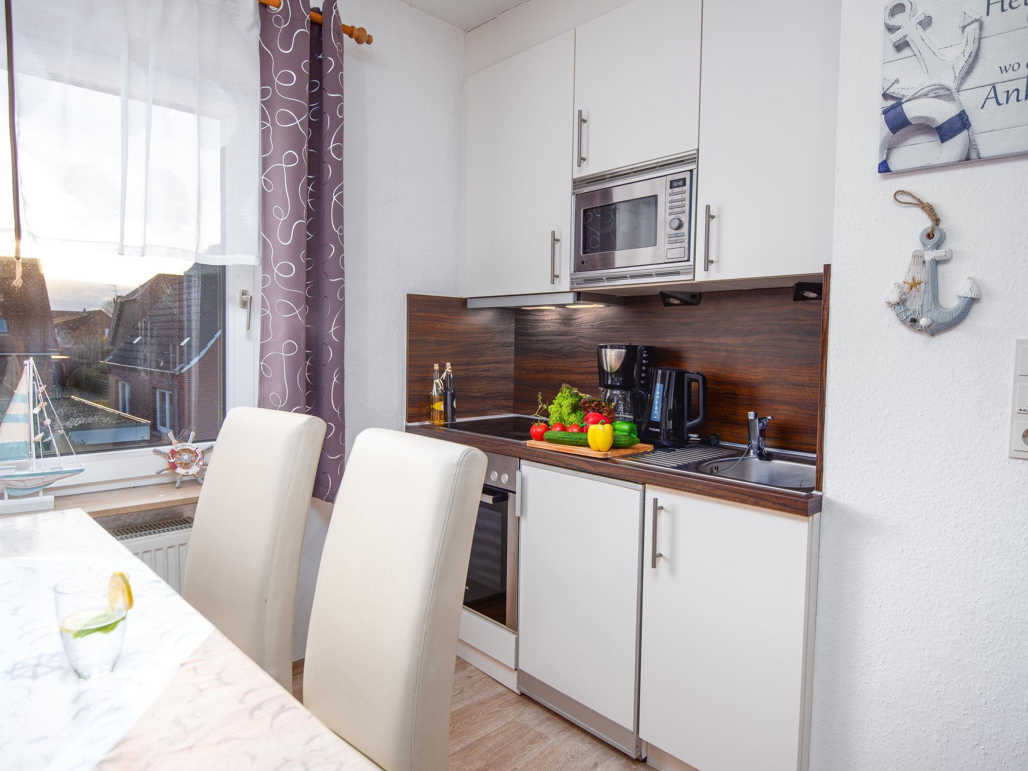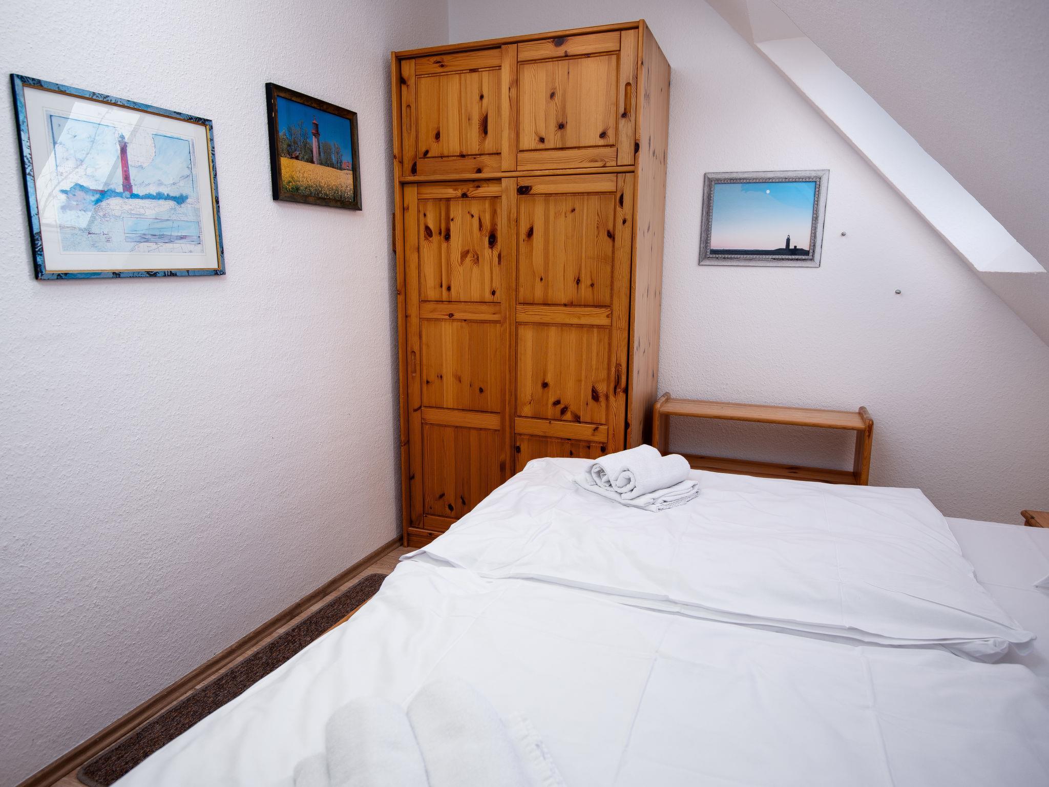 "Blinkfeuer", 2-Zimmer-Wohnung 40 m2, im Obergeschoss. Schön und gemütlich eingerichtet: Wohn-/Esszimmer 18 m2 mit 1 Doppeldiwanbett (1 x 170 cm, Länge 200 cm), Sat-TV (Flachbildschirm), CD und DVD. 1 abgeschrägtes Zimmer 7 m2 mit 1 Doppelbett (2 x 90 cm, Länge 200 cm). Kochnische (Backofen, 4 Glaskeramikplatten, Toaster, Wasserkocher, Mikrowelle, Tiefkühler, elektrische Kaffeemaschine) mit Esstisch. Dusche/WC. Kleiner Balkon. Balkonmöbel. Zur Verfügung: Kinderhochstuhl (extra). Internet (Wireless LAN, gratis). Bitte beachten: Nichtraucher-Unterkunft. Maximal 1 Haustier/Hund erlaubt. Rauchmelder.