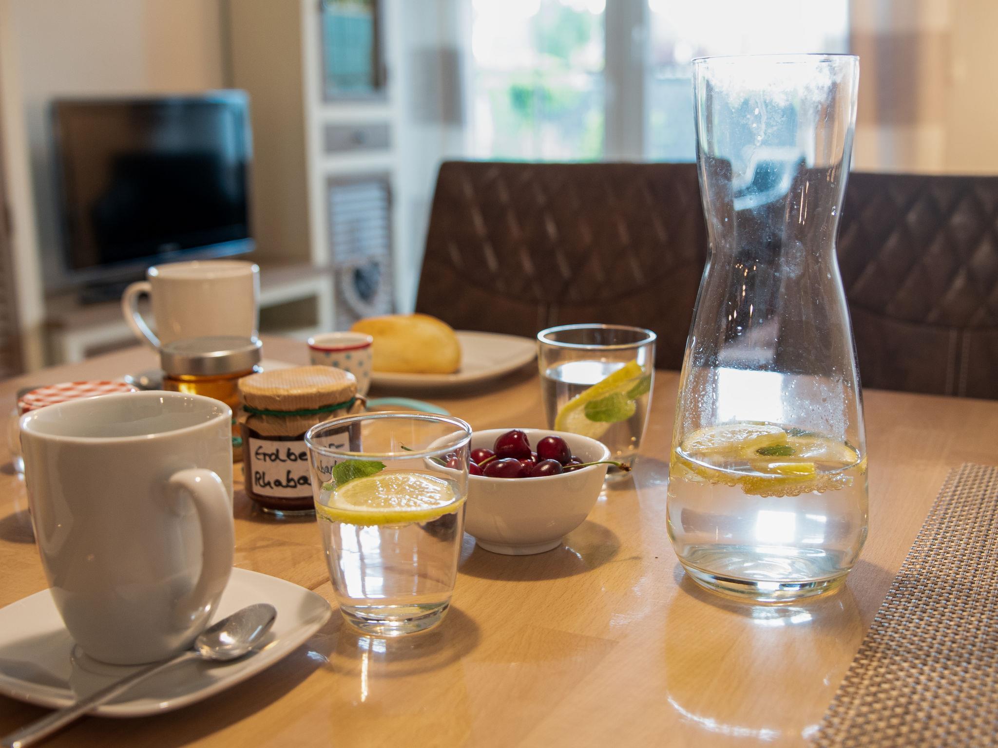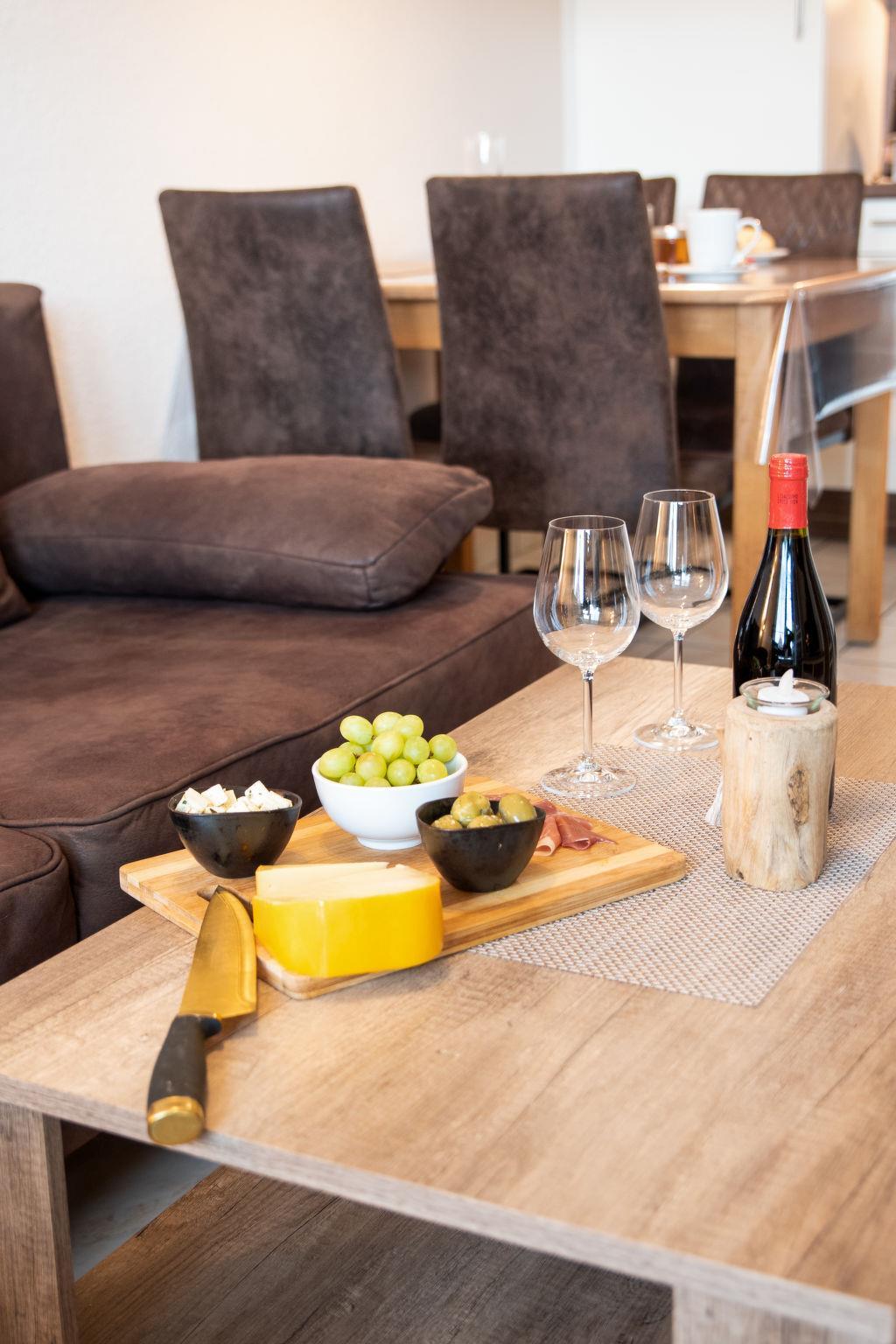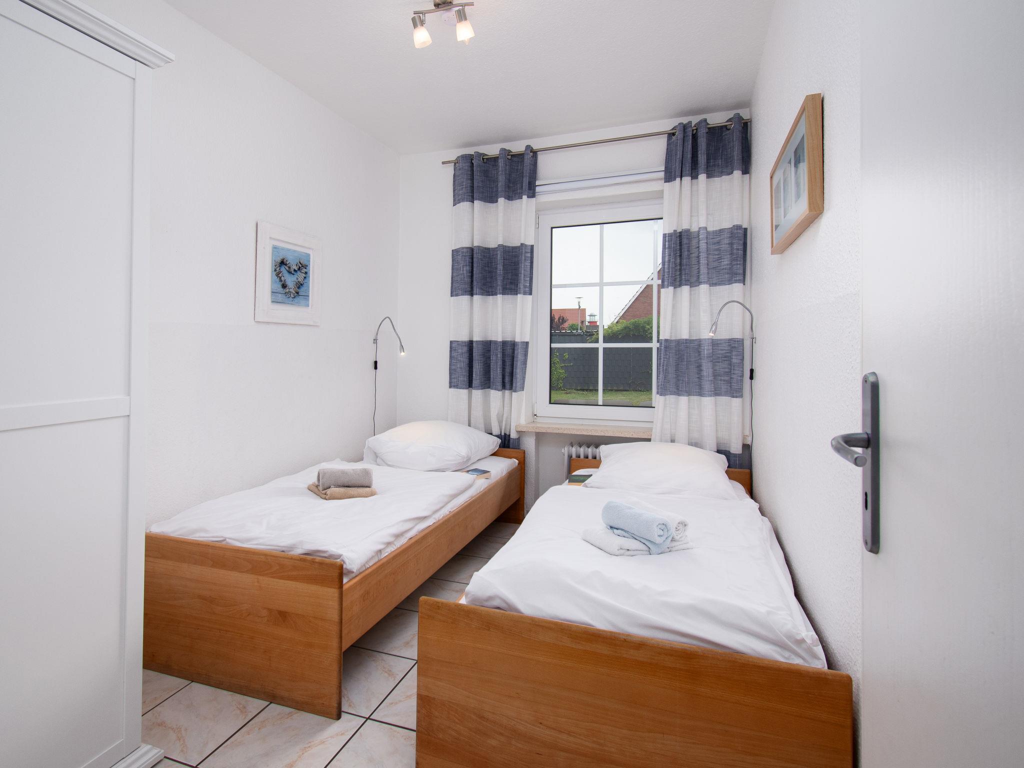 "Seestern", 3-Zimmer-Wohnung 50 m2, im Erdgeschoss. Gemütlich eingerichtet: Wohn-/Esszimmer mit Sat-TV (Flachbildschirm), Stereoanlage. 1 Zimmer mit 1 Doppelbett (2 x 90 cm, Länge 190 cm). 1 Zimmer mit 2 Betten (90 cm, Länge 200 cm). Kochnische (4 Kochplatten, Backofen, Geschirrspüler, Mikrowelle, elektrische Kaffeemaschine, Kapseln für die Kaffeemaschine (Senseo) extra) mit Esstisch. Dusche/WC. Terrasse 14 m2, Rasen. Terrassenmöbel. Zur Verfügung: Kinderhochstuhl (extra). Internet (Wireless LAN, gratis). Bitte beachten: Kühlschrank ohne Gefrierfach, Nichtraucher-Unterkunft. Maximal 1 Haustier/Hund erlaubt. Rauchmelder.