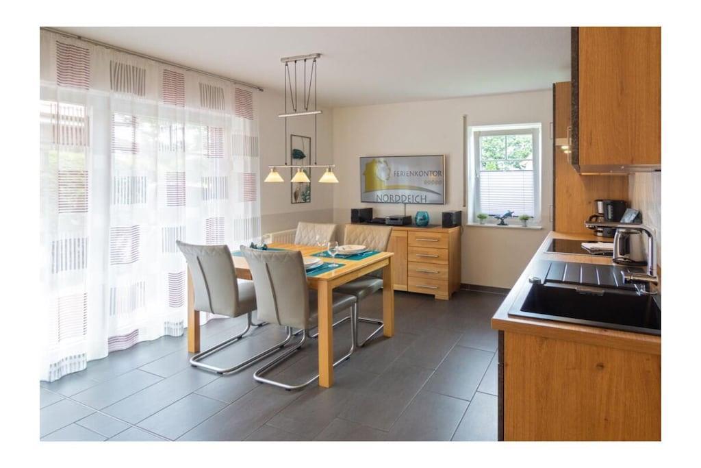 Die Ferienwohnung Meeresoase in Norddeich bietet stilvollen Komfort mit gemütlicher Terrasse und moderner Ausstattung.