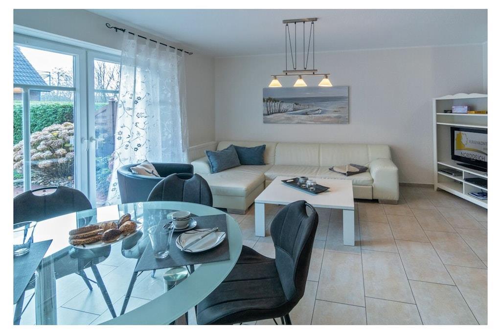 Moderne Ferienwohnung Leuchtfeuer 1 in zentraler, ruhiger Lage von Norddeich mit Garten, Terrasse und hochwertiger Ausstattung.