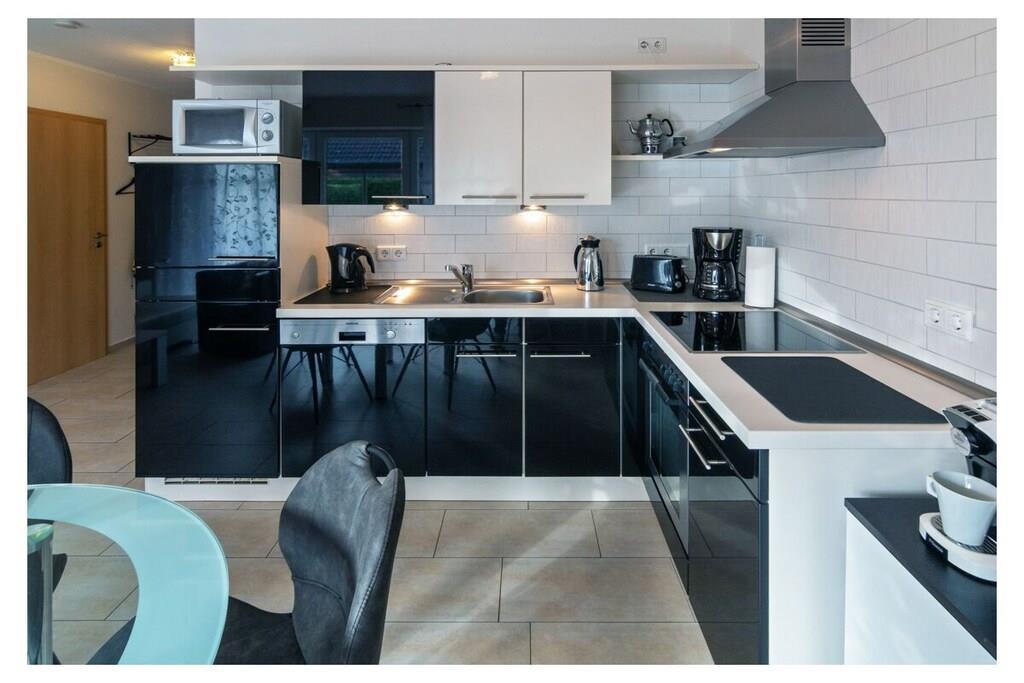 Ferienwohnung Leuchtfeuer 1 Frisiastr. 5a Ein Aufenthalt in dieser schönen und hellen Ferienwohnung verspricht ungetrübte Urlaubsfreuden. Das Apartment befindet sich in zentraler Lage Norddeichs. Die regionalen Freizeitangebote, Gastronomie und zahlreichen Geschäfte sind in wenigen Gehminuten zu erreichen. Mitten im Geschehen, genießen Sie jedoch gleichzeitig absolute Ruhe, denn das Apartmenthaus befindet sich in einer ruhigen Seitenstraße, in der es kein Verkehrsaufkommen gibt. So können Sie alle Vorteile Ihres Norddeich-Urlaubes – Erholung und Freizeitvergnüngen – in vollen Zügen genießen. Die Wohnungen Leuchtfeuer 1 und Leuchtfeuer 2 eignen sich hervorragend für einen Familienurlaub, die Wohnungen liegen übereinander und verfügen über einen gemeinsamen Eingangsbereich. Die Ferienwohnung Die sehr helle und freundliche Ferienwohnung bietet Platz für zwei Personen. Bei der Einrichtung wurde sehr viel Wert auf ein gemütliches Ambiente gelegt. Gleichzeitig mutet die Farbgestaltung in Schwarz-Weiß und die sparsam, dafür gezielt ausgewählte Dekoration sehr modern an. Die gesamte Wohnung wurde mit modernen und praktischen Fliesen ausgelegt. Das Herzstück Ihres Feriendomizils bildet der Wohn- und Essbereich mit integrierter Einbauküche. Hier finden Sie sich zusammen, sei es, um in der bequemen Sofaecke vor dem TV auszuspannen, sich in Ruhe zu unterhalten, in der modern ausgestatteten Küche gemeinsam zu kochen oder an dem Esstisch in gemütlicher Zweisamkeit zu essen. Der TV-Bereich ist mit einem DVD- sowie Blueray-Player ausgestattet, Ihren gemütlichen Fernsehabenden steht also nichts im Weg. Zudem befindet sich hier der Zugang zum Garten. Mit seiner südöstlichen Ausrichtung bietet er Ihnen Gelegenheit, an schönen Tagen den Sonnenaufgang zu genießen und so den Tag gebührend zu beginnen. Für Gemütlichkeit sorgt hier die integrierte Sitzgruppe. Der Strandkorb sorgt für echtes Nordsee-Flair. Ein Holzkohlegrill steht ebenfalls zur Verfügung. Die Einbauküche ist mit allem, was es für gemeinsames Kochen braucht, ausgestattet. So finden Sie hier einen Herd mit Backofen, eine moderne Kaffeepadmaschine, einen Kühlschrank, eine Mikrowelle, einen in der Küchenzeile integrierten Geschirrspüler, einen Toaster, einen Eierkocher sowie selbstverständlich ausreichend Geschirr, Gläser, Becher und Besteck. Die Mahlzeiten werden an dem schönen Esstisch eingenommen. Hier können Sie auch für Spieleabende oder andere gesellige Gelegenheiten zusammenkommen. Das Apartment verfügt über ein Schlafzimmer mit einem 180 x 200 cm großen Bett. Genügend Platz für die mitgebrachte Garderobe bietet Ihnen der Kleiderschrank. Ein praktischer Herrendiener sowie eine geräumige Kommode runden die Ausstattung dieses Raumes ab. Das Badezimmer ist besonders komfortabel ausgestattet und verfügt über eine bodennahe Eckdusche, ein WC und eine Waschkombination mit Spiegel. Ein Duschhocker und ein Fön werden zur Verfügung gestellt. Zudem steht hier eine Wasch- und Trockenkombination im Abstellraum zu Ihrem Komfort bereit. Die Wohnung lässt sich mit Rollläden verdunkeln und bietet somit optimalen Sichtschutz. Teilweise befinden sich praktische Fliegengitter an den Fenstern. Ein Parkplatz für Ihr PKW steht Ihnen direkt am Haus zur Verfügung. Die Wohnungen verfügen über einen abschließbaren Schuppen mit Stromanschluss zur sicheren Unterbringung von E-Bikes und Fahrrädern. Für den sorgenfreien Start in den Urlaub buchen Sie unser Wäschepaket. Dieses besteht aus Bettwäsche, Handtüchern sowie Duschvorleger, Geschirrhandtüchern und einem Serviceset ( Toi-Papier, Spülmaschinentabs, Müllbeutel, Spülbürste, Putzlappen und sonstigen kleinen Helfern) für den sorglosen Start Ihres Urlaubes.