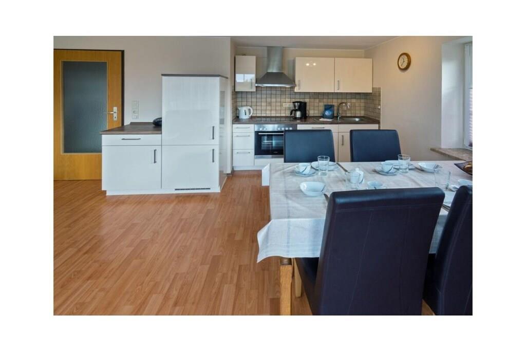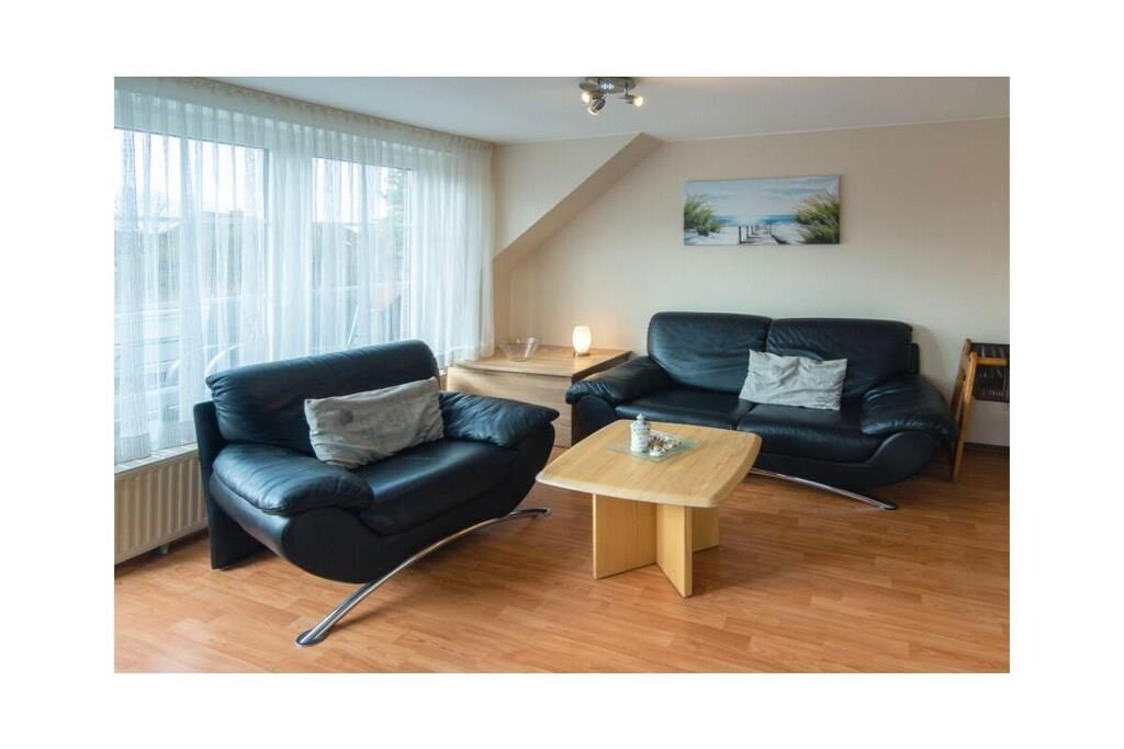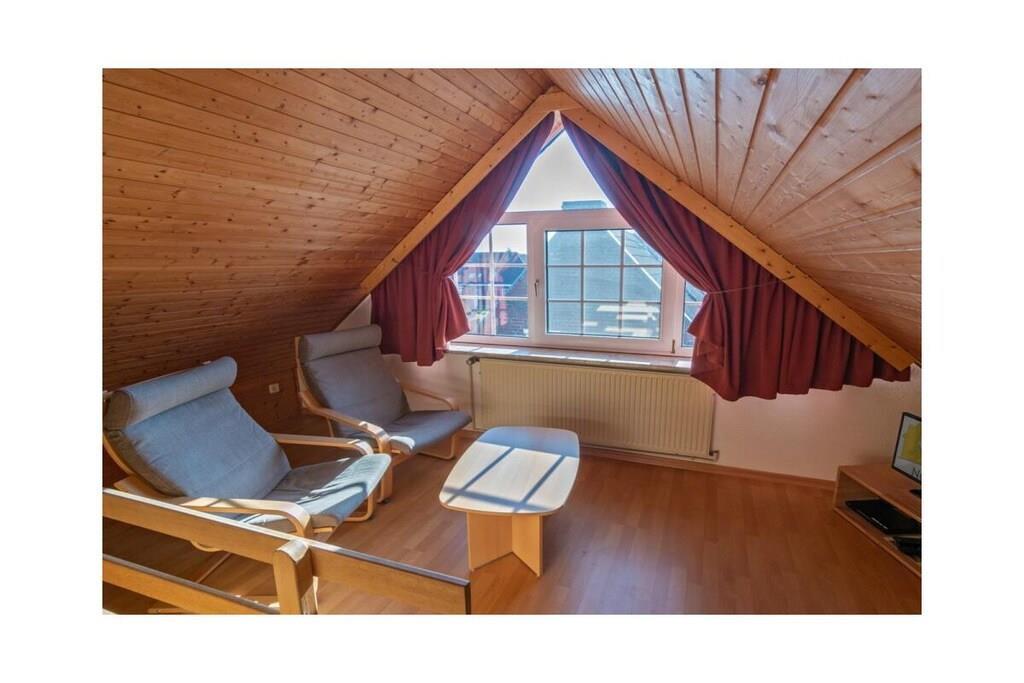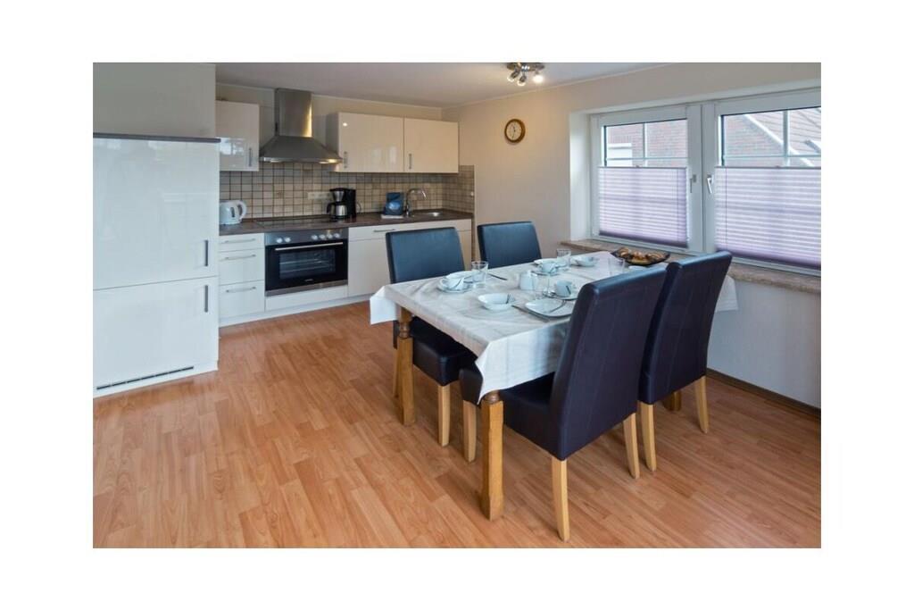 Ferienwohnung Mali Jollenweg 11 Norddeich, ein ruhiger Stadtteil der ostfriesischen Stadt Norden, lässt nicht nur das Herz von Küstenliebhabern höherschlagen. Hier finden Sie alles, was Sie für einen erholsamen und abwechslungsreichen Urlaub wünschen. Der neue Sandstrand Norddeichs ist nur einen kleinen Spaziergang entfernt. Aber auch auf die belebten kleinen Einkaufsstraßen führen kurze Wege. Entspannen Sie in Ihrer Ferienwohnung und genießen Sie hier einen angenehmen Aufenthalt. Die Ferienwohnung Die Ferienwohnung Mali liegt in einer ruhigen Seitenstraße in einer typisch friesischen Doppelhaushälfte mit vier Wohneinheiten. Nur wenige Schritt, und Sie biegen von hier aus auf den Dörper Weg, der zahlreiche Einkaufsmöglichkeiten und nordische Gastronomieerlebnisse bietet. Die Wohnung liegt im 1. Obergeschoss und ist bequem über ein paar Treppen zu erreichen. Im Zentrum steht der geräumige Wohnraum mit kombiniertem Koch- und Essbereich. Bis zu vier Personen können hier gemeinsam kochen, speisen und gemütliche Abende in der Sofaecke genießen. Dazu finden Sie hier alles, was Sie benötigen. Die moderne 2sitzige Couch und der passende Sessel sind ideal, um gemeinsame TV-Abende zu verbringen. Durch die großen Fenster dringt viel Licht in den Wohnbereich. Doch nach Bedarf lassen sich alle Fenster durch Rollläden oder Plissees verdunkeln. Funktional eingerichtet ist auch die Küchenecke. Hier fehlt es Ihnen an nichts, um gemeinsam Ihre Mahlzeiten vorzubereiten. Die Einbauküche ist ausgestattet mit einem Elektro-Herd mit Cerankochfeld, einem Kühlschrank, einer Kaffeemaschine, einem Toaster, einem Mixer sowie ausreichend Geschirr, Gläsern, Besteck usw. Der gemütliche Esstisch mit den bequemen Stühlen bildet den idealen Versammlungsort zum Essen, spielen oder für gemeinsame Gespräche. Direkt vom Wohn-Ess-Bereich führt der Weg auf den hübschen kleinen Balkon, der Ihnen den Blick ins Grüne ermöglicht. Auch dieser ist möbliert und nach Westen ausgerichtet, so dass Sie hier den Sonnenuntergang genießen und einen schönen Ferientag in Ruhe ausklingen lassen können. Im Schlafzimmer, welches mit dem Wohn-Essbereich auf einer Ebene liegt, befindet sich ein großes 200 x 200 cm großes Doppelbett mit integrierter Beleuchtung im Kopfteil. Der Kleiderschrank bietet Ihnen ausreichend Platz für Ihre mitgerbachte Garderobe. Über eine Treppe gelangen Sie in das obere Schlafzimmer, welches mit zwei 90 x 200 cm großen Einzelbetten, einem geräumigen Kleiderschrank, einem kleinen Tisch, zwei gemütlichen Sesseln und einem TV-Gerät ausgestattet ist. Das Badezimmer verfügt über eine Dusche, ein WC und eine praktische Waschkombination mit Spiegel. Je nach Wohnbereich ist Ihr Feriendomizil mit freundlichem Laminat, praktischen Fliesen oder Teppichboden ausgelegt. Der Parkplatz befindet sich neben dem Haus. Für den sorgenfreien Start in den Urlaub buchen Sie unser Wäschepaket. Dieses besteht aus Bettwäsche, Handtüchern sowie Duschvorleger, Geschirrhandtüchern und einem Serviceset (Toi-Papier, Spülmaschinentabs, Müllbeutel, Spülbürste, Putzlappen und sonstigen kleinen Helfern) für den sorglosen Start Ihres Urlaubes.