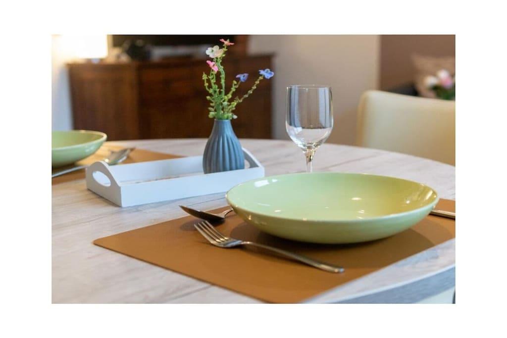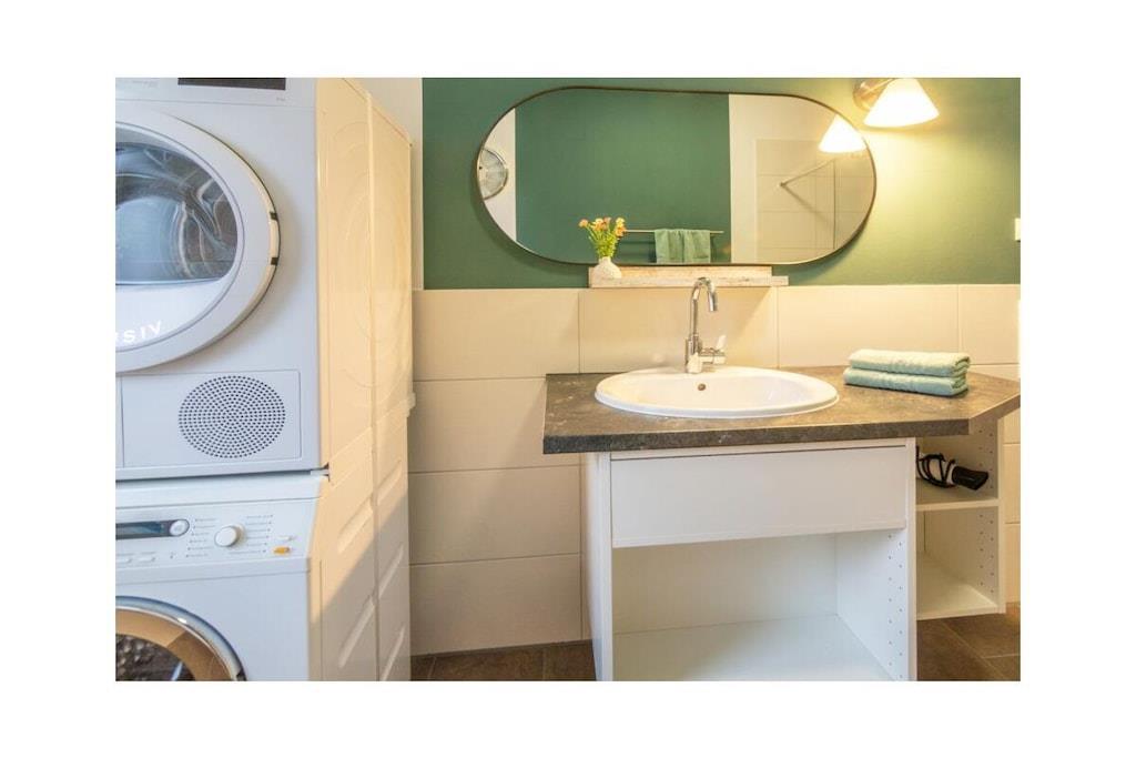 , Eingangshalle(), Wohnzimmer(Schlafcouch 1 Pers., TV, Heizung), Küche(Kochplatte, Wasserkocher, Toaster, Kaffeemaschine, Backofen, Mikrowelle, Spülmaschine, Kühlschrank, Tiefkühlschrank), Schlafzimmer(, Doppelbett, Kinderbett), Badezimmer(, Toilette, Dusche, Föhn), Internet, Trockner, Waschmaschine, Gartenmöbel, Parkplatz, Trockenschrank