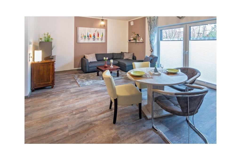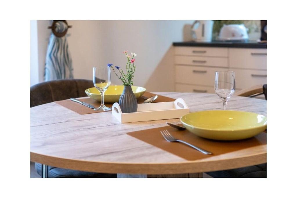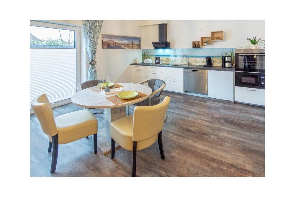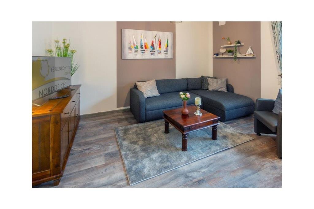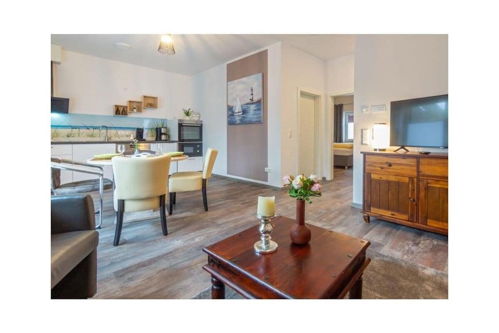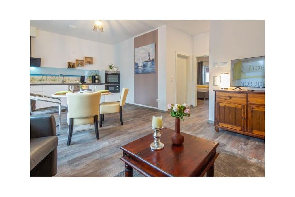 Gemütliche Ferienwohnung in Norddeich mit Balkon, moderner Ausstattung und Nähe zum Strand für erholsamen Urlaub zu zweit.