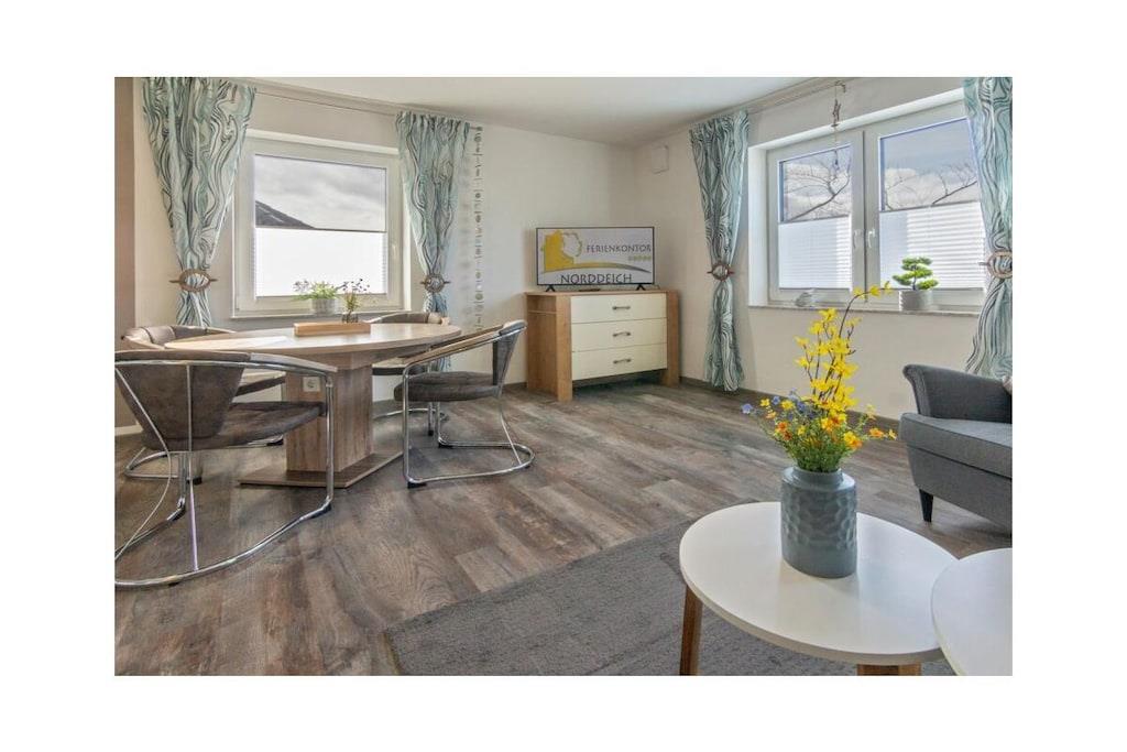 Ferienwohnung Traum Wohnung 3 Norddeicherstr. 226 c Die schönste Zeit des Jahres verbringen viele gerne allein oder zu zweit, um Ihre Ruhe genießen und Abstand gewinnen zu können. Andere freuen sich, wenn sie die Ferien gemeinsam mit anderen Familien und Freunden verbringen dürfen. Doch in einem großen Objekt ist dies nicht immer möglich. Hier, im wunderschönen Norden, finden Sie das perfekte Urlaubsdomizil – ganz gleich, ob Sie eine Paarreise planen oder mit mehreren Familien unterwegs sind. Das Mehrparteienhaus befindet sich im Herzen Norddeichs. Der Ortsteil Nordens ist besonders beliebt, weil Nordseeliebhaber hier alles finden, was es zu ihrem maritimen Urlaubsglück braucht. Der Deich liegt direkt vor der Tür. Sie müssen nur hinübergehen und können die wohltuende Nordseeluft atmen. Der kilometerlange Sandstrand lädt zu Spaziergängen, zum Baden und zahlreichen Freizeitvergnügungen ein. Norddeich selbst ist klein und gemütlich, trotzdem aber belebt und abwechslungsreich, mit kleinen Geschäften, einer regionalen Gastronomie und einem vielseitigen Tourismusangebot für Groß und Klein. Das Mehrparteienhaus, in dem Ihr Apartment gelegen ist, verfügt über mehrere kleinere Wohnungen. Sie können sich hier inmitten anderer Reisende wunderbar zurückziehen, oder gleich gemeinsam mit anderen Familien mehrere Wohnungen für einen gelungenen gemeinsamen Urlaub anmieten. In jedem Fall finden Sie in Ihren eigenen vier Wänden trotzdem Ihre Privatsphäre und die notwendige Zurückgezogenheit. Die Ferienwohnung Traum 3 liegt im Obergeschoss des Hauses. Sie verfügt über einen sehr hellen und großzügig geschnittenen Wohn-Essbereich, der auch mit dem offenen Flur verbunden ist. Helle Farben und der moderne Vinyl-Boden im Naturholzdesign schaffen eine einladende Atmosphäre. Der Wohnbereich mit seiner gemütlichen Essecke, der kleinen Sofalandschaft und dem TV-Gerät bilden das Zentrum Ihrer Unterkunft. Die Küche lässt Sie dank des maritimen Glas-Spritzschutzes nicht vergessen, dass Sie an der wunderschönen Nordseeküste weilen. Ausgestattet ist die Küche mit allem, was Sie benötigen, um sich selbst zu versorgen, einschließlich einer Kaffeemaschine, einem Backofen und einer Spülmaschine. Vom Wohnbereich aus gelangen Sie auf den Balkon. Dieser ist mit einer kleinen Sitzgruppe ausgestattet, so dass sie hier gemütliche Stunden verbringen und dem Treiben des kleinen Touristenörtchen zuschauen können. Darüber hinaus verfügt das Apartment über ein geräumiges und vollständig möbliertes Schlafzimmer mit bequemen Doppelbett und einem modern gefliesten Badezimmer mit Duschkabine, in dem auch Waschmaschine und Trockner vorhanden sind. Auf Wunsch sind vor Ort auch Bettwäsche und Handtücher, sowie unser Starterset erhältlich. So steht Ihrem Traumurlaub in einer der Traumwohnungen Norddeichs nichts im Wege. Für den sorgenfreien Start in den Urlaub buchen Sie unser Wäschepaket. Dieses besteht aus Bettwäsche, Handtüchern sowie Duschvorleger, Geschirrhandtüchern und einem Serviceset (Toi-Papier, Spülmaschinentabs, Müllbeutel, Spülbürste, Putzlappen und sonstigen kleinen Helfern) für den sorglosen Start Ihres Urlaubes.