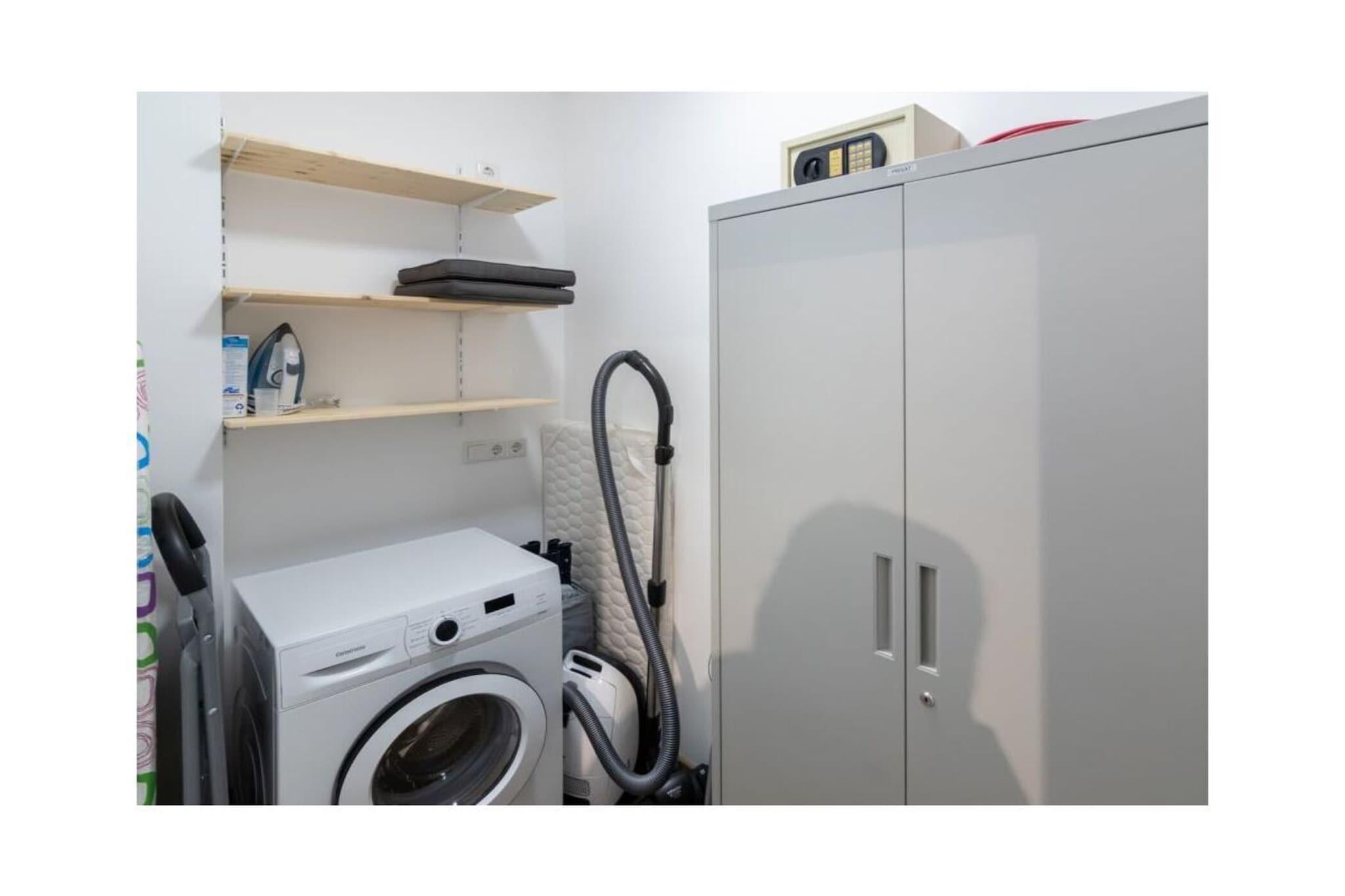 Parterre: (Eingangshalle, Wohnzimmer(TV, Heizung), Küche(Kochplatte, Wasserkocher, Toaster, Kaffeemaschine, Backofen, Mikrowelle, Spülmaschine, Kühlschrank, Tiefkühlschrank), Schlafzimmer(Kinderbett), Badezimmer(Dusche, Toilette, Föhn)) Waschmaschine, Balkon, Gartenmöbel, Parkplatz