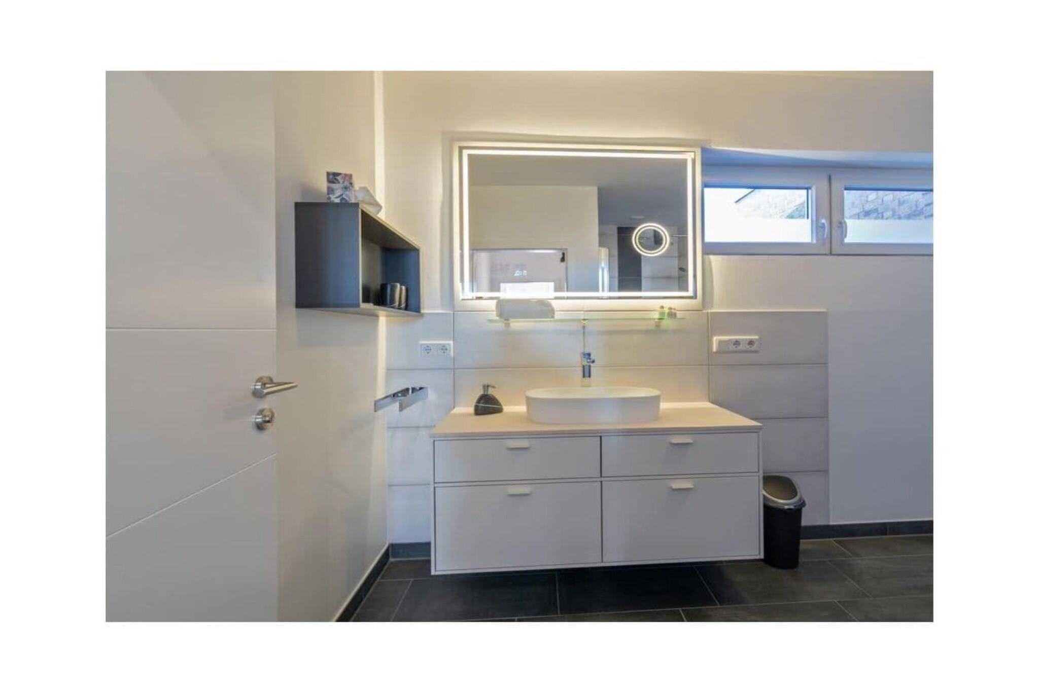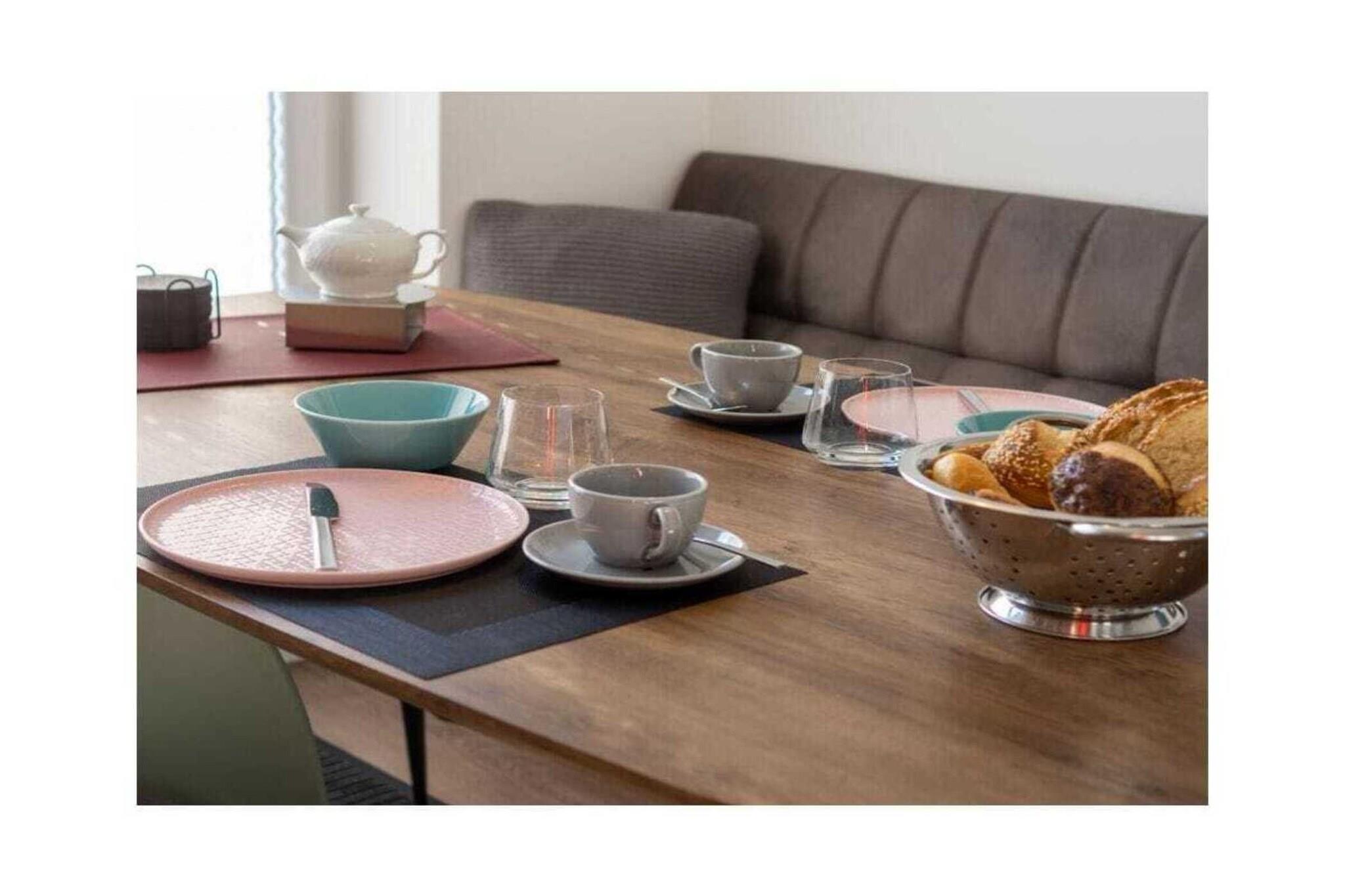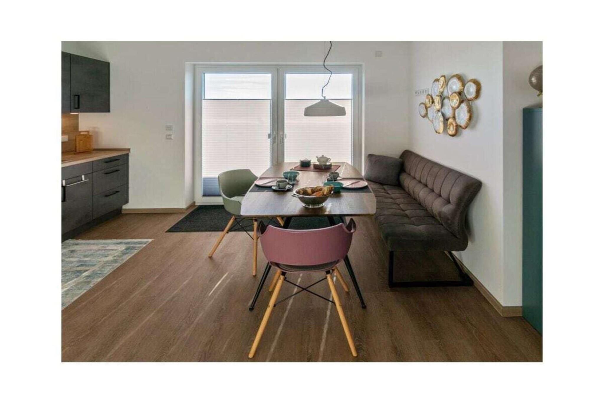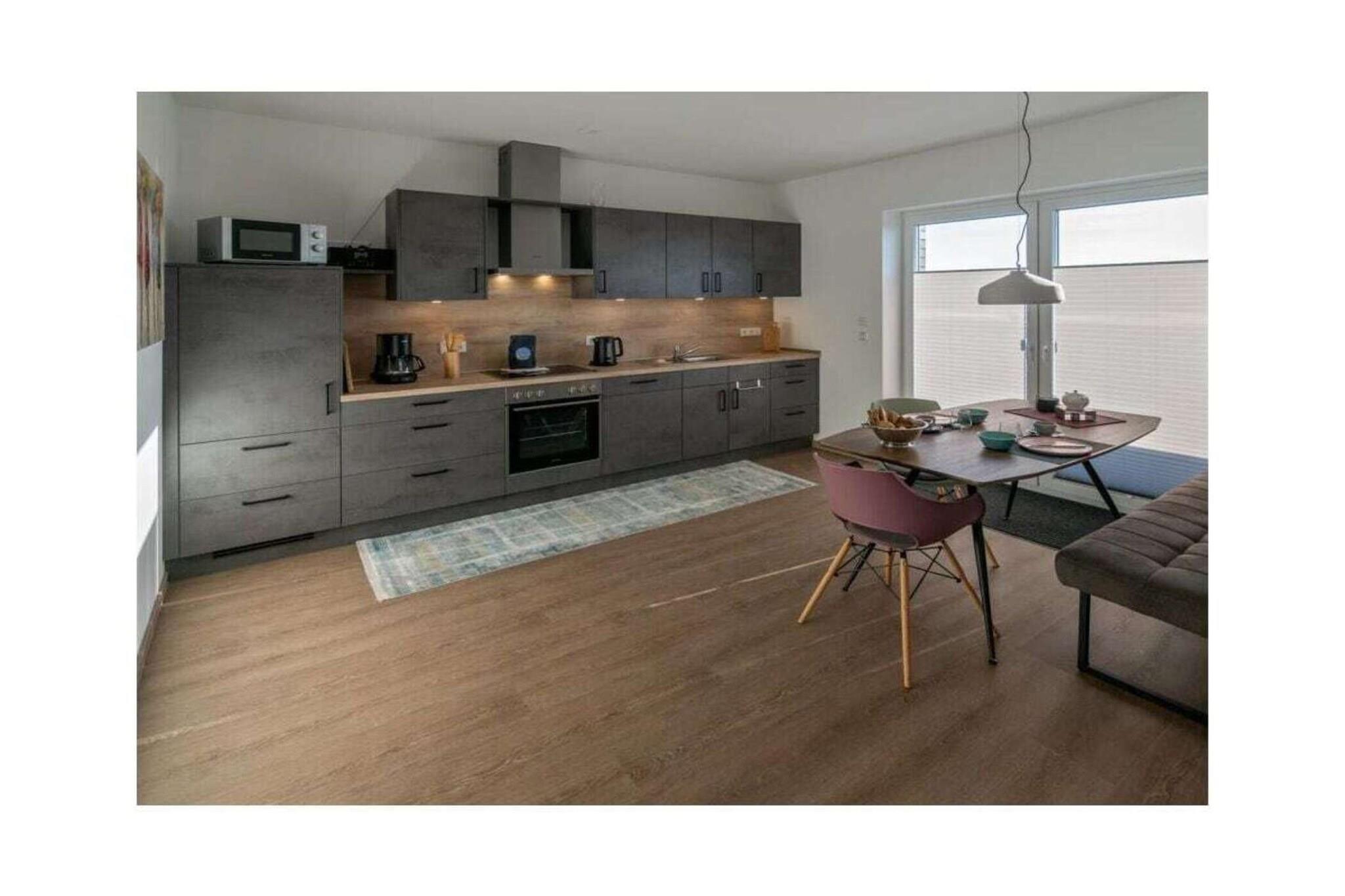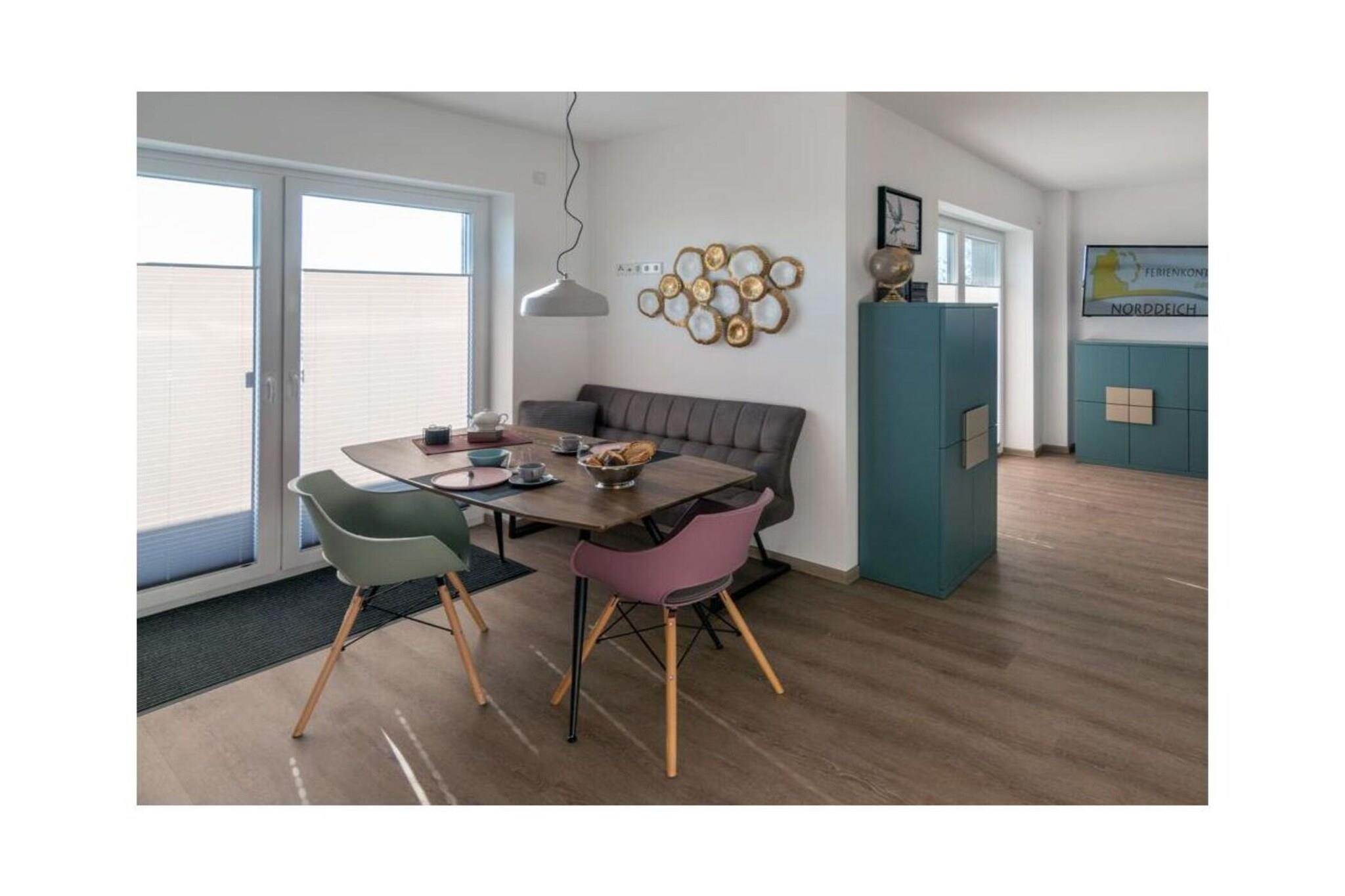 Ferienwohnung Deck 8 Zum Bahnkolk 5 Verbringen Sie erholsame und gerne auch erlebnisreiche Tage im kleinen Urlaubsparadies Norddeich. Hier, in dem ruhigen Ortsteil der ostfriesischen Stadt Norden finden Sie alles, was Sie sich für Ihren Traumurlaub wünschen: einen langen Sandstrand, weite Dünen, urige Lokale und einladende Geschäfte. Einen rundum angenehmen Aufenthalt garantiert Ihnen diese exklusive Ferienwohnung, die Sie barrierefrei bewohnen können. Die Ferienwohnung Die Ferienwohnung Deck 8 befindet sich im zweiten Obergeschoss eines Mehrparteienhauses, ist trotz der sehr zentralen Lage angenehm ruhig gelegen. An den herrlichen Sandstrand gelangen Sie ebenso schnell wie in Norddeichs belebte und einladende Einkaufsmeile. Einen Parkplatz finden Sie direkt vor Ihrer Haustüre. Zu Ihrem Feriendomizil müssen Sie keine Treppen steigen, da ein moderner Lift vorhanden ist, der Sie direkt in den 2. Stock bringt. Barrierefrei präsentiert sich dieses Objekt auch im Inneren. Küche, Essbereich und Wohnzimmer sind in einer großzügigen Fläche miteinander verbunden. Besonders auffallend ist hier die moderne und dennoch sehr gemütliche Einrichtung. Die Wohnung ist hell und freundlich gestaltet, dunkle Farbakzente an den ausgewählten Designermöbeln sorgen für einen eleganten Flair. Dank der breiten Fensterfront im Wohn- und Essbereich ist Ihre Wohnung fast den ganzen Tag von Licht durchflutet. Selbstverständlich lassen sich die Fenster auf Wunsch mittels der Rollläden abdunkeln. Eine stylische Couch und der farblich passende Sessel im Wohnbereich laden zum Verweilen ein. Ein modernes TV-Gerät garantiert gemütliche Fernsehabende. Die moderne Küchenzeile ist funktional mit allem ausgestattet, was Sie benötigen, wenn Sie einmal nicht auswärts essen wollen. Sie verfügt über einen Herd mit vier Kochplatten auf einem Ceranfeld, einen Backofen, einen Kühlschrank, eine Spülmaschine, eine Mikrowelle, eine Kaffeemaschine, einen Toaster, einen Eierkocher sowie ausreichend Geschirr, Gläser und Besteck. Verbringen Sie Ihre Mahlzeiten gemeinsam am einladend gedeckten Esstisch. Auf den modernen und doch bequemen Esszimmerstühlen und der stylischen Sitzbank werden Sie in froher Runde gerne noch das ein oder andere Glas Wein genießen. Direkt vom Wohnbereich gelangen Sie auf das Herzstück Ihres Feriendomizils: die herrliche Terrasse, die sich über die gesamte Längsseite der Wohnung erstreckt. Auf der nach Süden ausgerichteten großen Terrassenfläche befindet sich eine gemütliche Outdoor-Lounge aus hochwertigem Polyrattan. Zwei Liegen versprechen Entspannung pur. Hier können Sie so manche Stunde in der wunderbaren Aussicht auf die ostfriesische Landschaft schwelgen und die wohltuende Nordseeluft genießen. Auf die Terrassenlandschaft gelangen Sie ebenfalls durch das Schlafzimmer der Wohnung. Hier finden Sie für Ihren Aufenthalt ein 180 x 200 cm großes Doppelbett mit besonders komfortabler Matratze vor. Ihre Garderobe lässt sich in dem mehrtürigen Kleiderschrank oder der Kommode verstauen. Ein hübscher Schreibtisch und ein zusätzliches TV-Gerät runden das Schlafzimmer-Interieur ab. Im großzügigen Flurbereich der Wohnung finden weitere Kleidungsstücke ausreichend Platz. Außerdem verfügt die Wohnung über einen Hauswirtschaftsraum, in der eine praktische Waschmaschine, ein Wäscheständer, Bügeleisen und Bügelbrett, ein Staubsauger und weitere Reinigungsutensilien zu Ihrer Verfügung stehen. Besonders edel präsentiert sich das Badezimmer. Es verfügt über ein WC, eine Dusche sowie eine moderne Waschkombination mit Spiegel. Auch ein Trockner ist hier vorhanden. Die hochwertigen Fliesen sind in eleganten Anthrazit-Grau-Tönen gehalten. Die große Duschkabine ist ebenerdig begehbar und damit auch barrierefrei zu nutzen. Zusätzlich verfügt Ihre Ferienwohnung über ein separates Gäste-WC. Die gesamte Wohnung wurde mit pflegeleichtem Vinylboden ausgelegt. In kälteren Jahreszeiten sorgt die durchgängig verlegte Fußbodenheizung für ein absolutes Wohlfühlambiente. Zur Verdunkelung befinden sich an den Fenstern praktische Rollläden.