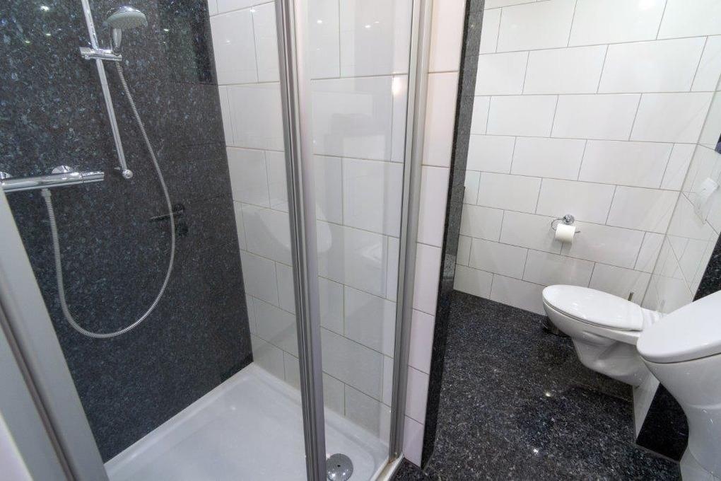 Dusche, Hänge-WC und ein Urinal Becken sowie Fußbodenheizung, Waschkombination mit großem Spiegel, Föhn.