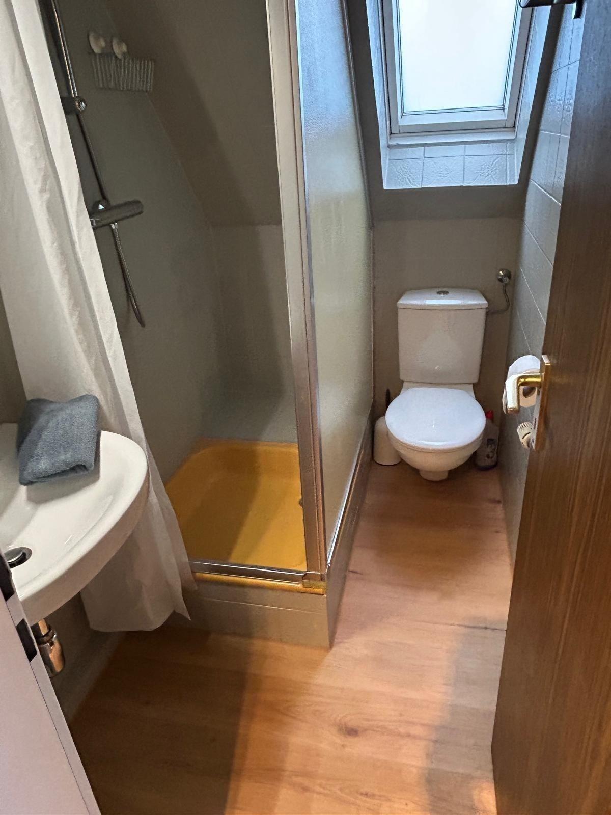 Die moderne Küchenzeile ist mit einem Elektro- und Gasherd, einer Mikrowelle, einem Kühlschrank, einer Kaffeemaschine und einem Toaster ausgestattet. Geschirr und Besteck sind ebenfalls vorhanden. Das Badezimmer mit Fenster umfasst eine Dusche und einen Spiegel.