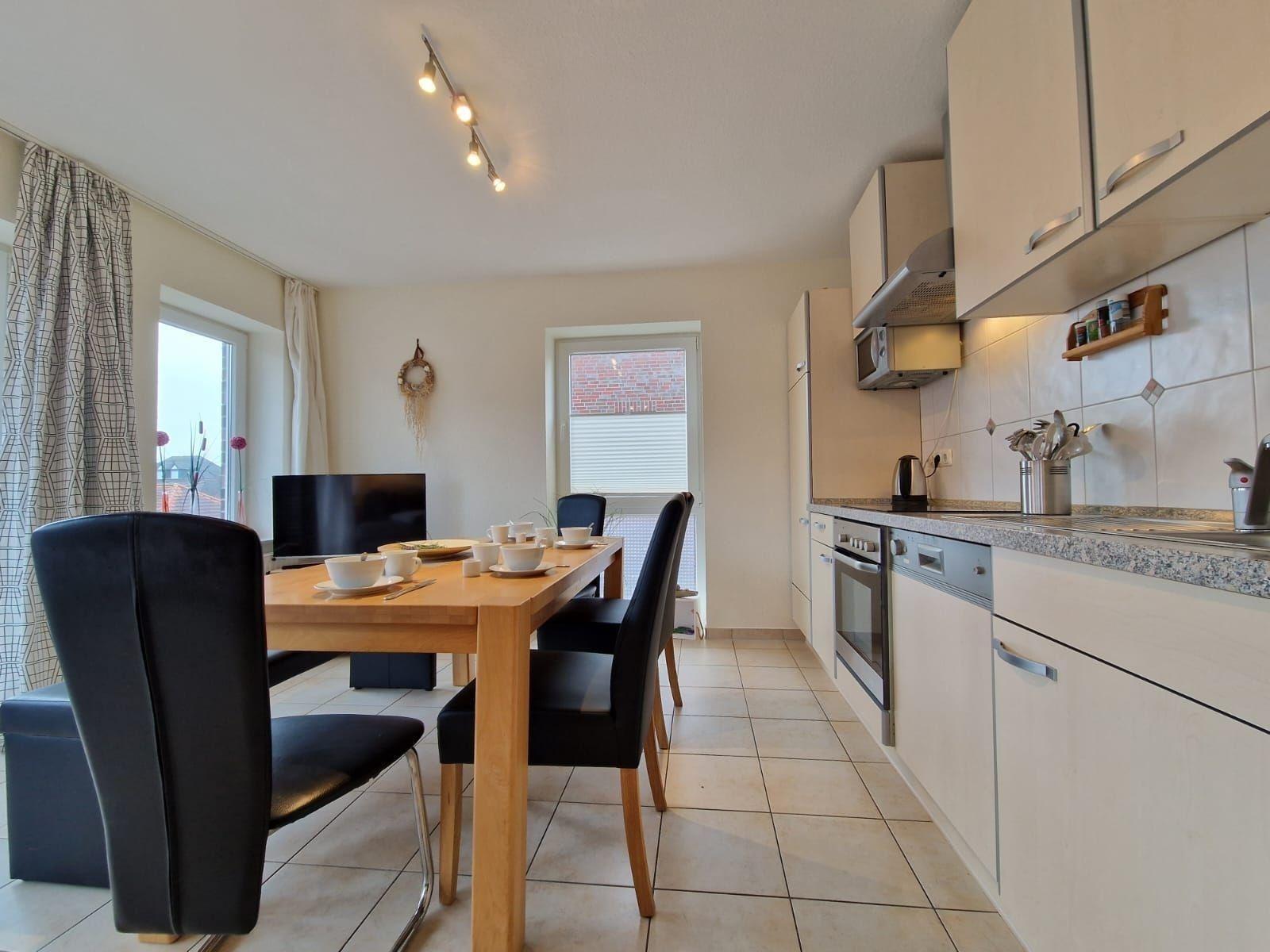 In dieser gemütlichen Ferienwohnung finden Gäste eine hochwertige Ausstattung, die hohen Komfort bietet. Die offene Küche ist mit modernen Geräten wie einem Elektro-/Gasherd, Geschirrspüler und Mikrowelle ausgestattet und lässt keine Wünsche offen. Ein Esstisch lädt zum geselligen Beisammensein ein.