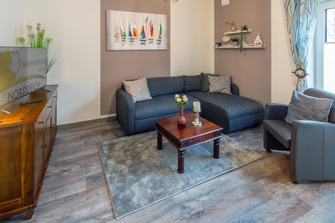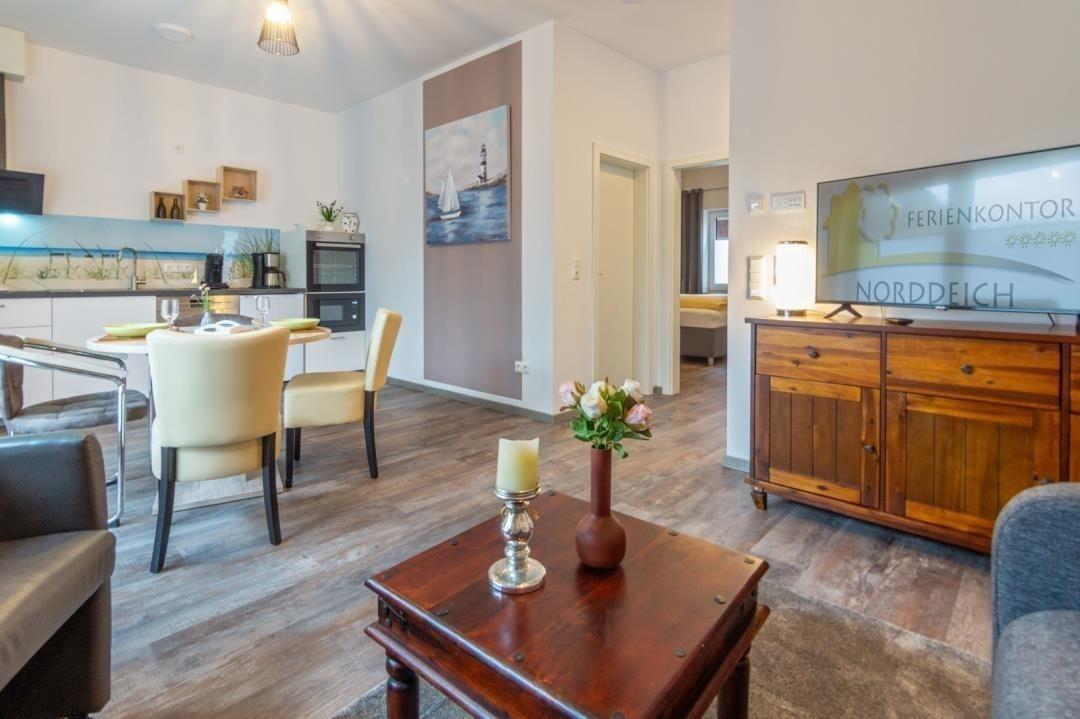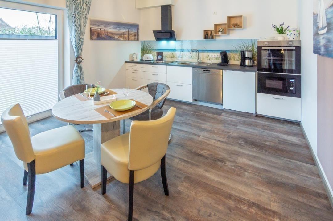 Gemütliche Ferienwohnung in Norddeich mit Terrasse und moderner Küche, ideal für einen erholsamen Urlaub an der Nordsee.