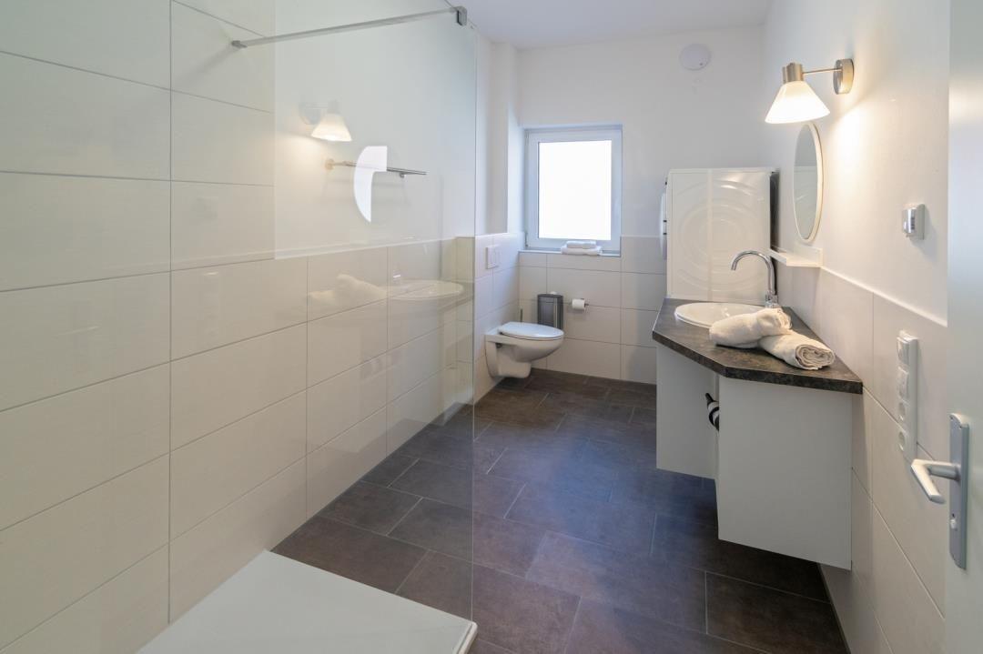 Das Schlafzimmer verfügt über ein modernes Doppelbett. Kommode, Schrank und Sessel ergänzen das Mobiliar. Besonders wohl dürfen Sie sich in dem großzügig angelegten und schick gefliesten Badezimmer fühlen. Die Dusche ist ebenerdig und bietet viel Bewegungsfreiheit. Darüber hinaus sind sowohl Waschmaschine als auch Trockner vorhanden.