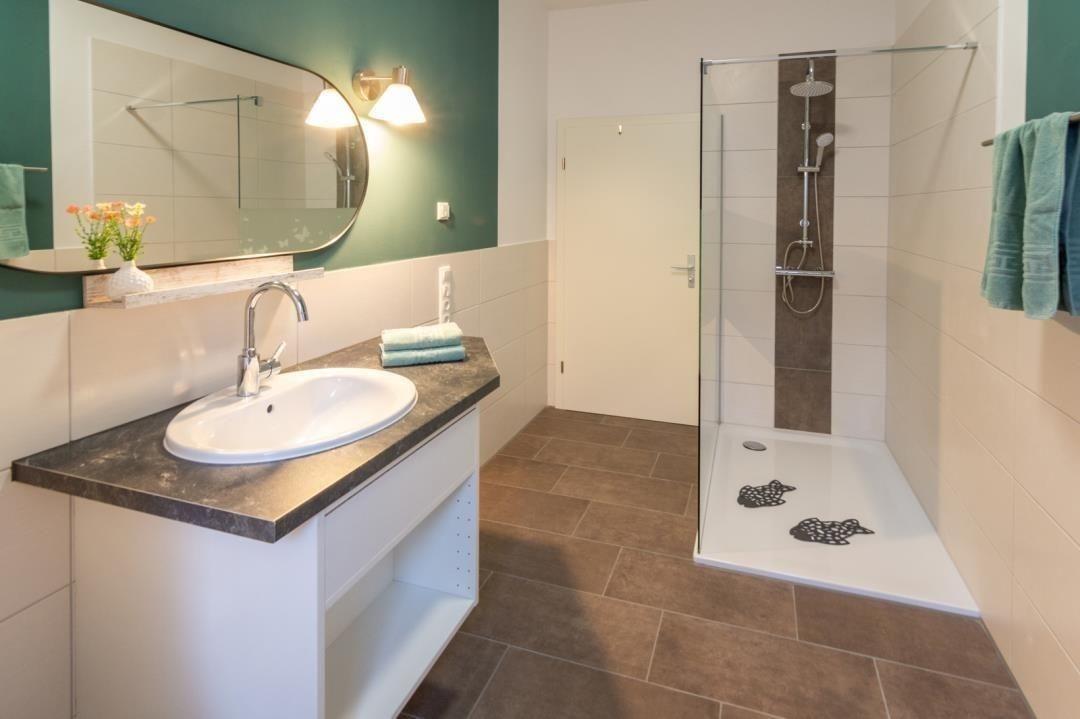 Das große Badezimmer hat ein Fenster, eine bodennahe Dusche, WC + Spiegel mit Unterschrank.