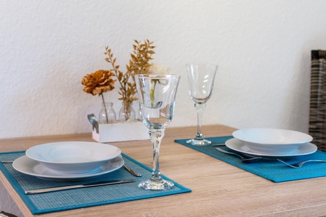 Der offene Wohnraum verbindet die Elemente Essen, Wohnen und Kochen harmonisch miteinander. Durch die helle und ansprechende Einrichtung kommt die großzügige Gestaltung erst richtig zur Geltung und unterstreicht das Ambiente auf harmonische Art und Weise.