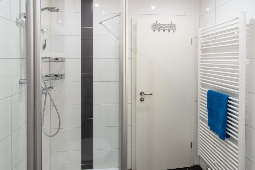 Das moderne Badezimmer verfügt über eine bodennahe Dusche, die ein bequemes Einsteigen garantiert, ein WC und natürlich einen Spiegel.