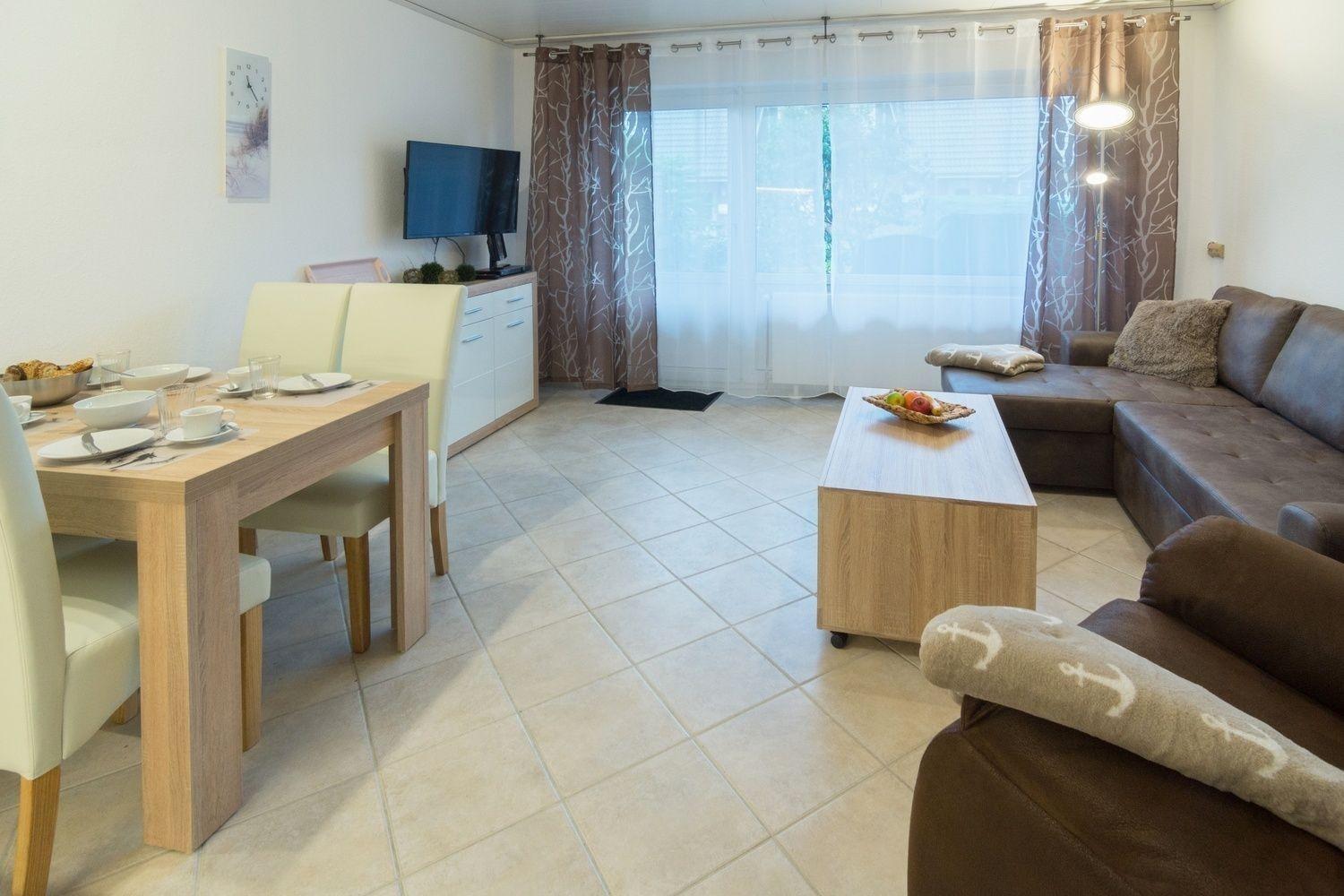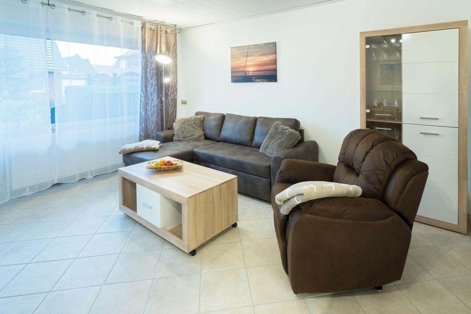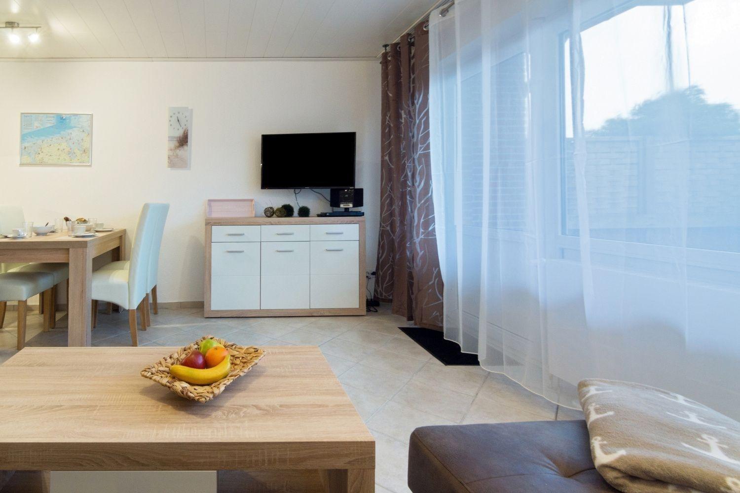 Moderne Erdgeschosswohnung nahe Strand in Norddeich mit Terrasse und Garten für erholsamen Urlaub.