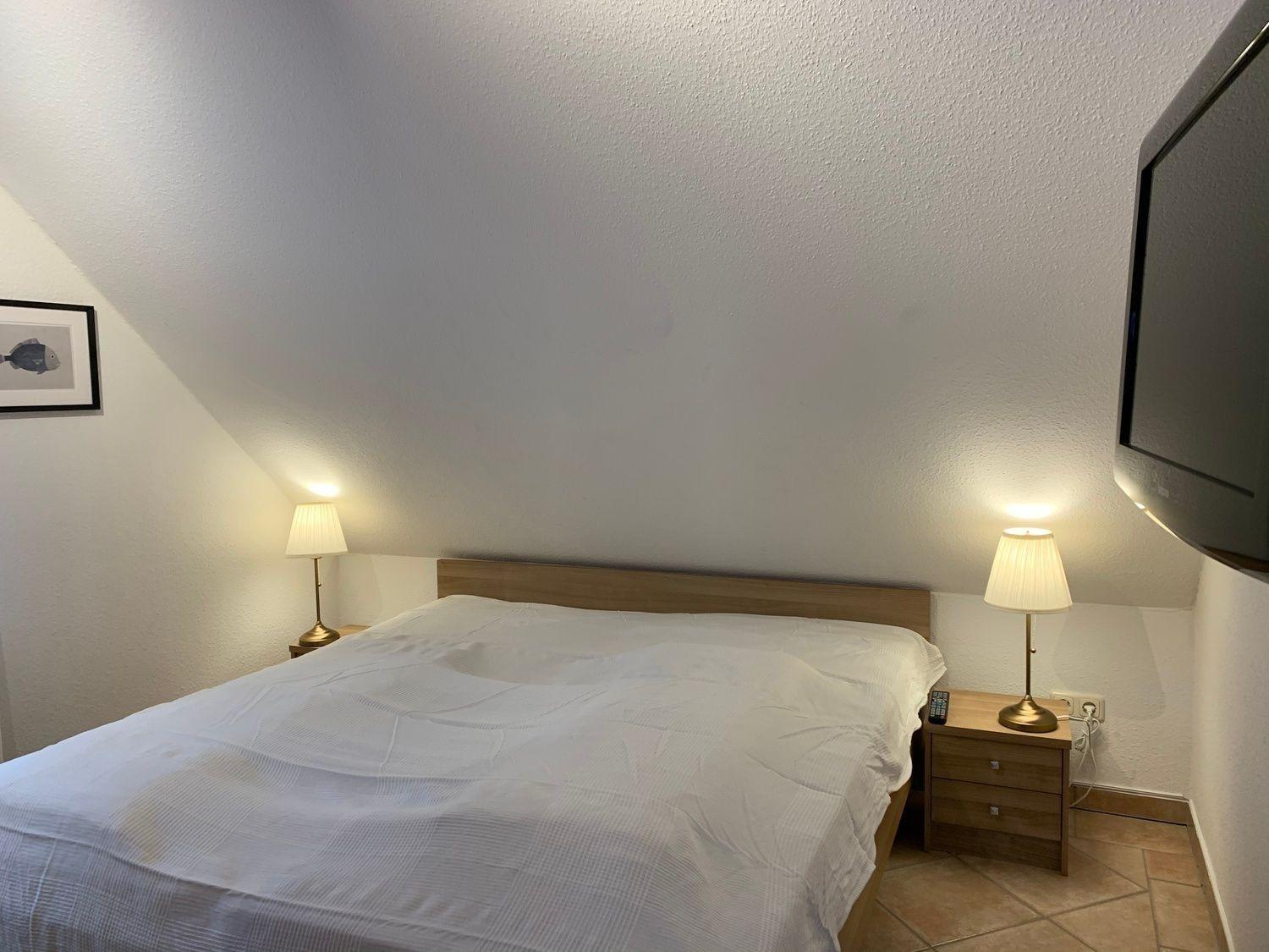 Das Elternschlafzimmer besteht aus einem Doppelbett, einem Kleiderschrank, Nachtschränken und einem Flachbildschirm-TV.