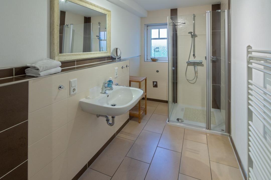 Das Badezimmer bietet eine Dusche, ein WC, einen Haartrockner, ein Waschbecken, einen Kosmetikspiegel und einen Spiegel. Es gibt ein Fenster und warmes Wasser. Im Außenbereich gibt es Gartenmöbel auf dem Balkon, Sonnenliegen und einen Windschutz. Diese umfangreiche Ausstattung sorgt für einen komfortablen und entspannten Aufenthalt in Norddeich.