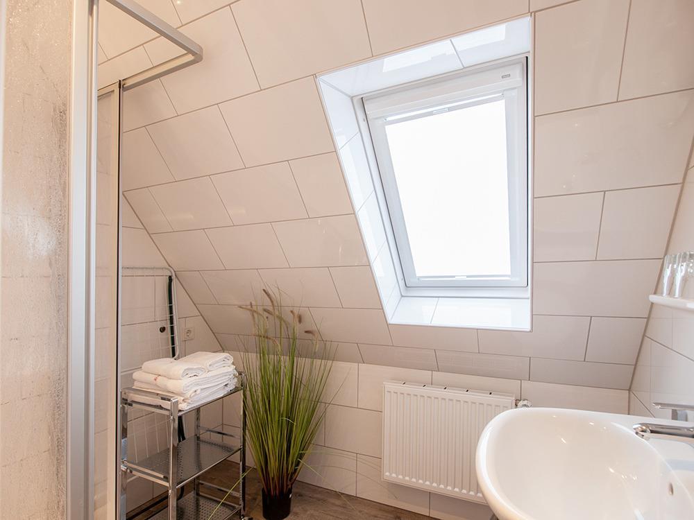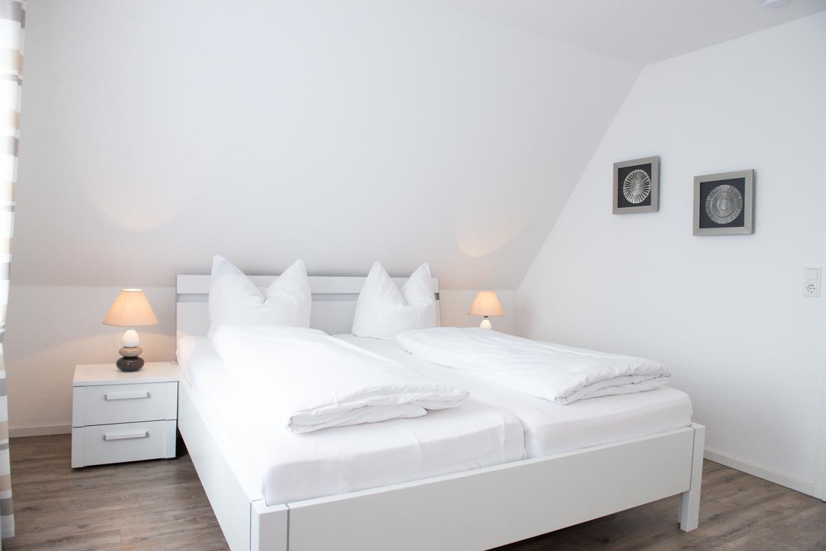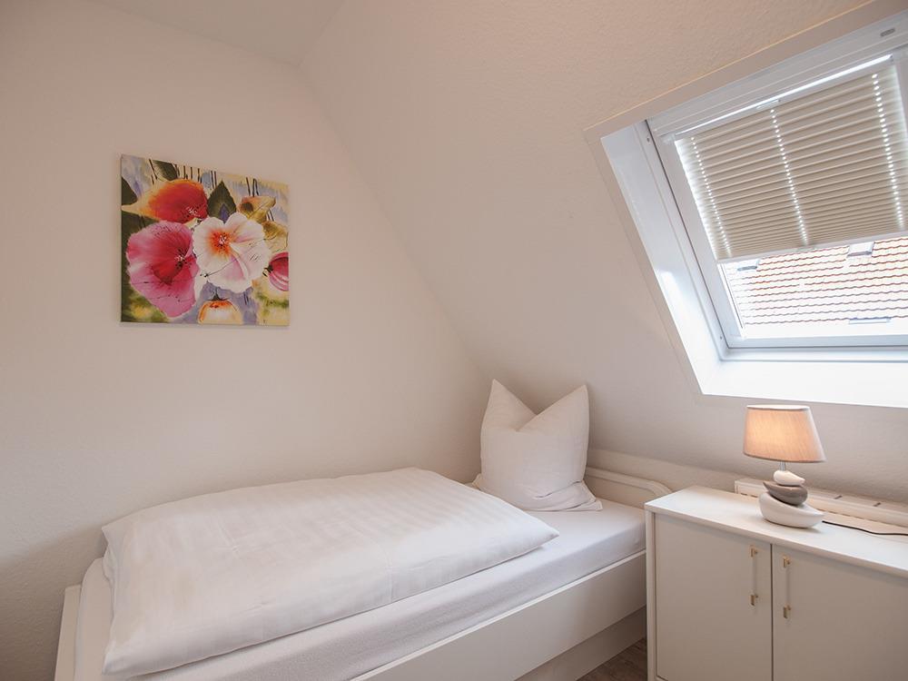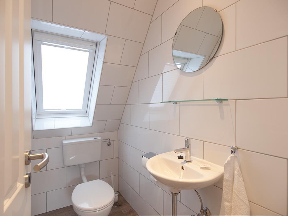 Über eine Holztreppe erreichen Sie das Obergeschoss. Hier befinden sich die zwei Schlafzimmer (1 x Doppelbett und 2 x Einzelbett) sowie ein voll ausgestattetes Bad mit Dusche und ein separates WC.