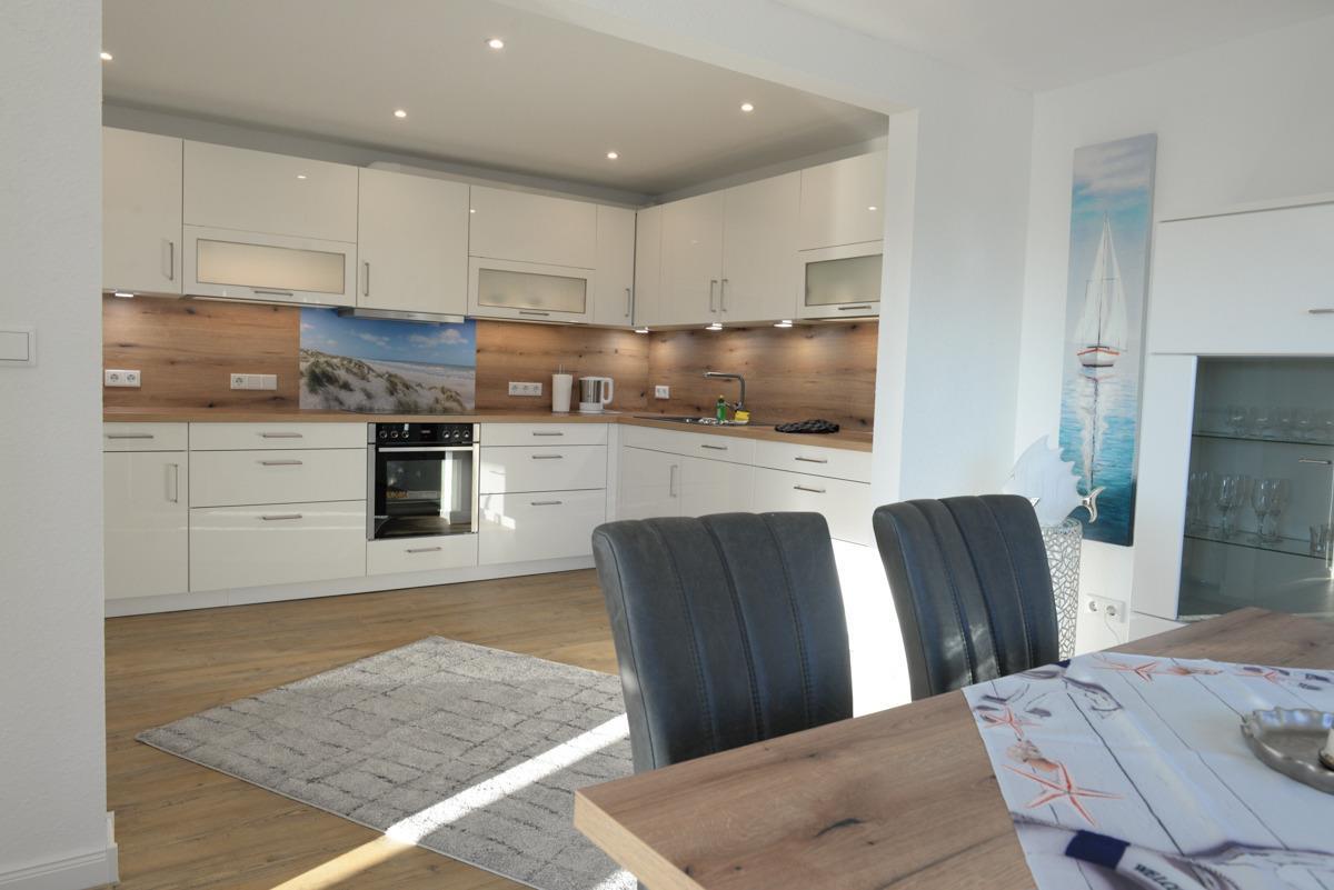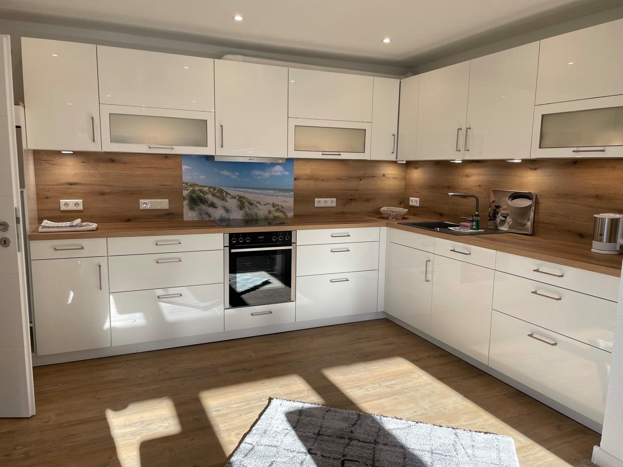 Die Einbauküche verfügt über Backofen, Geschirrspüler, Kühlschrank, Cerankochfeld und Mikrowelle.