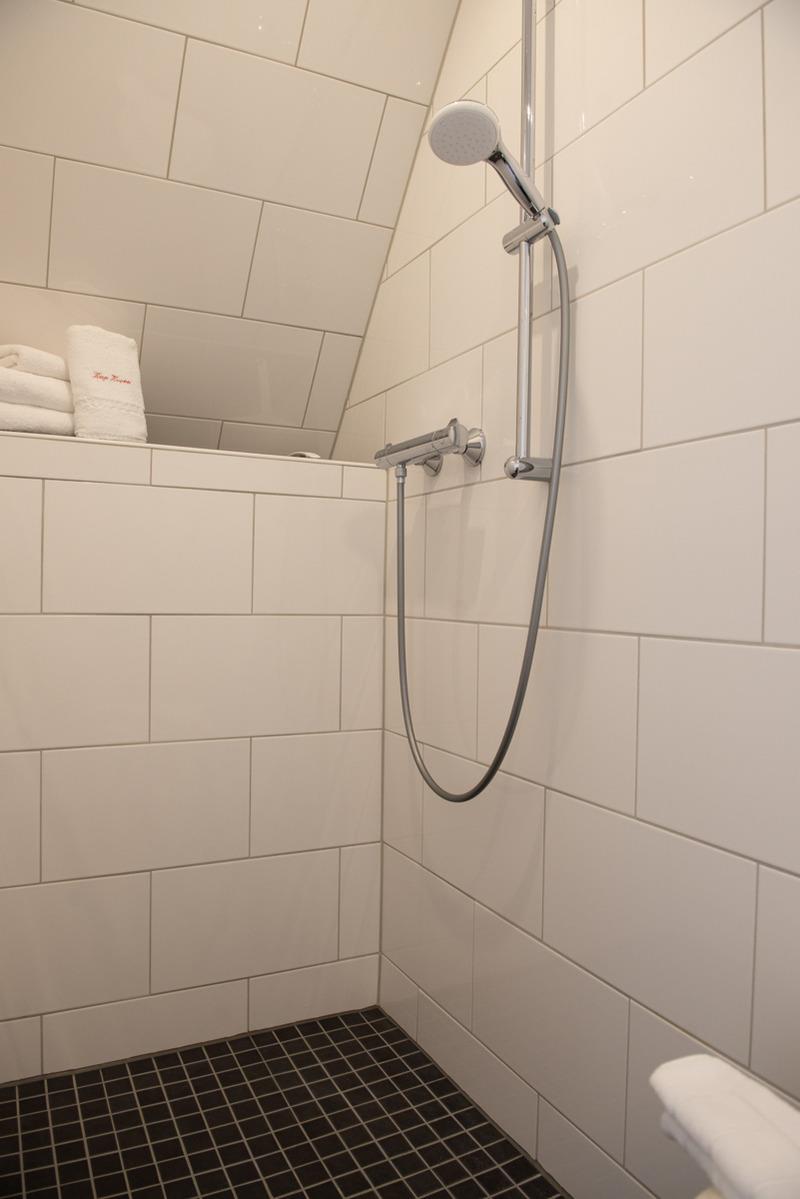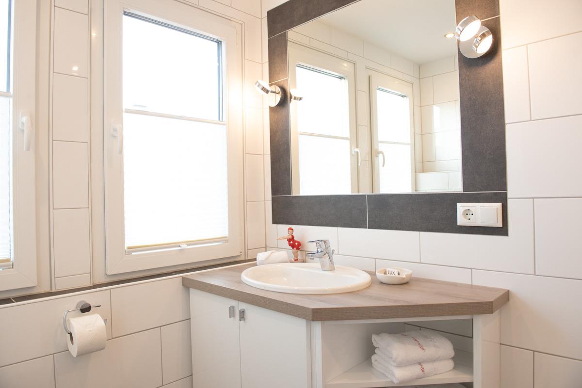 Das moderne Bad/ WC ist mit einer bodenebenen Dusche und einem Einbau -Waschtisch mit großem Spiegel ausgestattet.
