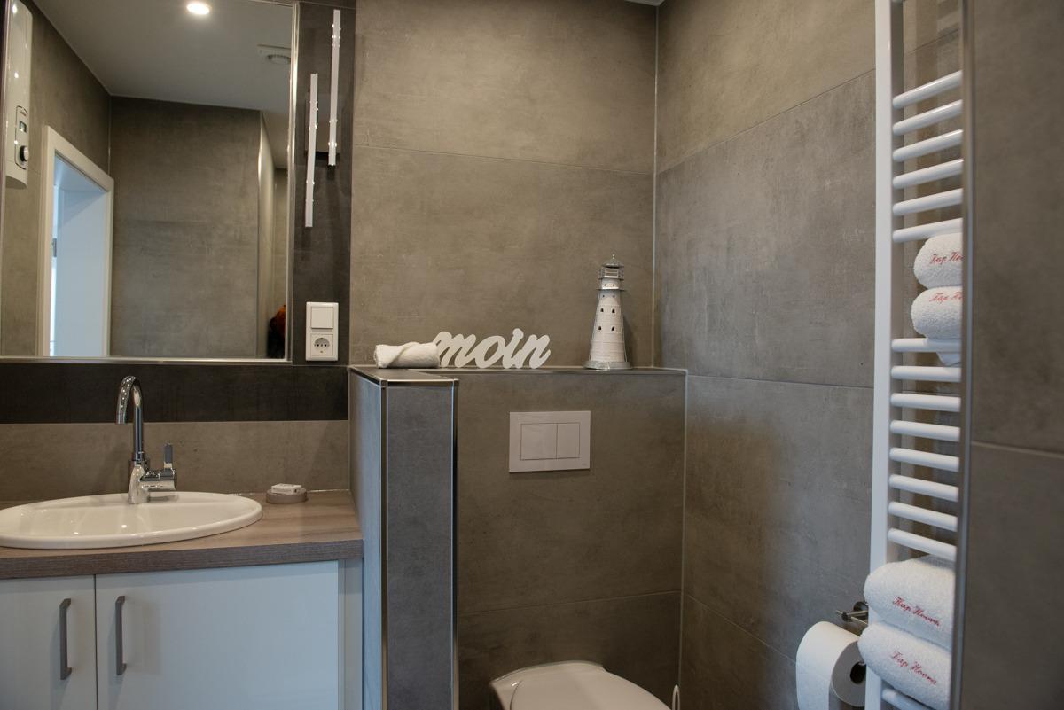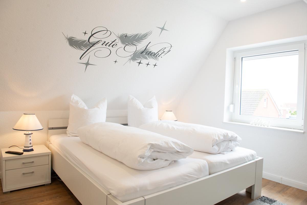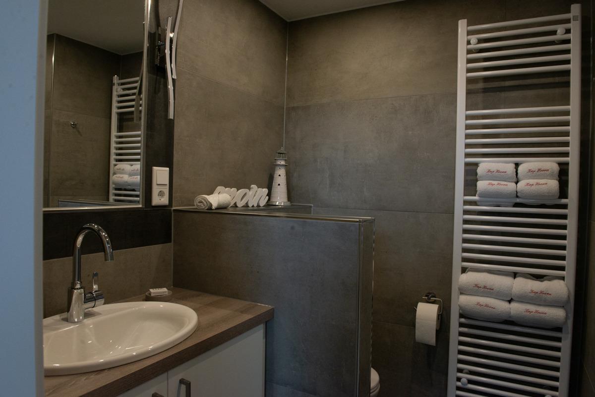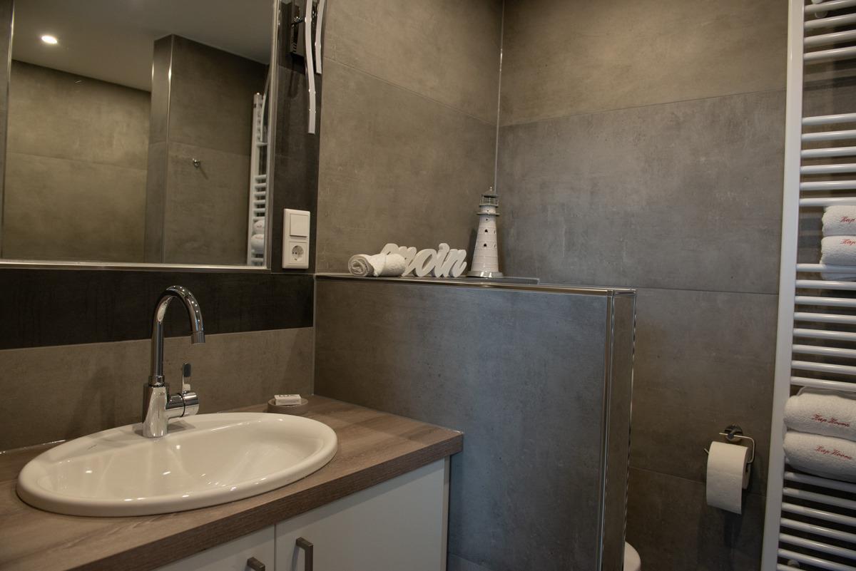 Die Ferienwohnung Deichnähe D liegt im 2.OG, verfügt über zwei Schlafzimmer, davon ist ein Schlafzimmer mit Doppelbett, Sat/TV, Außenrolladne und das zweite mit einem Einzelbett, großen Velux -Fenster und Verdunkl.-Plissees ausgestattet. Das moderne Bad /WC hat eine flachhohe Duschwanne, eine Waschtischkombination mit LED-Beleuchtung und einen Handtuchhalter - Heizungskörper.