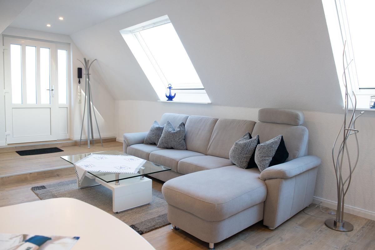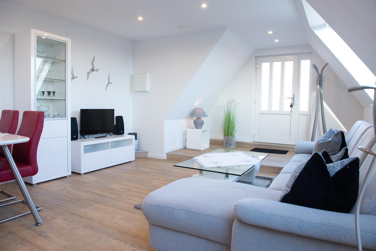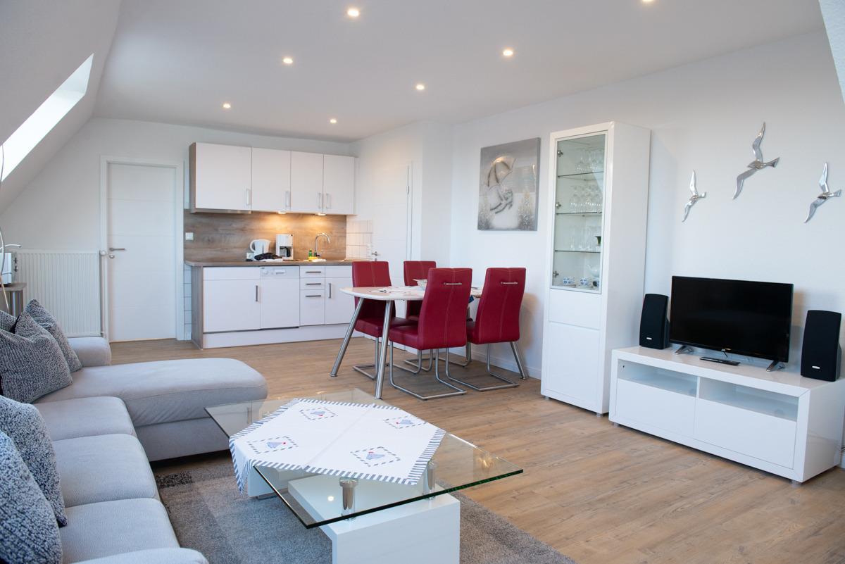 Das gemütliche Dach/ Wohn/Esszimmer mit zwei großen Veluxfenstern ist mit einer voll ausgestatteten integrierten Einbauküche, einer gemütlichen Couch mit Ottomane, einem Fernseher und einer Essgruppe ausgestattet. Von hier aus gelangen Sie zu der großen möblierten Dachterrasse mit einem fantastischen Blick über Norddeich, die ebenfalls auch einen Zugang für unsere Gäste der Wohnung C+H besitzt.