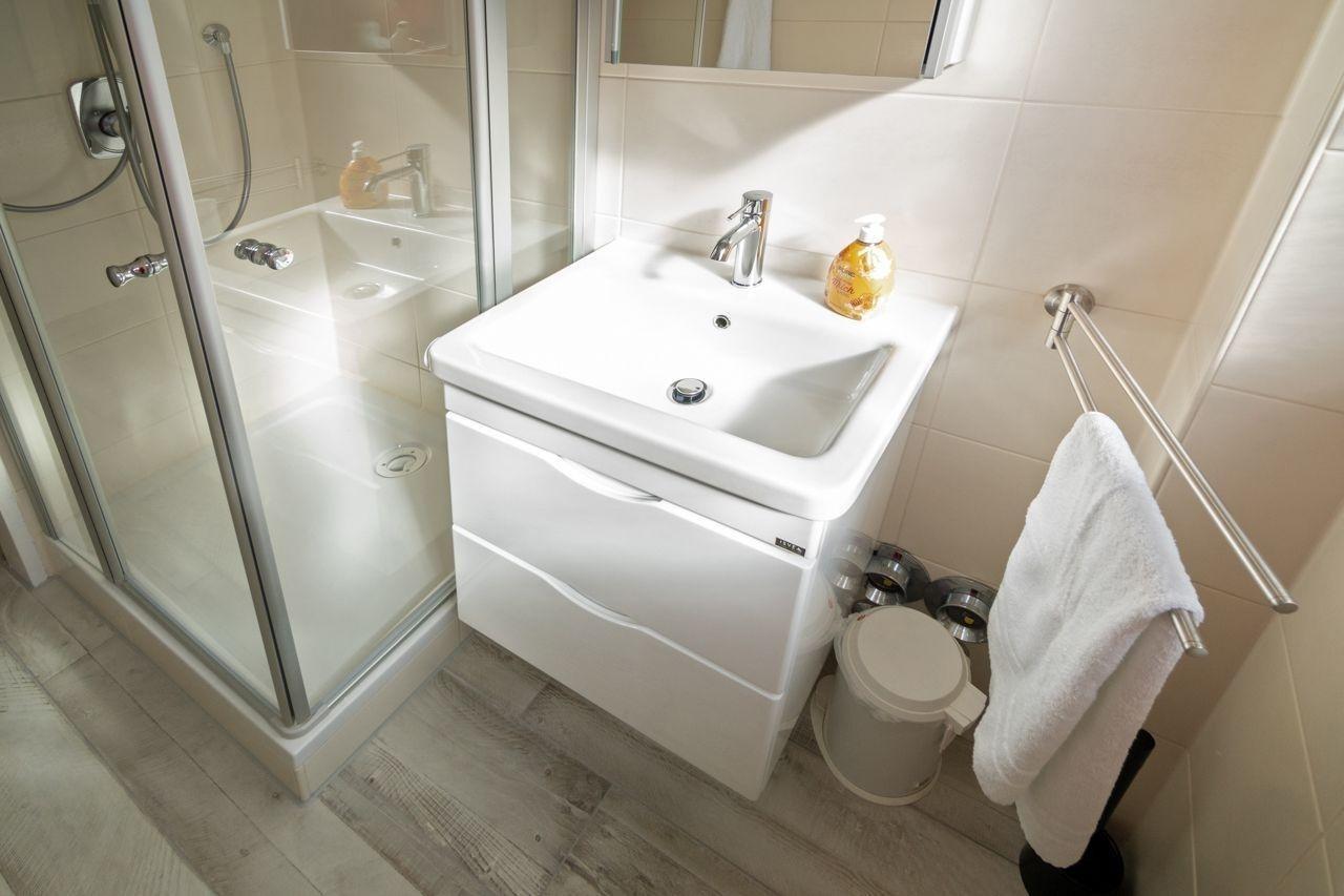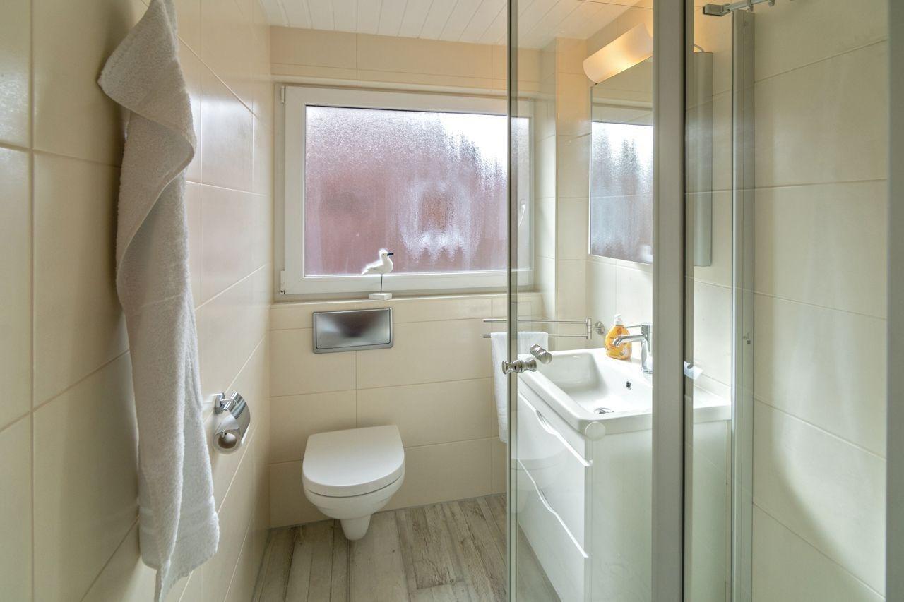 Das Badezimmer verfügt über eine Dusche, ein WC sowie eine Waschkombination mit Spiegel. Die Waschmaschine im Gemeinschaftswaschraum des Hauses steht Ihnen ebenfalls zur Verfügung.