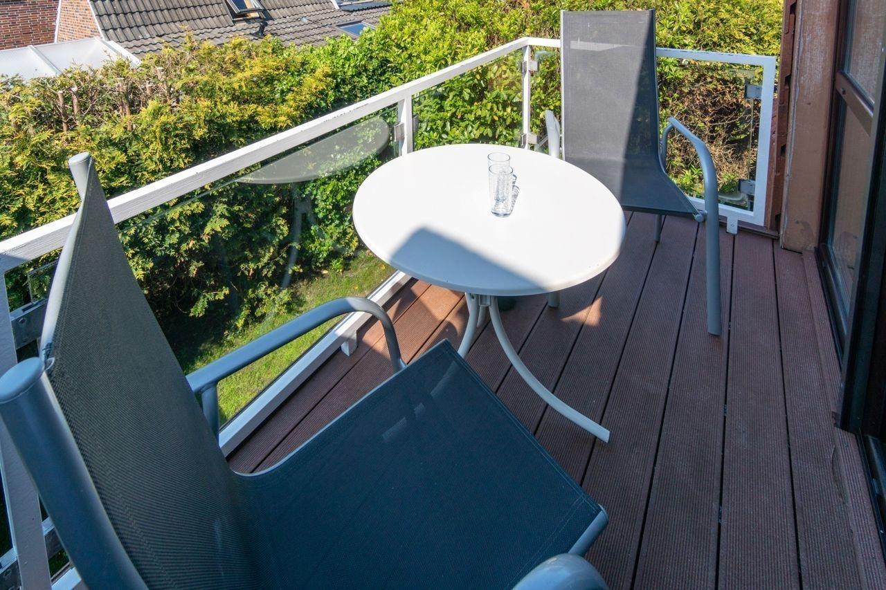In wenigen Schritten genießen Sie den Zugang auf den geräumigen Balkon mit integrierter Sitzecke. Dank der südwestlichen Ausrichtung können Sie hier an sonnigen warmen Tagen noch lange abends draußen sitzen und Ihren Ferientag ausklingen lassen.