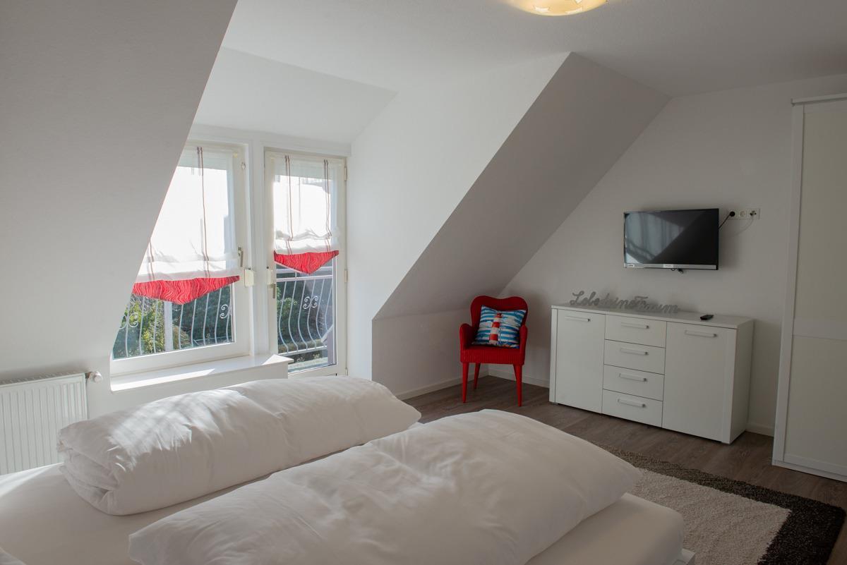 Die Ferienwohnung Stürbord verfügt über zwei getrennte Schlafzimmer im 1. OG, davon ist ein Schlafzimmer mit Außenrolläden und SAT-TV ausgestattet. Außerdem befindet sich im 1. OG ein zusätzliches WC. Das moderne Bad / WC ist mit Fenster, einer bodenebenen Dusche und einem Handtuchhalter - Heizkörper ausgestattet.