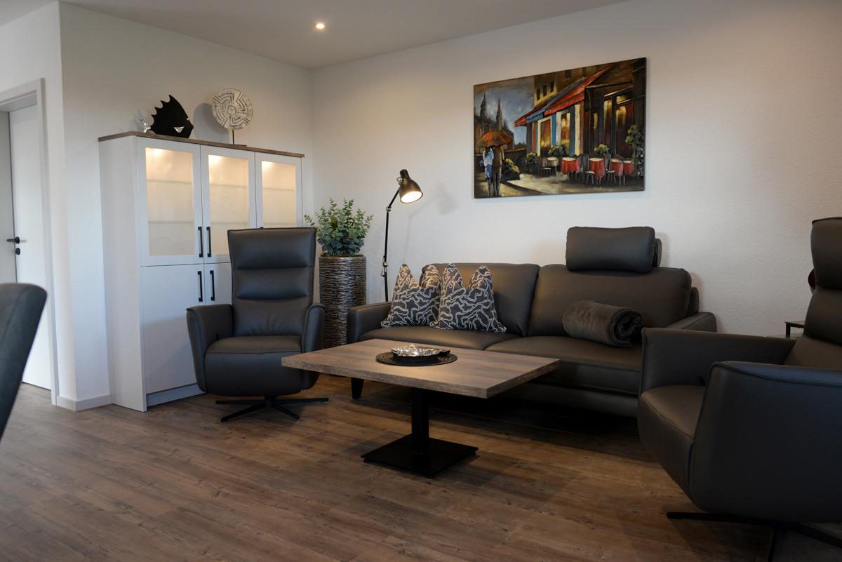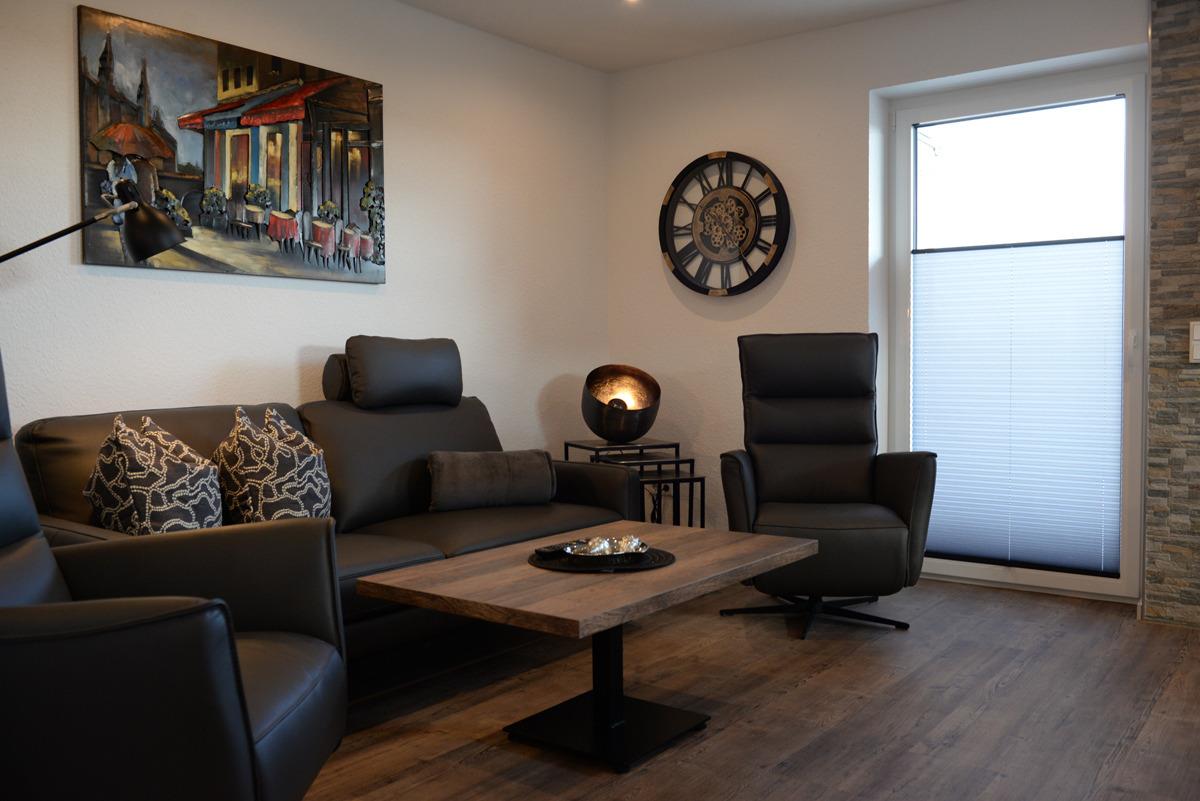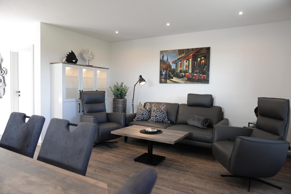 Das Wohn/Esszimmer ist mit einer gemütlichen Couch u. 2 Relaxsessel, einem Flachbildschirm-Fernseher, einer Essgruppe und einer voll ausgestatteten Einbauküche eingerichtet. Von dort aus gelangen Sie auf eine teilweise überdachte Terrasse, die mit Gartenmöbeln und Sonnenschirm ausgestattet ist. Dieses Plätzchen lädt sie zum Sonnenbaden oder für den späteren Sonnenuntergang am Abend ein.
