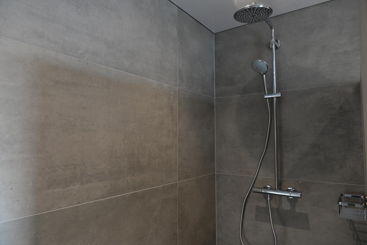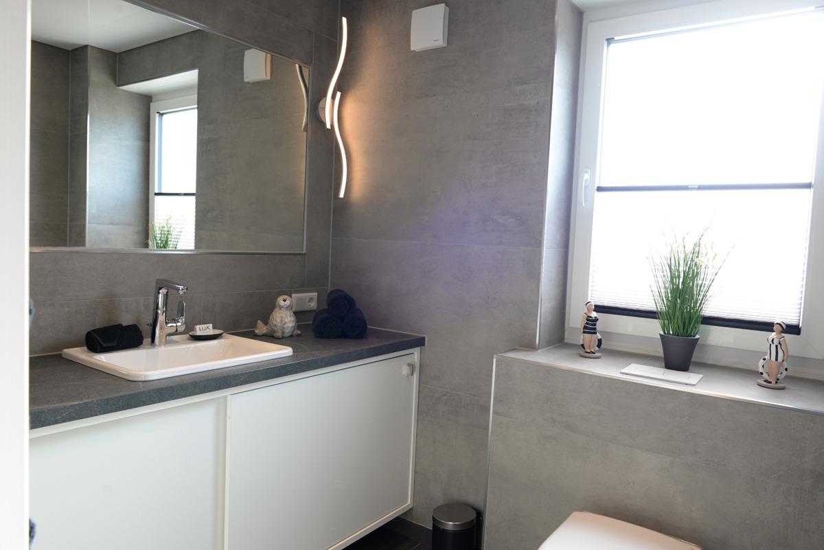 Das moderne Badezimmer mit Fenster verfügt über eine bodenebene Dusche, einem WC, eine Waschtischkombination mit großem Spiegel, Föhn usw.