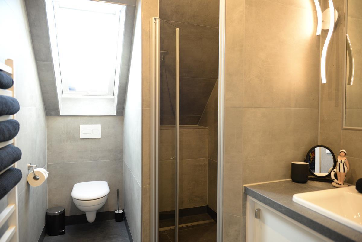 Das moderne Badezimmer mit Veluxfenster verfügt über eine bodenebene Dusche, einem WC, eine Waschtischkombination mit großem Spiegel, Föhn usw.