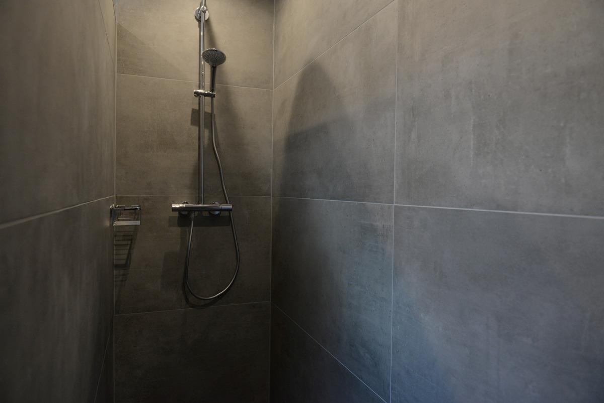 Das moderne Badezimmer mit Veluxfenster verfügt über eine bodenebene Dusche, einem WC, eine Waschtischkombination mit großem Spiegel, Föhn usw.