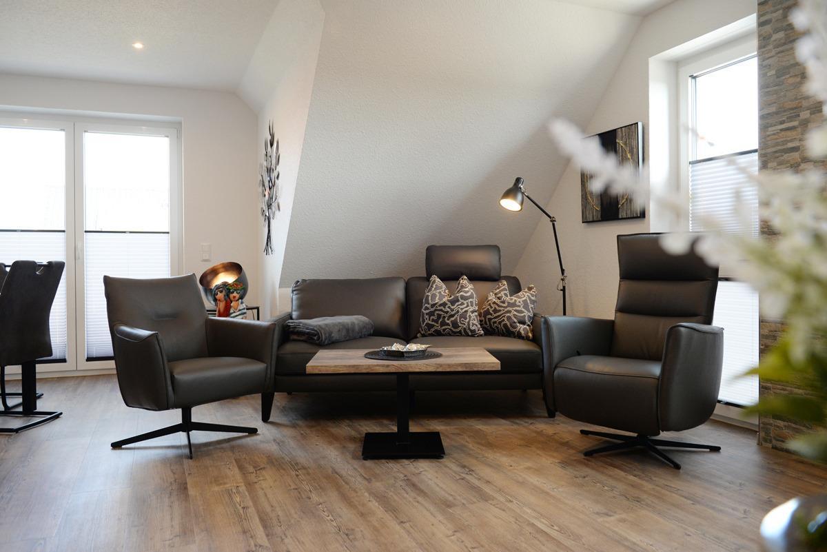 Die Ferienwohnung Deichdeck 3 OL für 2 Personen befindet sich im 1. OG eines neu erbauten Ferienhauses mit insgesamt 4 Ferienwohnungen in Norddeich. Die Wohnung liegt in einer zentralen und sackgassenähnlichen Lage. Das Wohn/Esszimmer ist mit einer gemütlichen Couch u. 2 Sessel, einem Flachbildschirm-Fernseher, einer Essgruppe und einer voll ausgestatteten Einbauküche eingerichtet. Von dort aus gelangen Sie auf einen Balkon, der mit Gartenmöbeln und einem Sonnenschirm ausgestattet ist. Dieses Plätzchen lädt Sie zum Sonnenbaden oder für den späteren Sonnenuntergang am Abend ein.