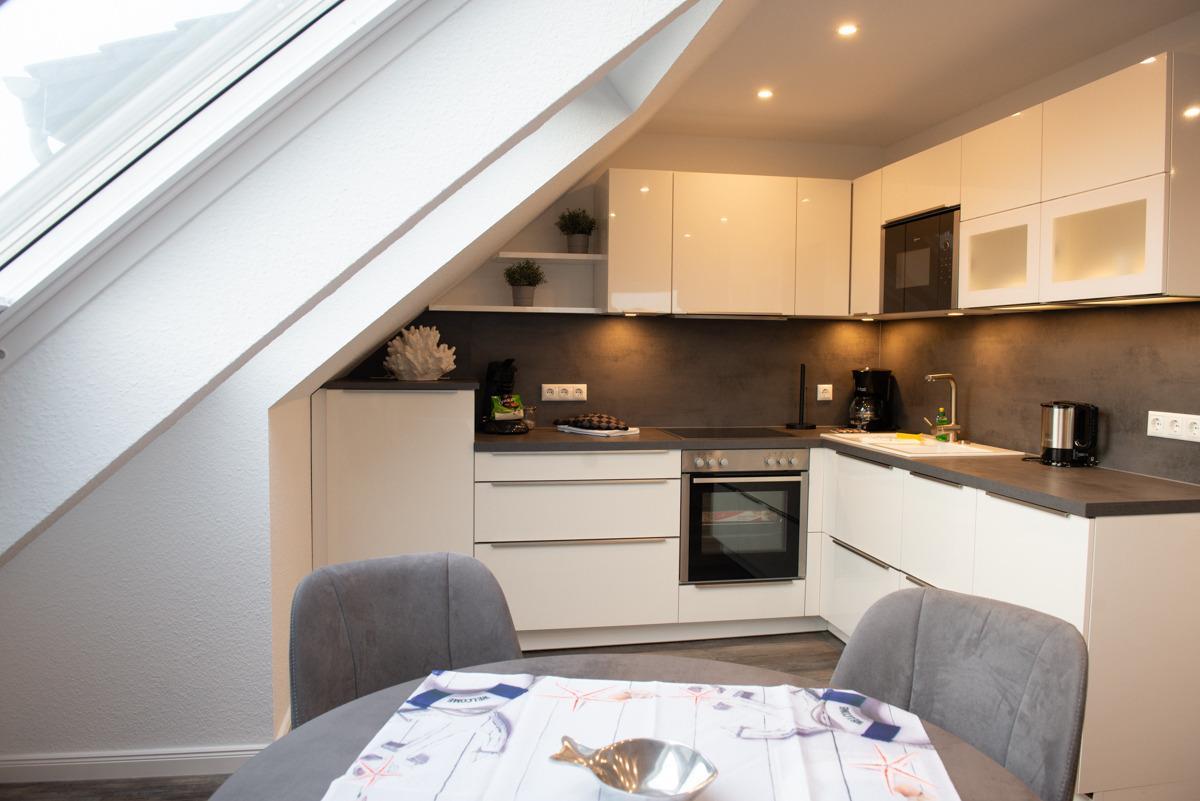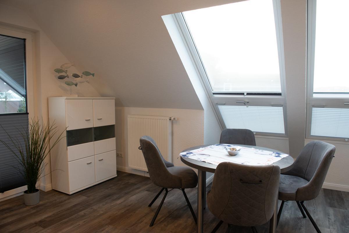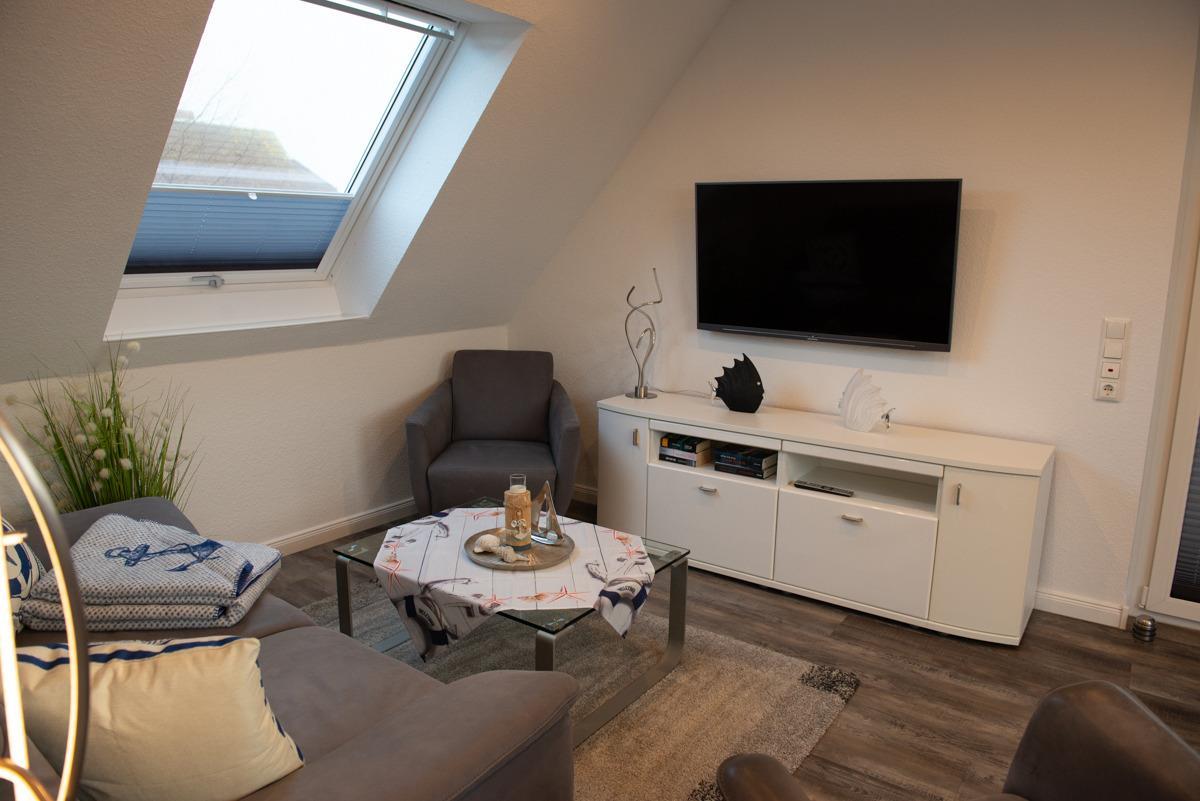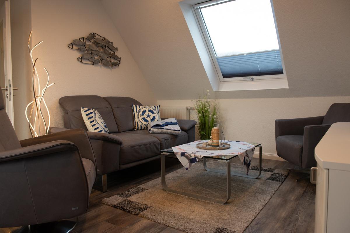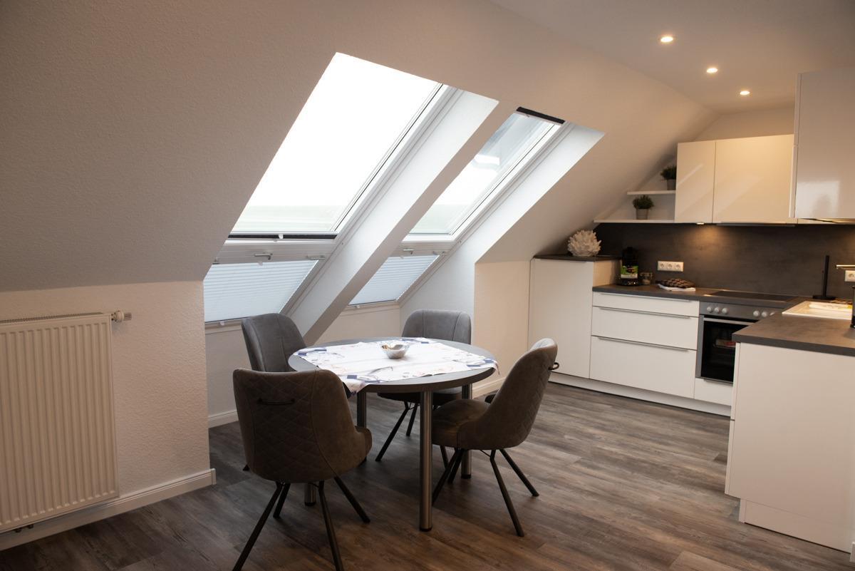 Die Wohnung liegt in einer Top-Lage mit Blick zum Deich. Das Wohn/Esszimmer ist mit einer gemütlichen Couch u. 2 Sessel, einem Flachbildschirm-Fernseher, einer Essgruppe und einer voll ausgestatteten Einbauküche eingerichtet.Von dort aus gelangen Sie auf eine überdachte Dachlounge und können den Sonnenuntergang geniesen, zusätzlich bieten 2 große Panorama-Veluxfenster einen direkten Blick auf den Deich und die Promenade.
