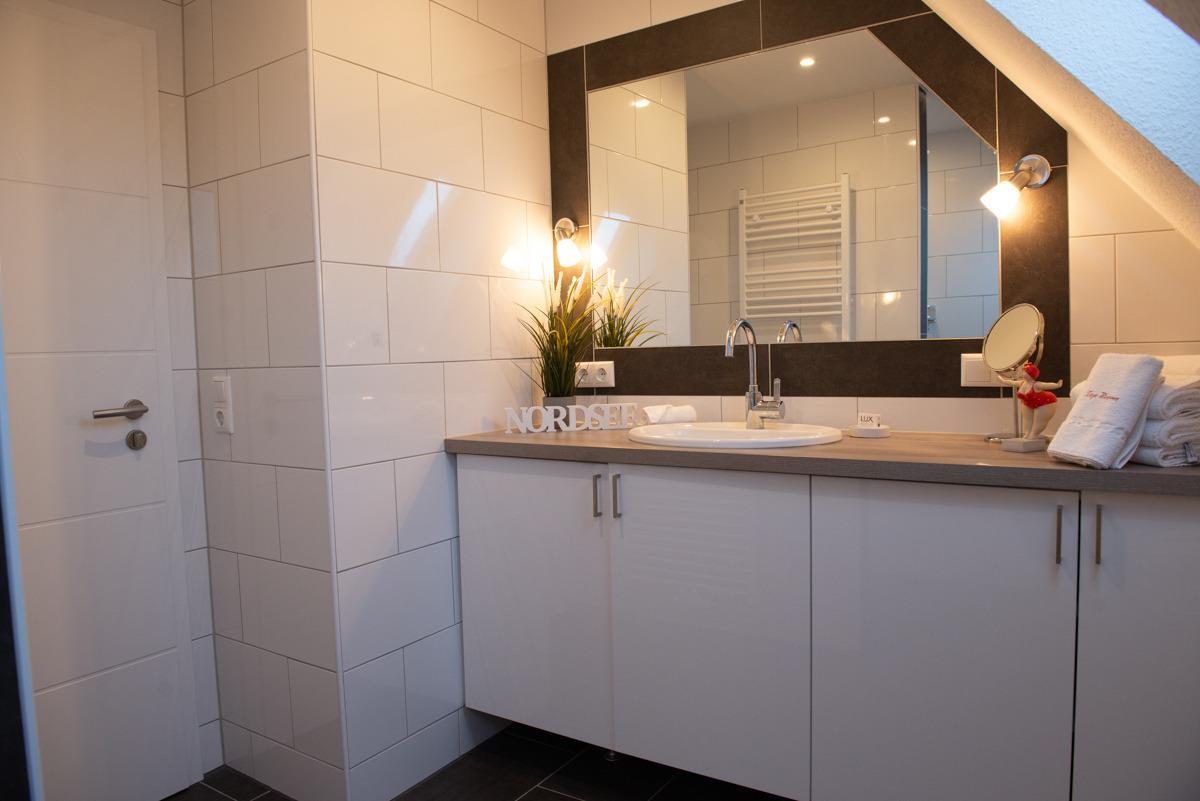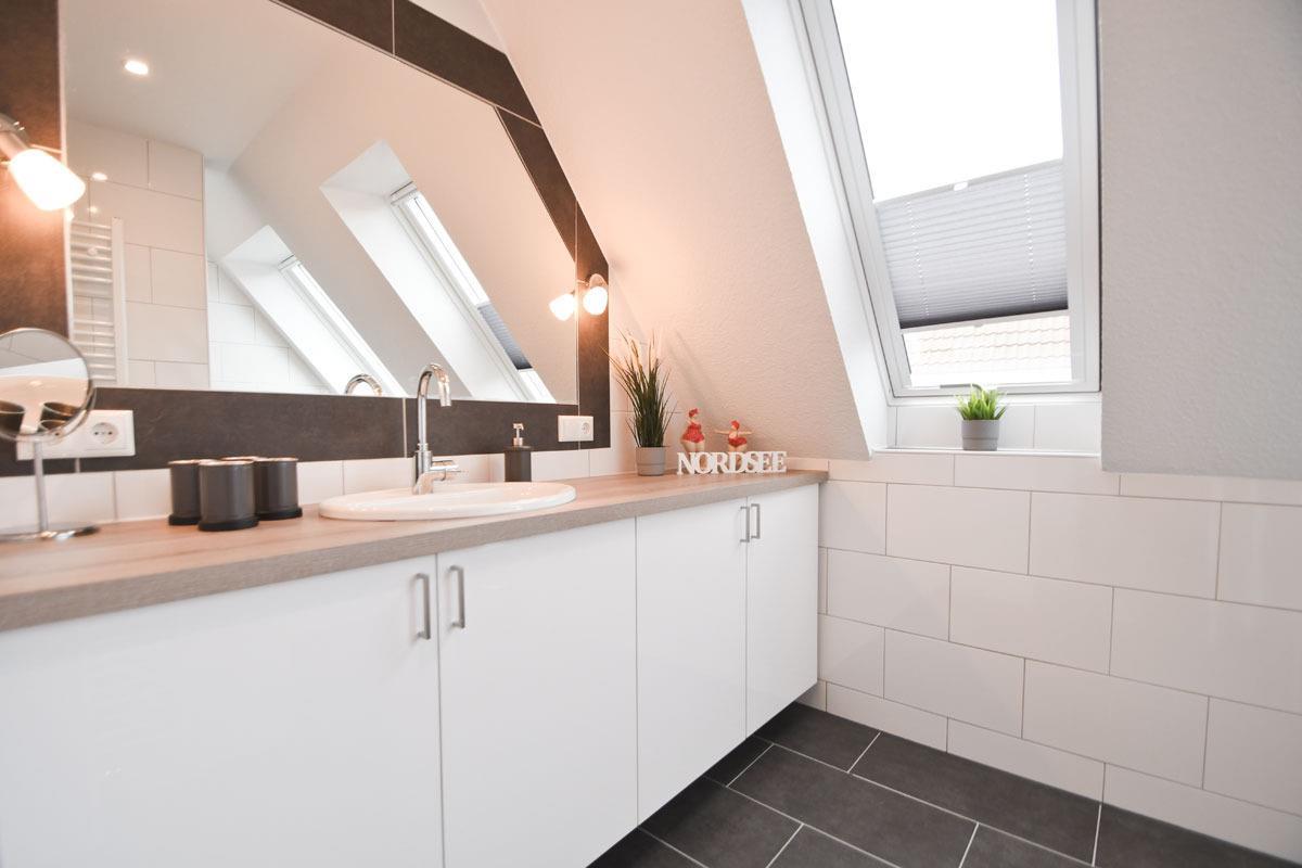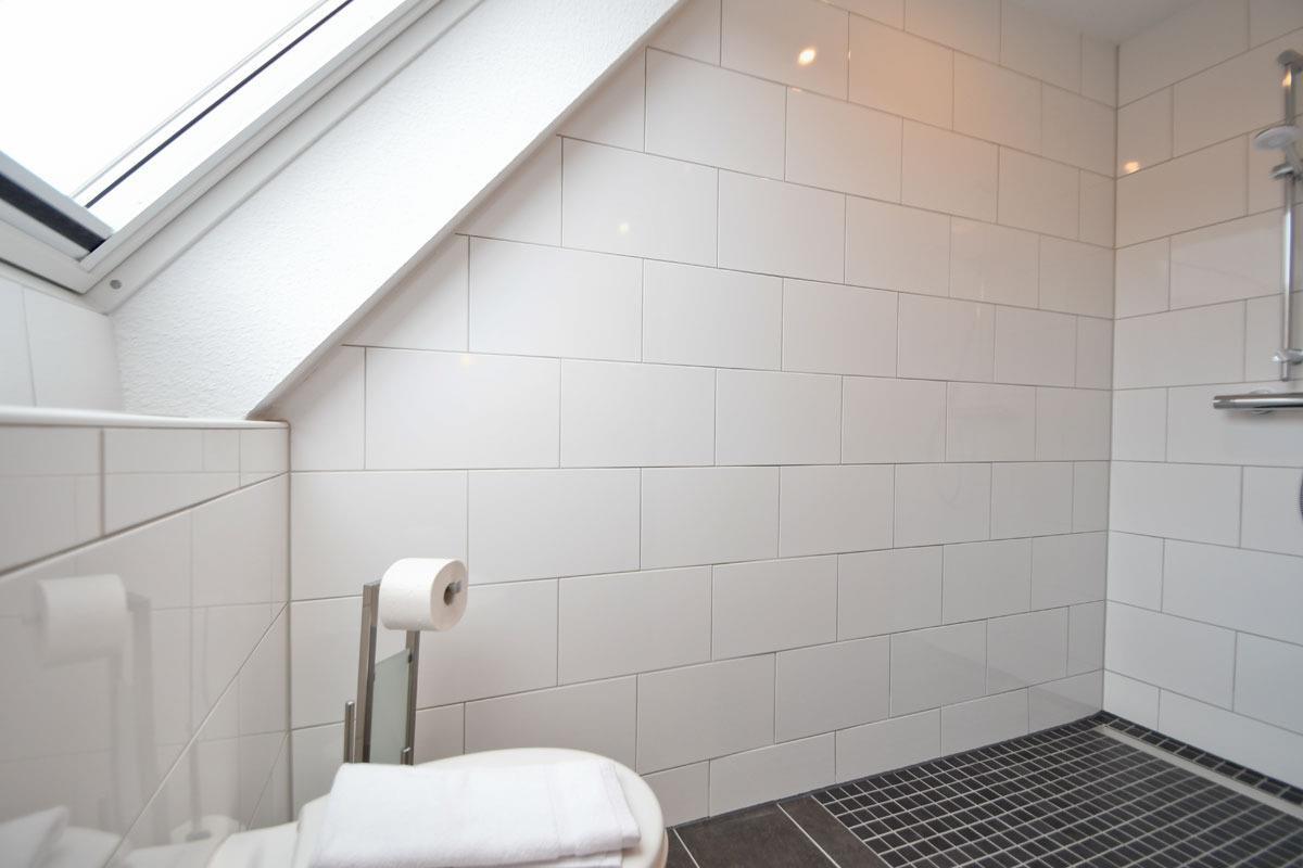 Das moderne Badezimmer mit Veluxfenster verfügt über eine bodenebene Dusche, einem WC, eine Waschtischkombination mit großem Spiegel,Föhn usw.