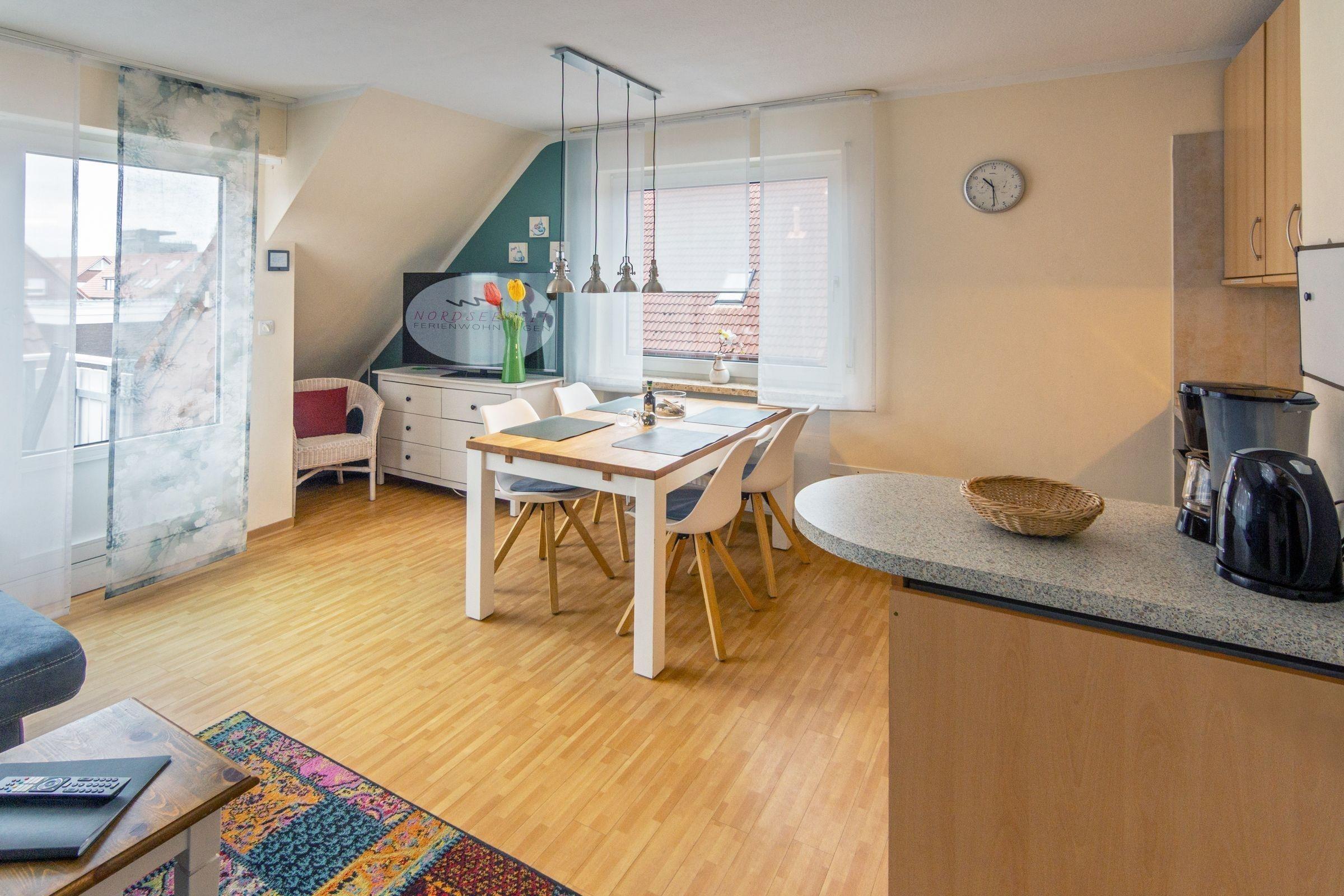 Die Ferienwohnung bietet Platz für bis zu 4 Personen und verfügt über WLAN, eine Küchenzeile und einen Balkon. Die Schlüsselübergabe erfolgt im Büro in Norden. Bettwäsche und Handtücher sind optional erhältlich. Haustiere: Hunde erlaubt, Katzen nicht.