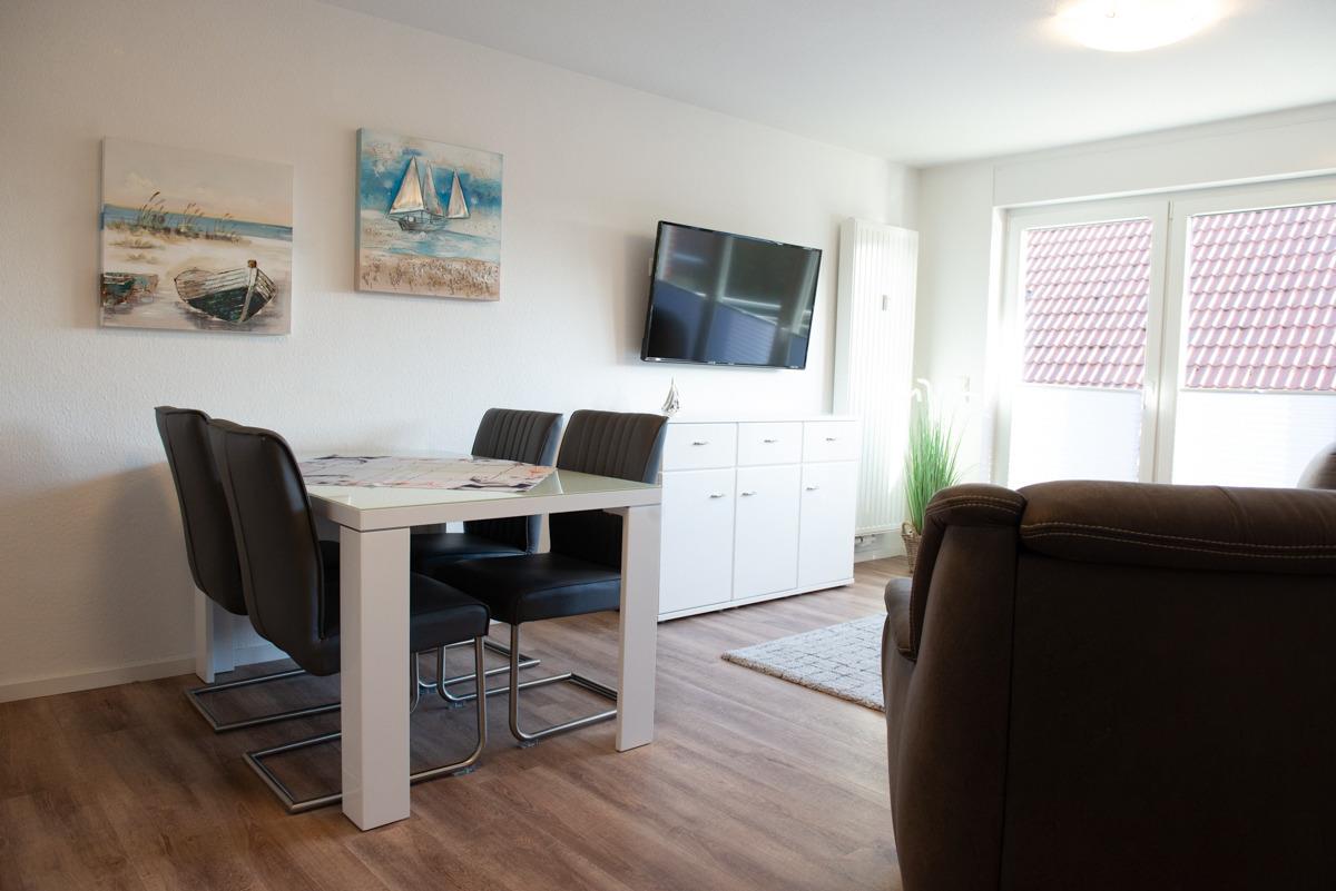 Wohn/Esszimmer mit Einbauküche, gemütlicher Garnitur sowie Esstisch und Stühle* Fernseher