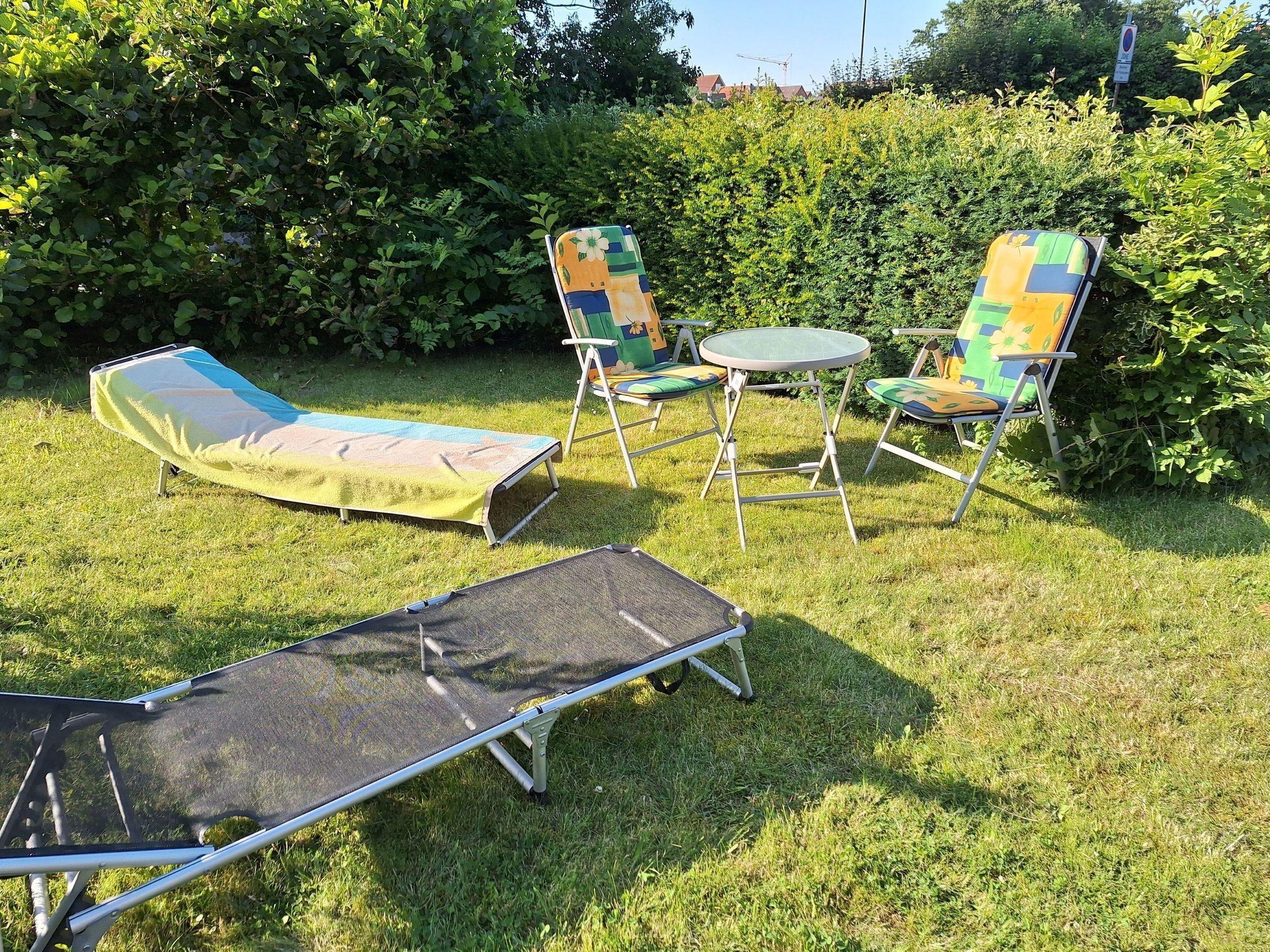 Die Ferienwohnung in Norddeich bietet Gästen einen einladenden Außenbereich zur Nutzung. Der eigene Garten vor dem Haus ist mit Gartenstühlen und Sonnenliegen ausgestattet, die zum Entspannen und Genießen der frischen Nordsee-Luft einladen. Hier können Urlauber eine ruhige Zeit verbringen und sich nach Strandbesuchen erholen.