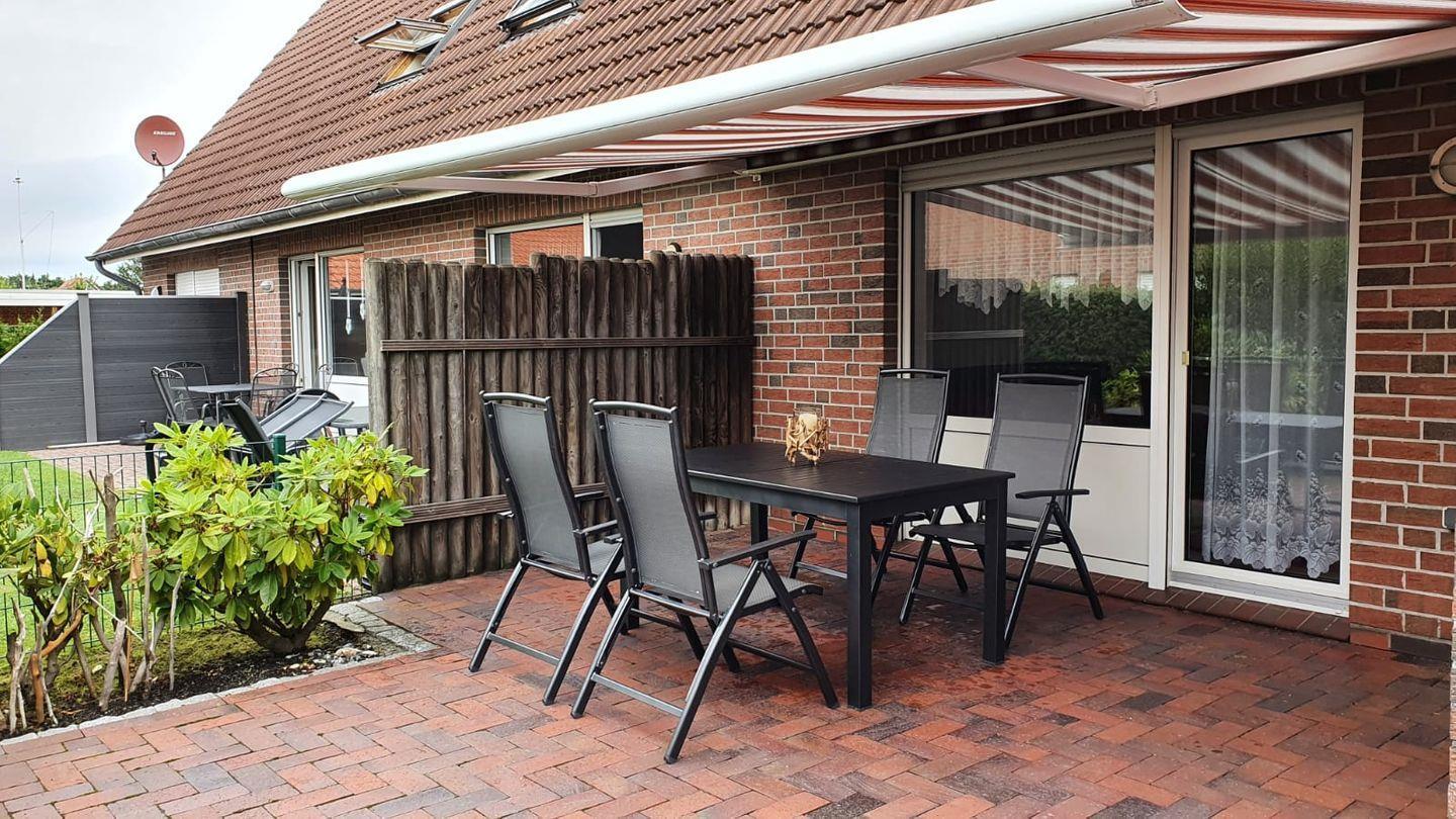 Gemütliches Reihenhaus Huus Leni in Norddeich mit sonniger Terrasse und Nähe zum Strand für einen entspannten Familienurlaub.