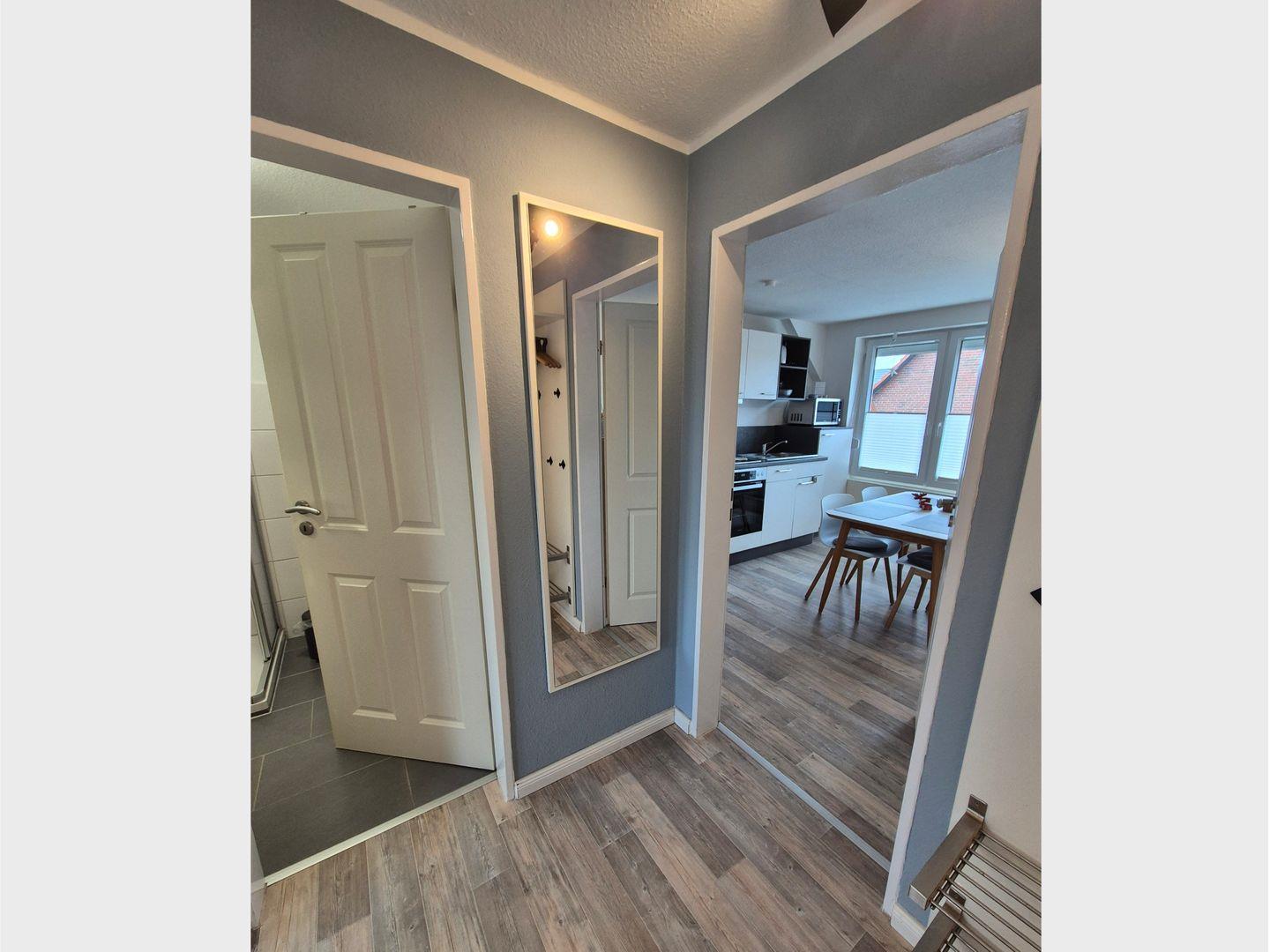 Im Inneren stehen Ihnen im 1 OG. ein kombinierter Wohn- und Essbereich mit toller hochwertiger Küchenzeile zur Verfügung. Eine Diele, ein modernes Bad mit Dusche, sowie ein gemütliches Schlafzimmer. Ein weiteres Schlafzimmer finden Sie im ausgebauten Spitzboden, dieses erreichen Sie über eine offener Wendeltreppe aus dem Wohn-'/Esszimmer.